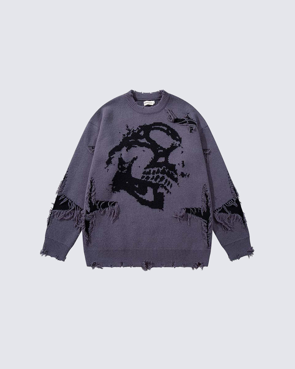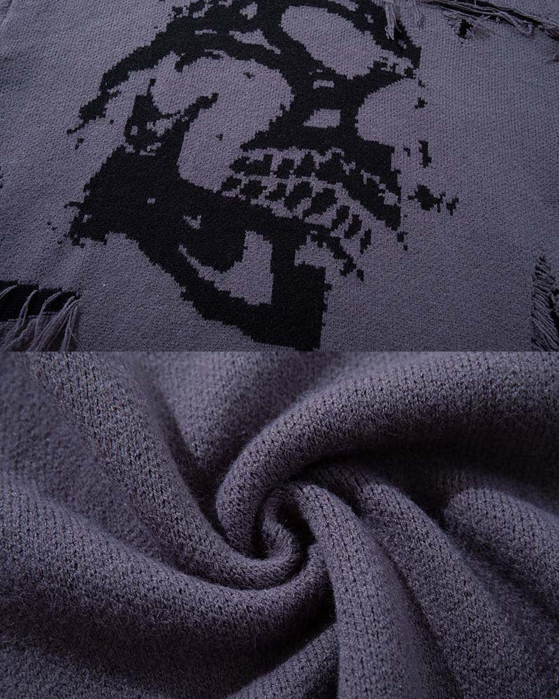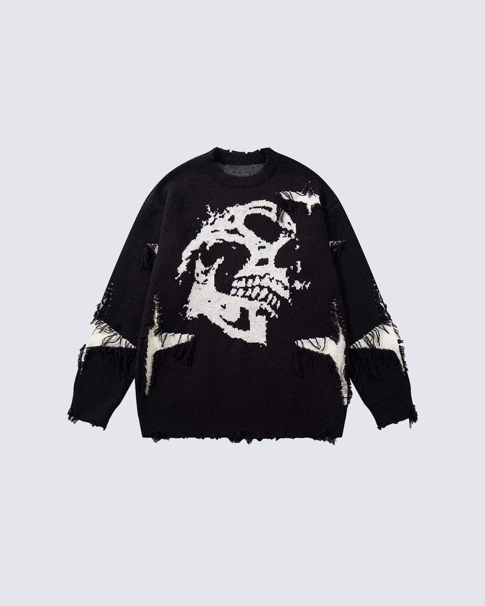 Skull jacquard knit pattern, raw-edge hem design, crewneck style, ribbed cuffs, loose oversized fit, vintage-inspired distressed details, edgy American retro street aesthetic