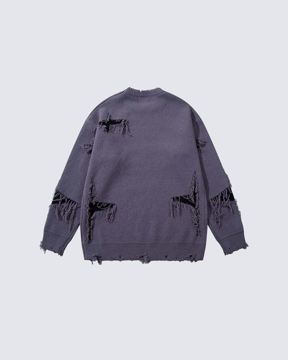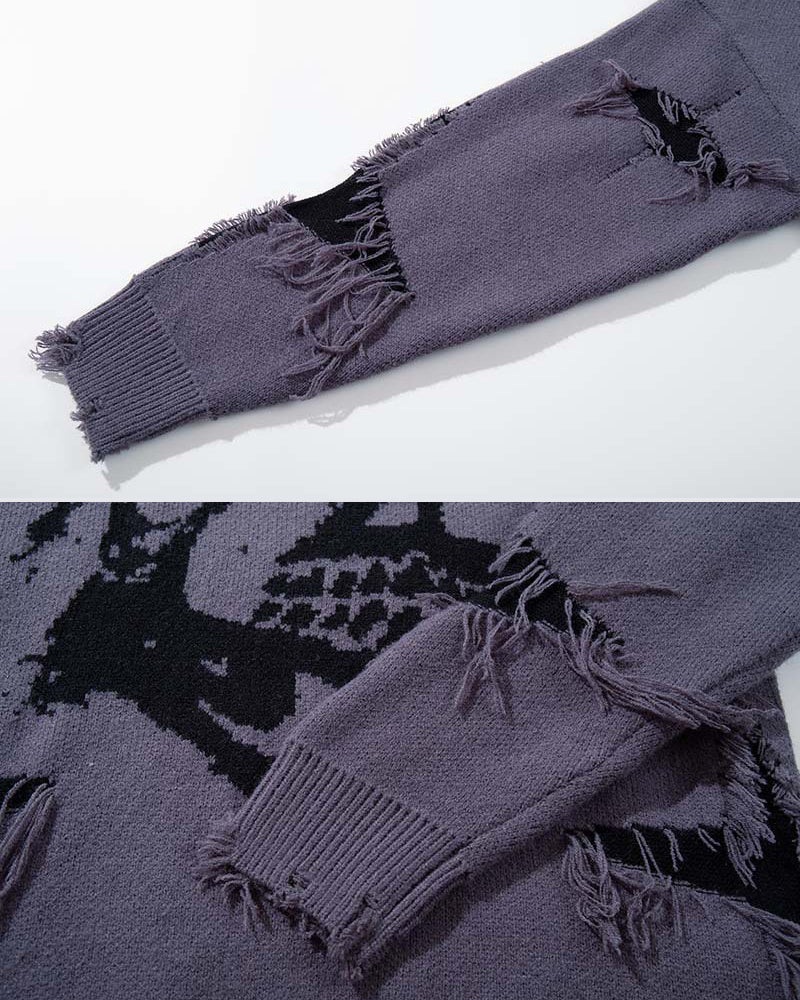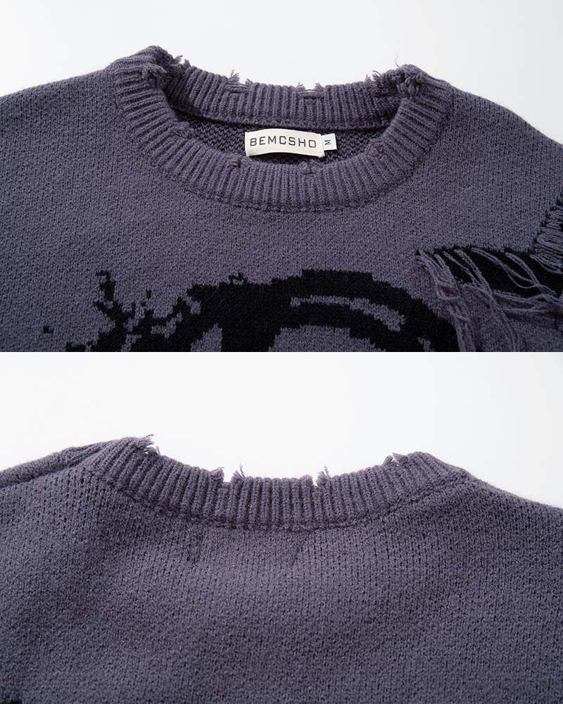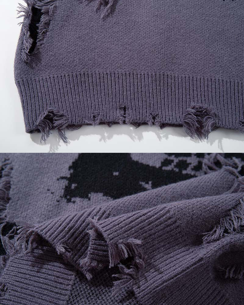 Skull jacquard knit pattern, raw-edge hem design, crewneck style, ribbed cuffs, loose oversized fit, vintage-inspired distressed details, edgy American retro street aesthetic