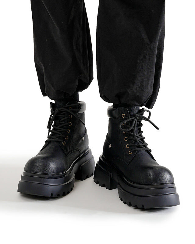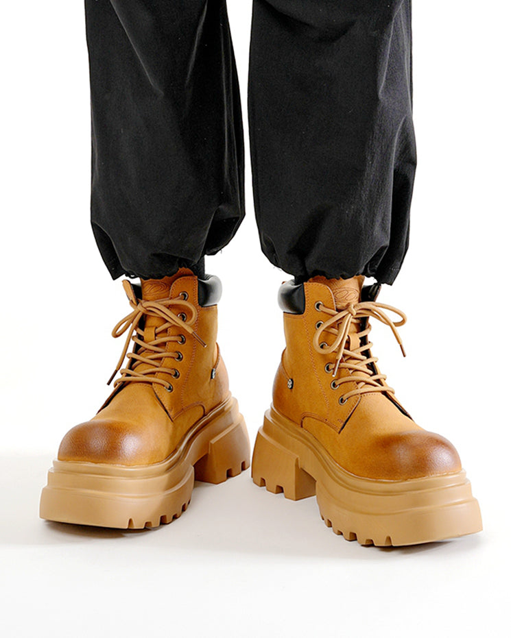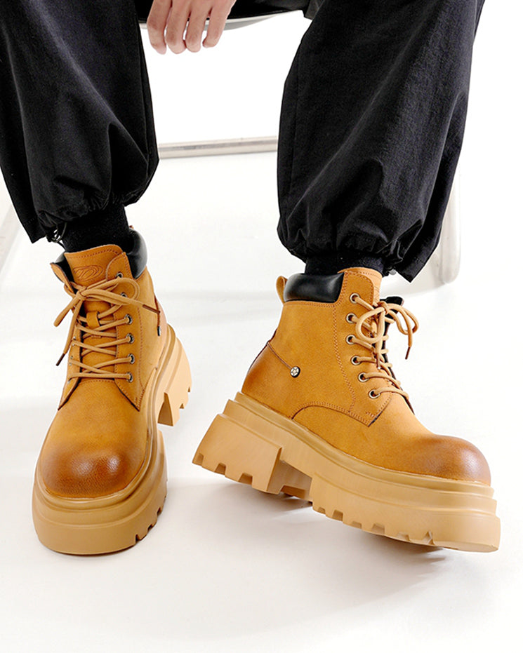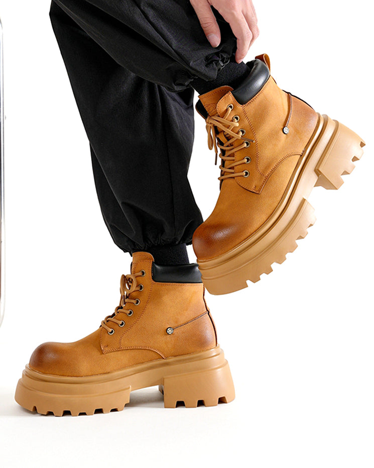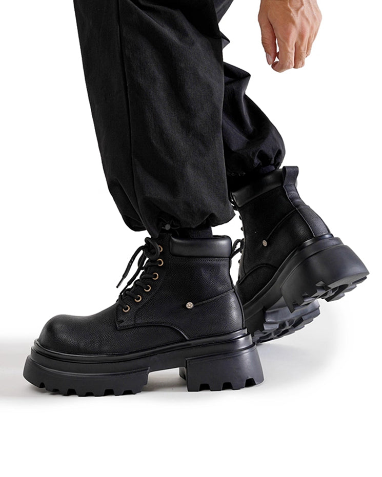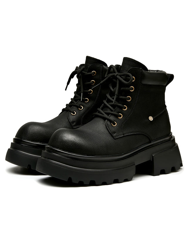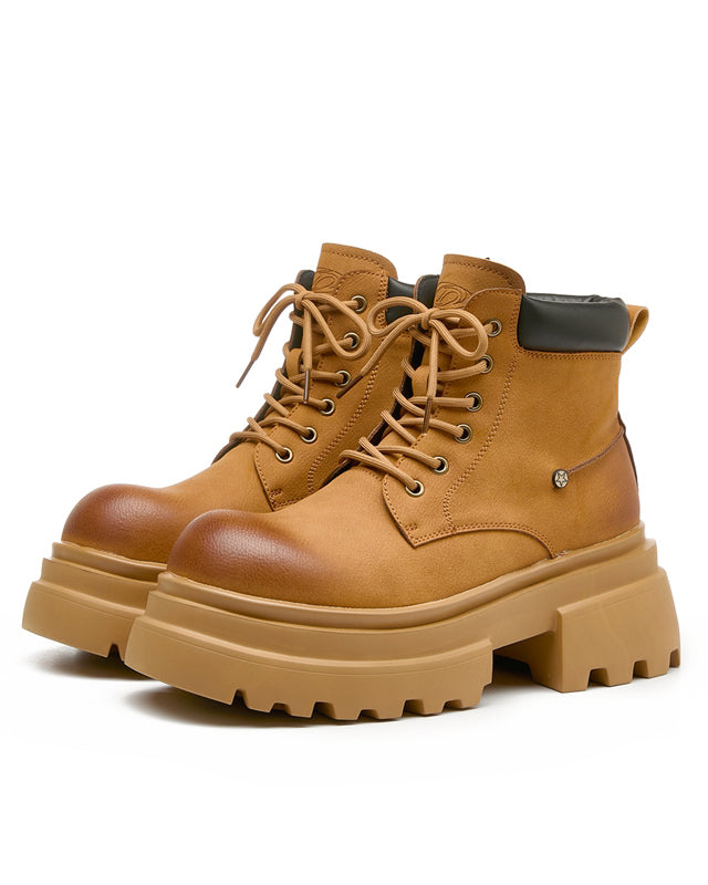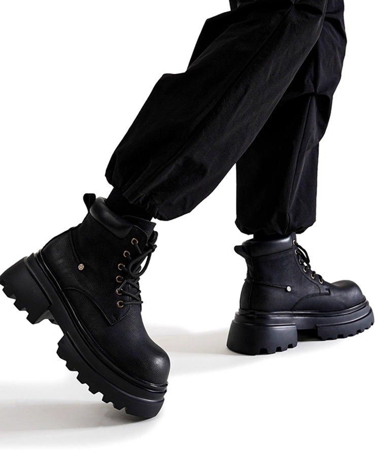Chunky platform sole, lace-up front, metal eyelets, padded ankle collar, rugged tread pattern, classic workwear silhouette