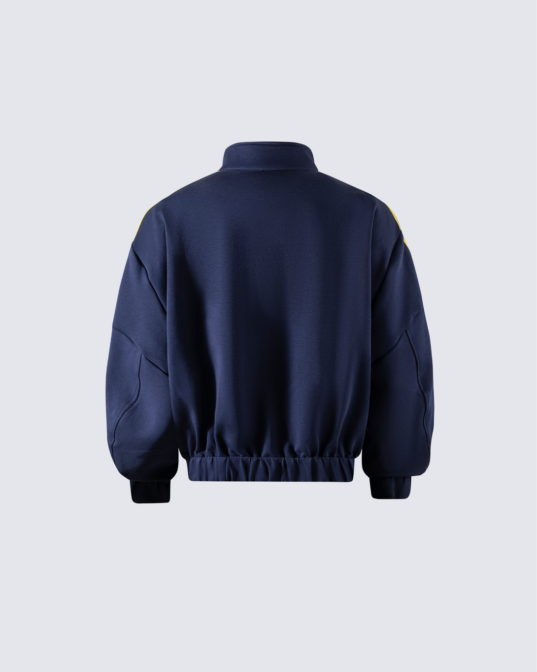 Design Elements: Stand collar design, contrast multi-stripe sleeves, front zip closure, elasticated hem and cuffs, relaxed sporty silhouette