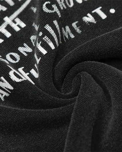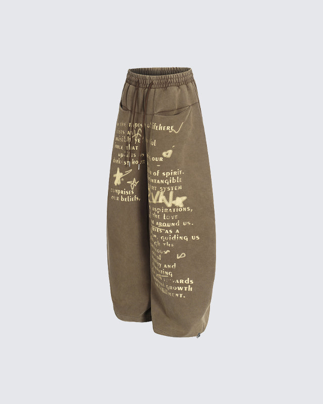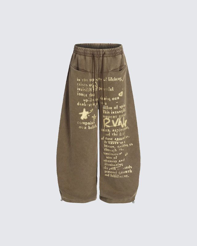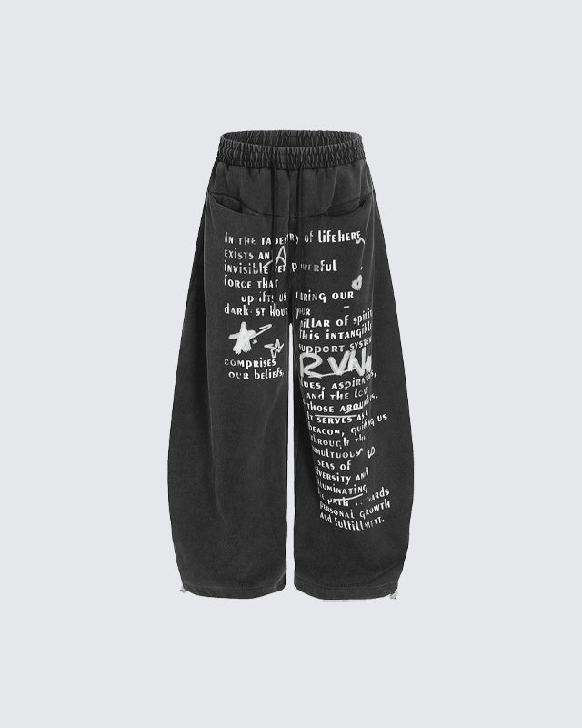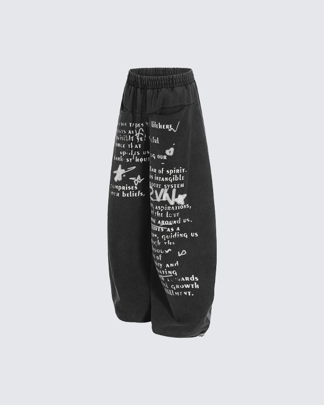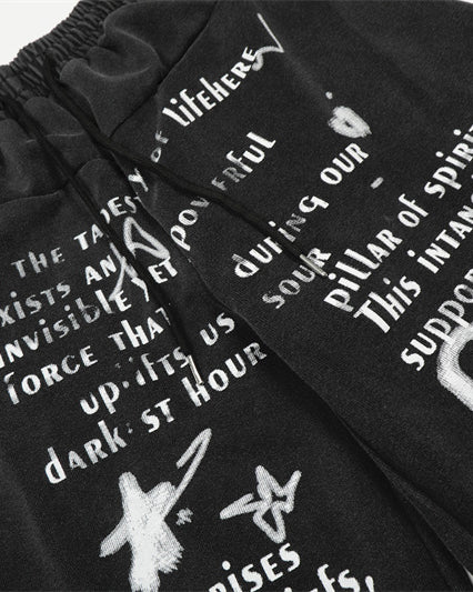 Loose silhouette with elastic waistband and drawstring for comfort, artistic vintage-style letter prints for a unique streetwear look, and adjustable foot mouth.