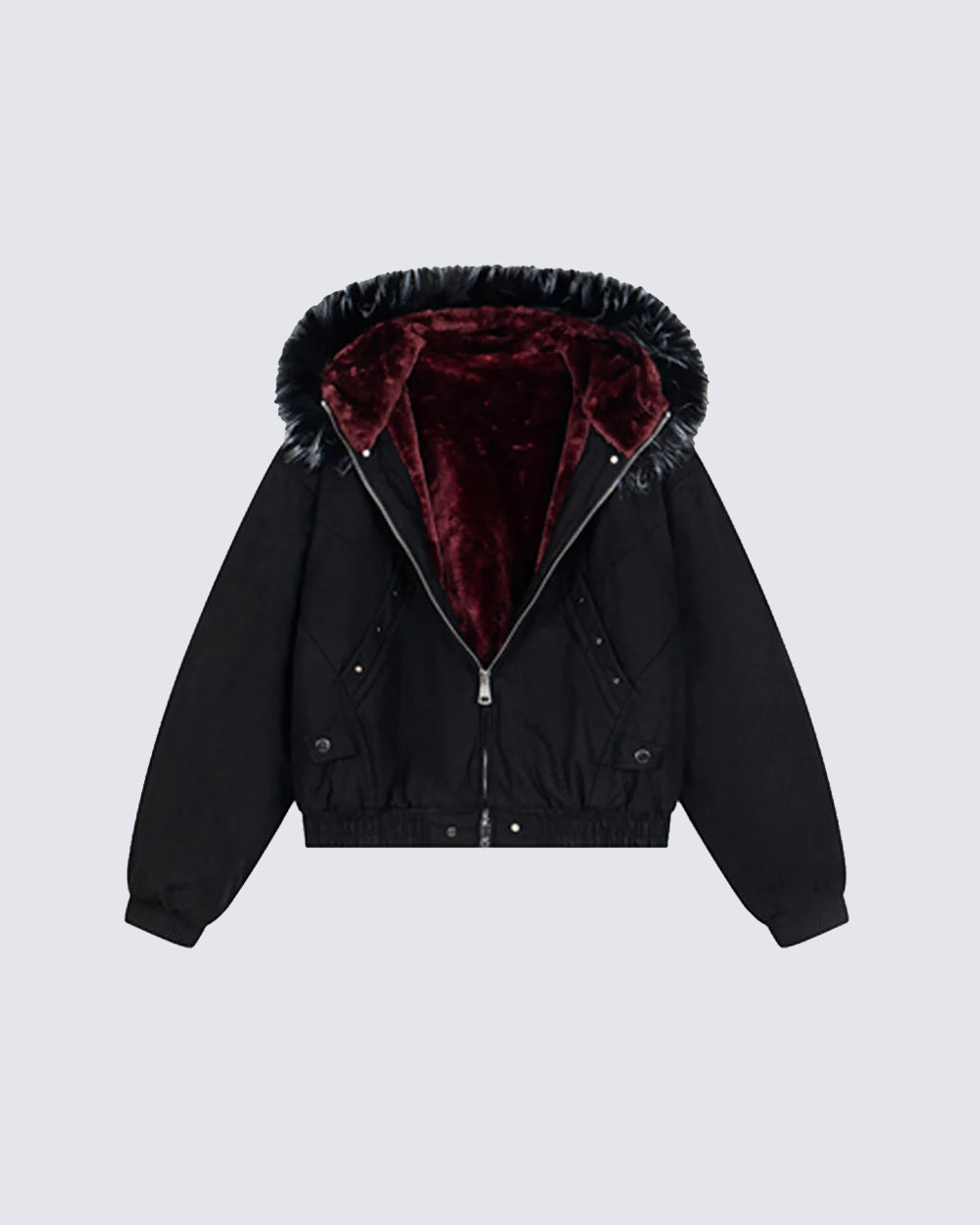 Hooded design with faux fur trim, soft plush inner lining, front zipper closure, adjustable drawstrings, elastic cuffs and hem, front flap pockets, relaxed fit for warmth and comfort