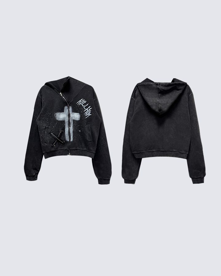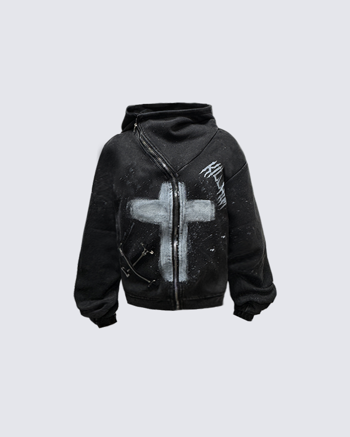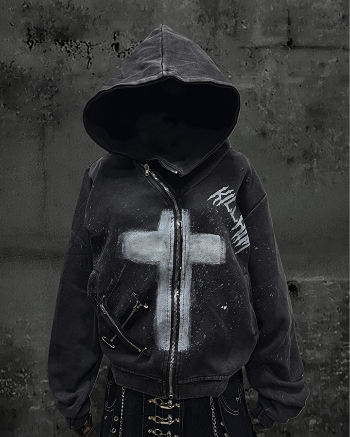 Design Elements: Hand-painted cross print, asymmetric zipper closure, distressed wash texture, metal buckle straps, loose fit silhouette