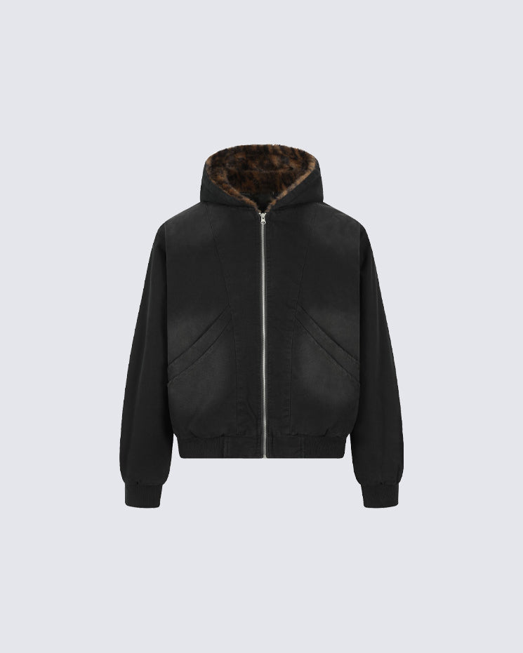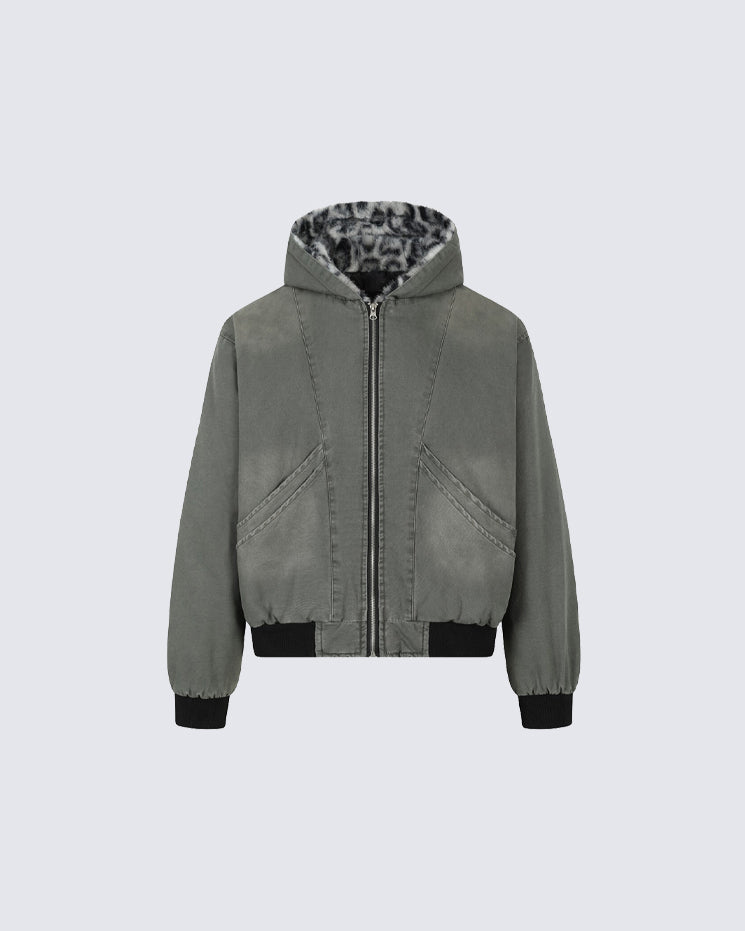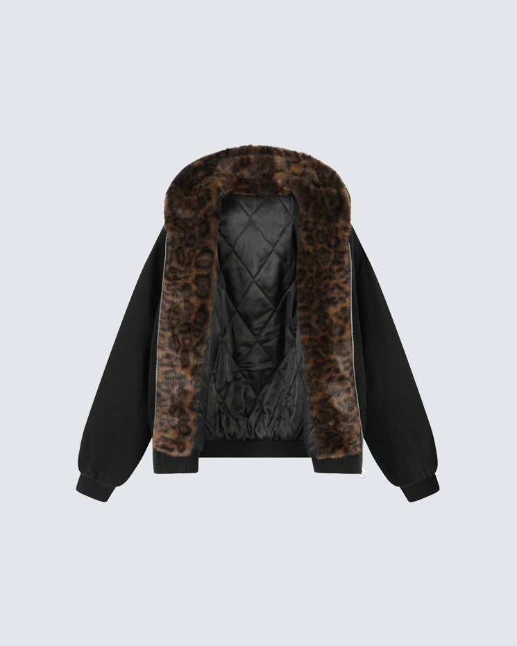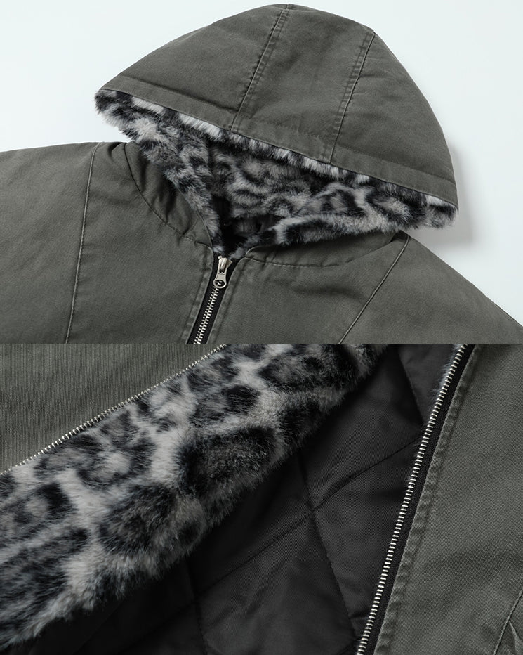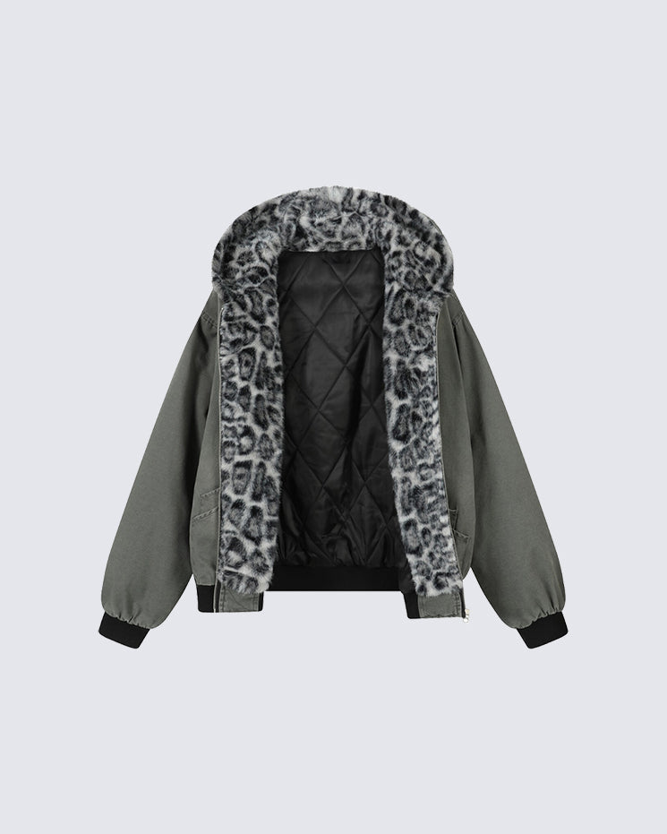 Faux fur leopard print lining, quilted inner layer, full zip front, ribbed cuffs and hem, oversized hood, and loose bomber silhouette.