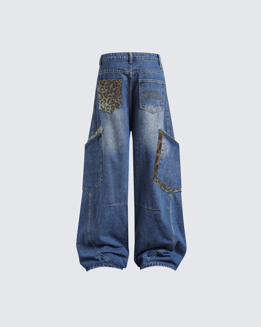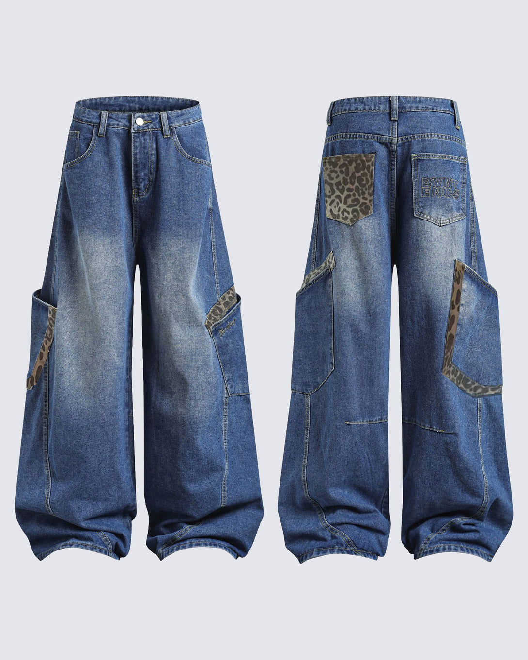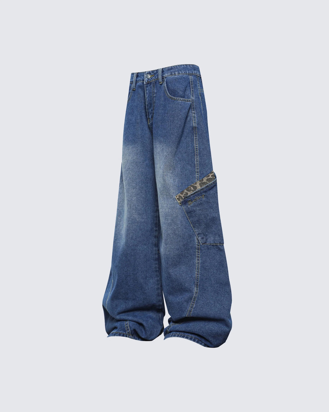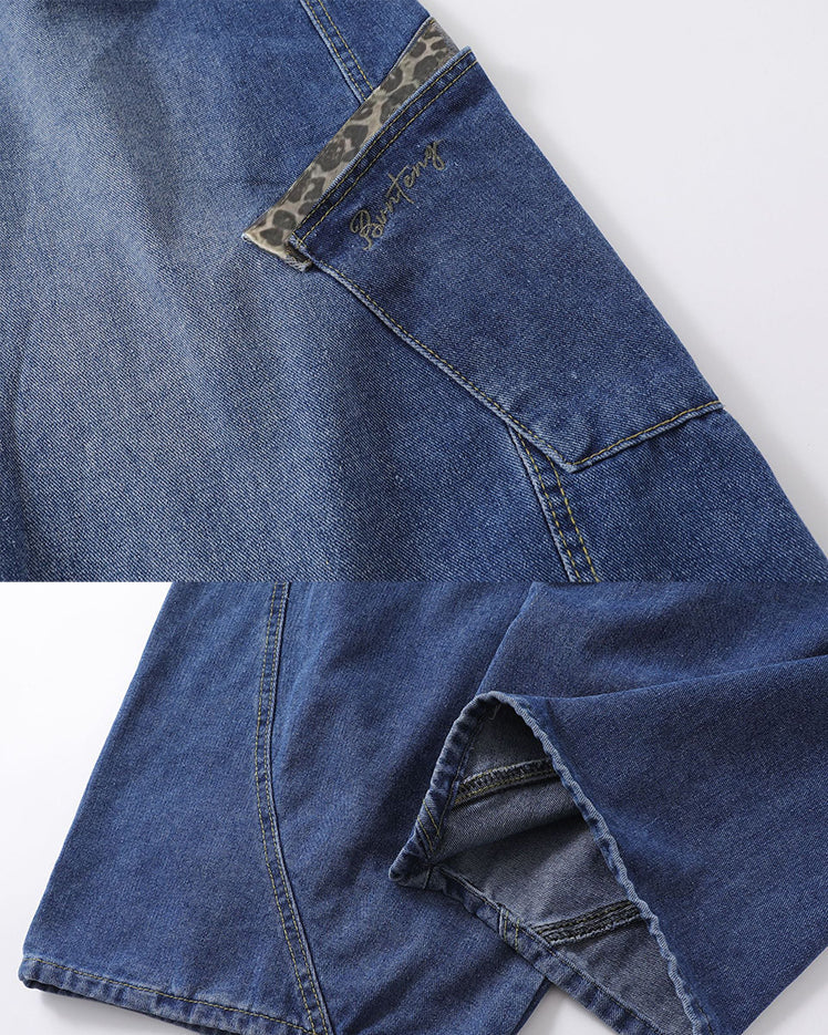 These unique oversized denim cargo pants feature a relaxed fit with large pockets for added utility and style. Distressed detailing adds a vintage look, while the cuffed hem ensures a comfortable and trendy finish.