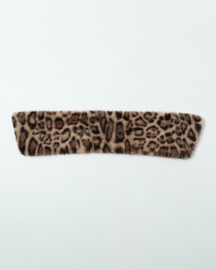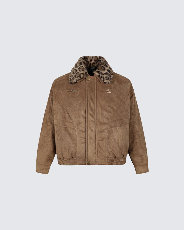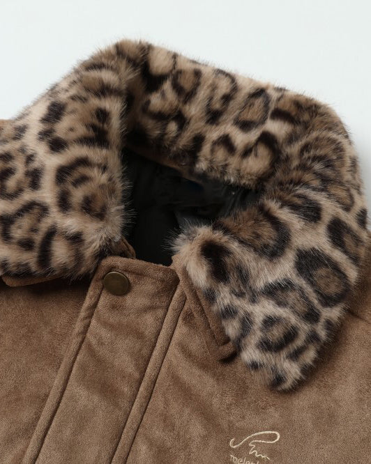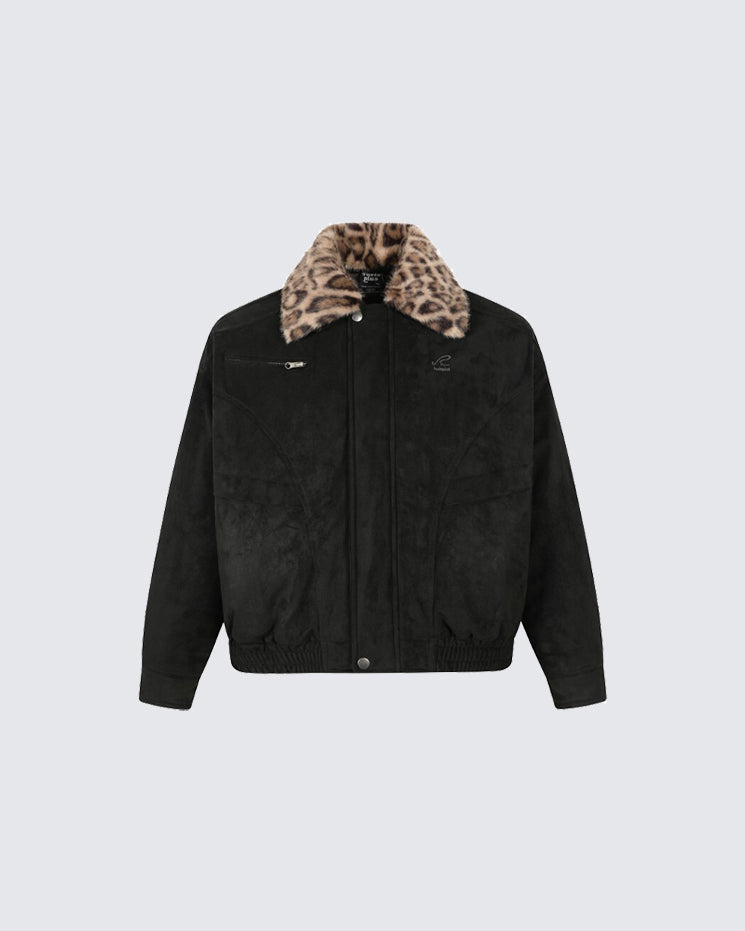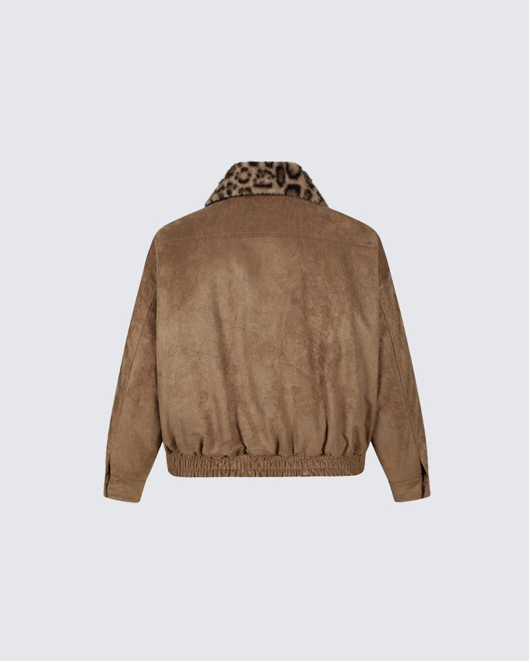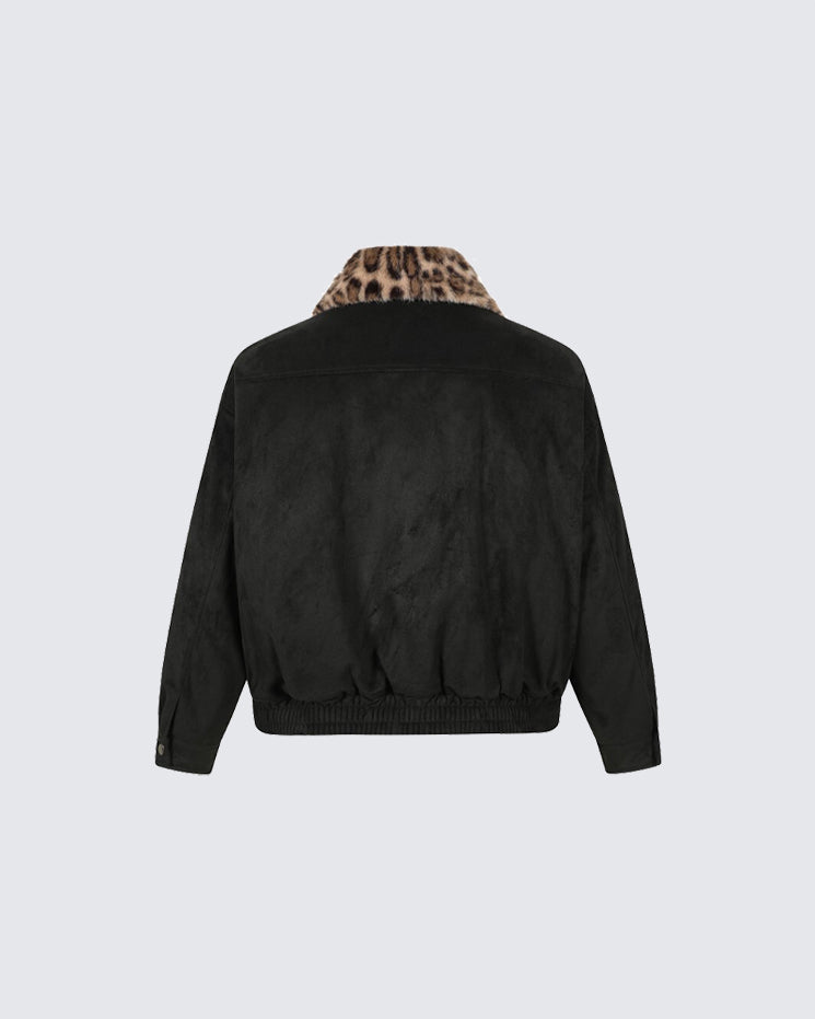 Leopard print faux fur collar, suede-textured finish, front zip with button closure, elastic hem, structured silhouette, retro American style