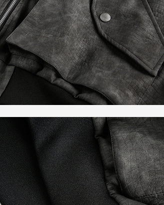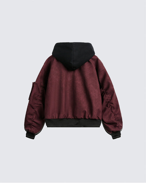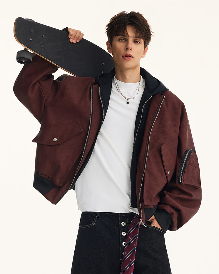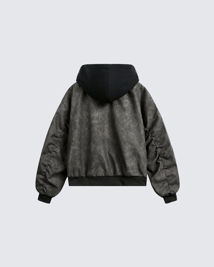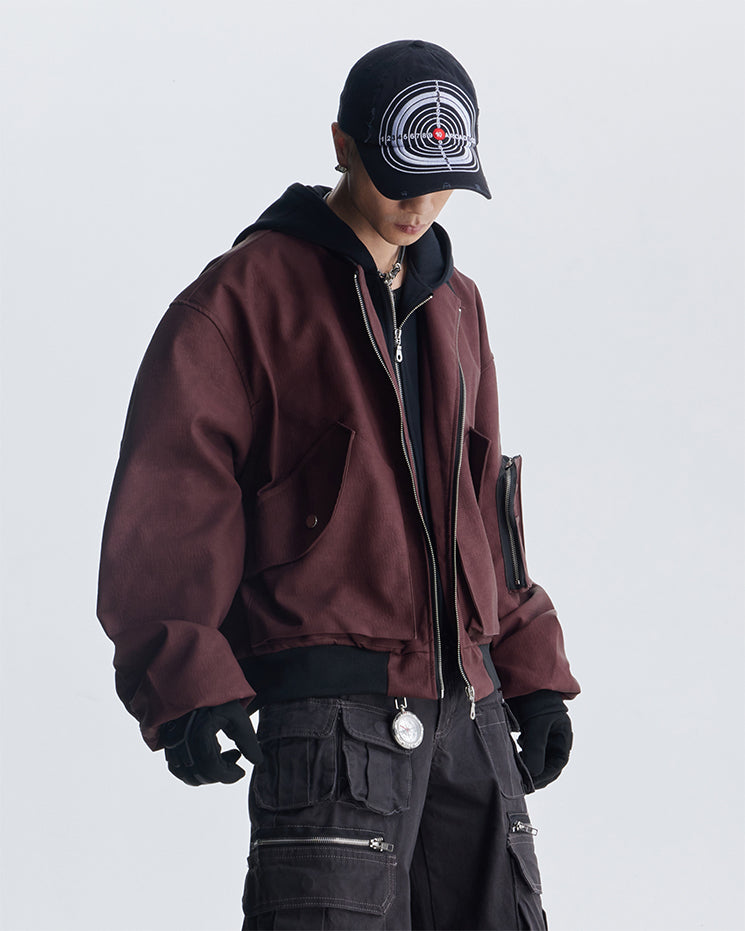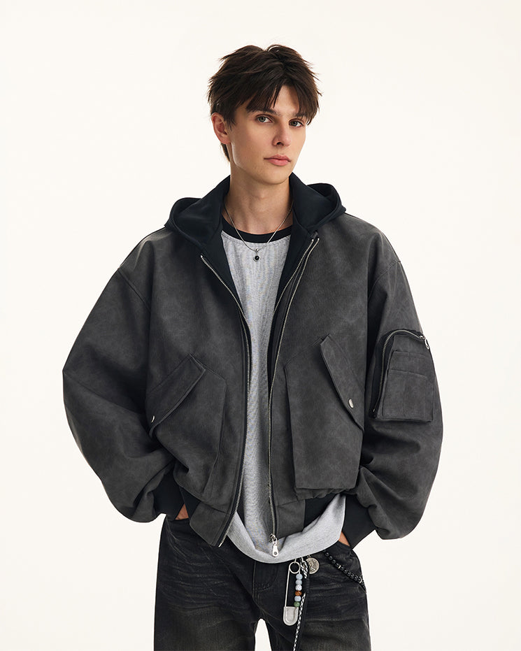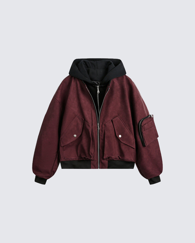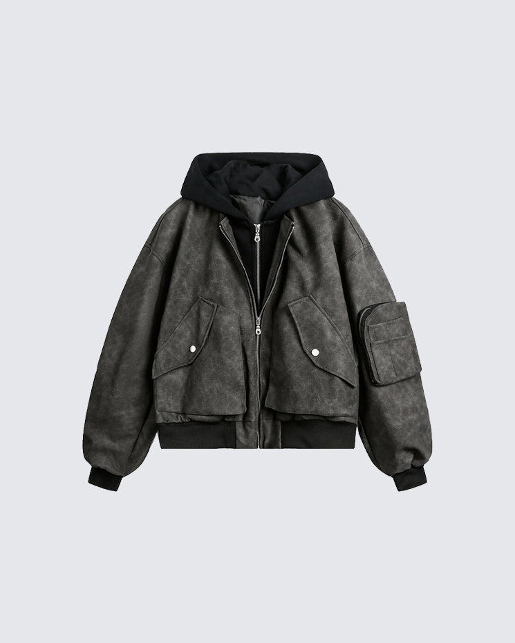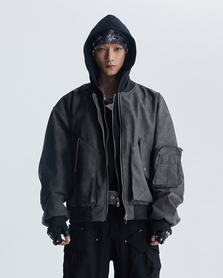 Layered faux two-piece hood design, oversized fit, large flap pockets, sleeve utility pocket, front zipper closure