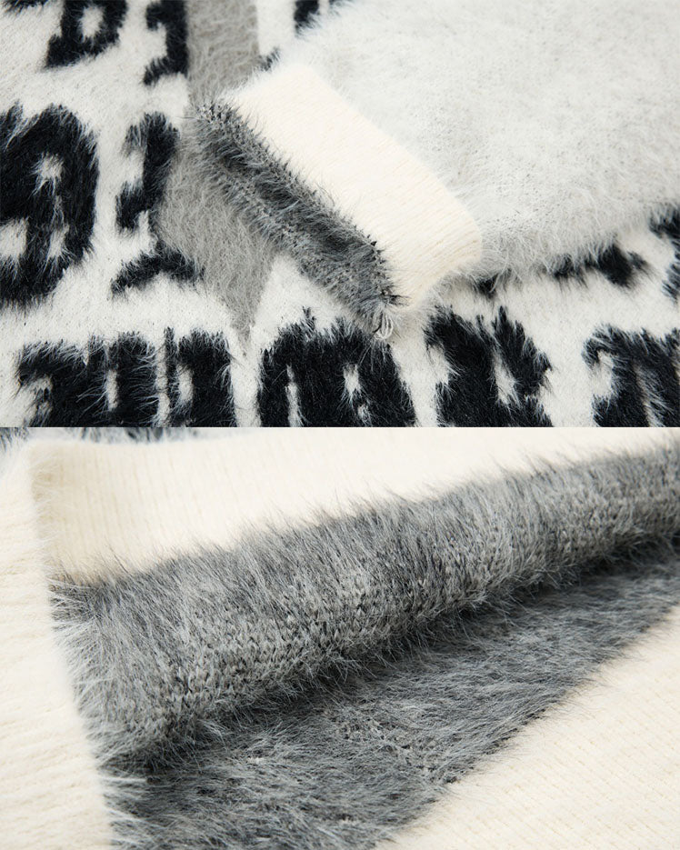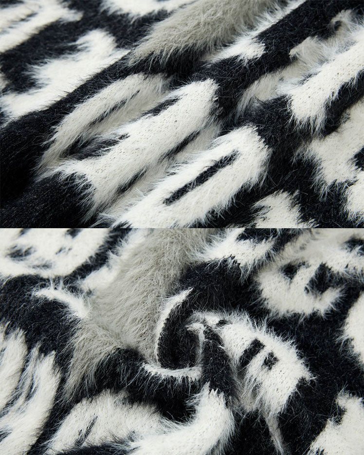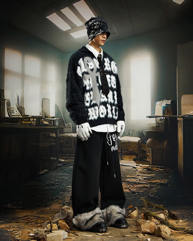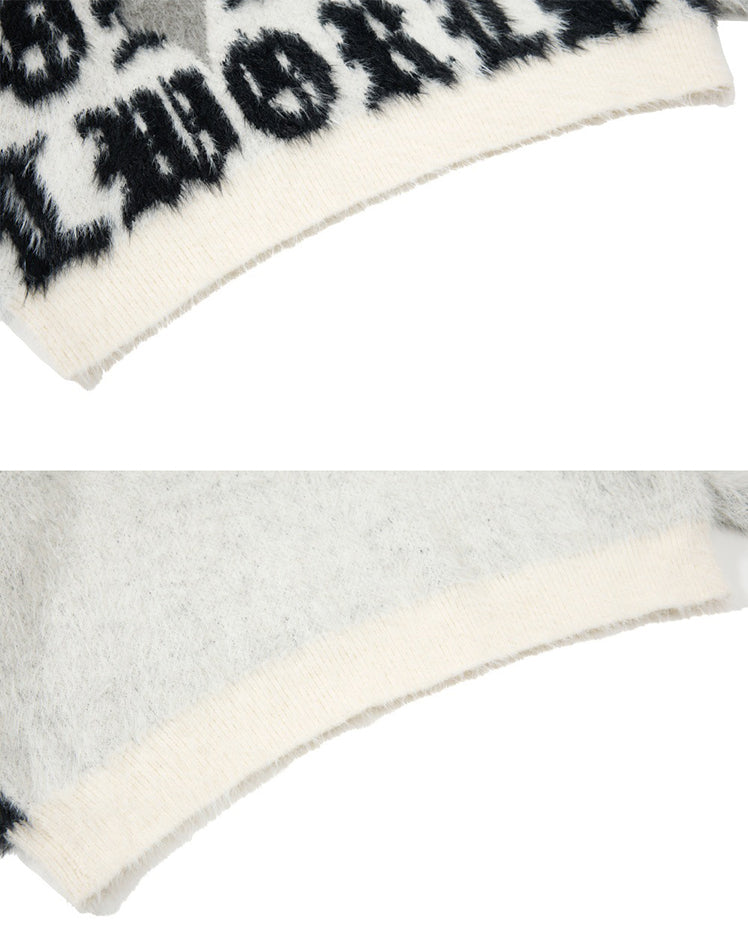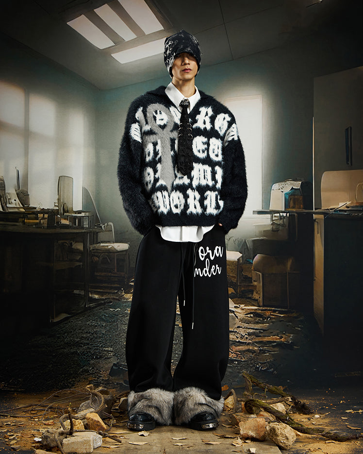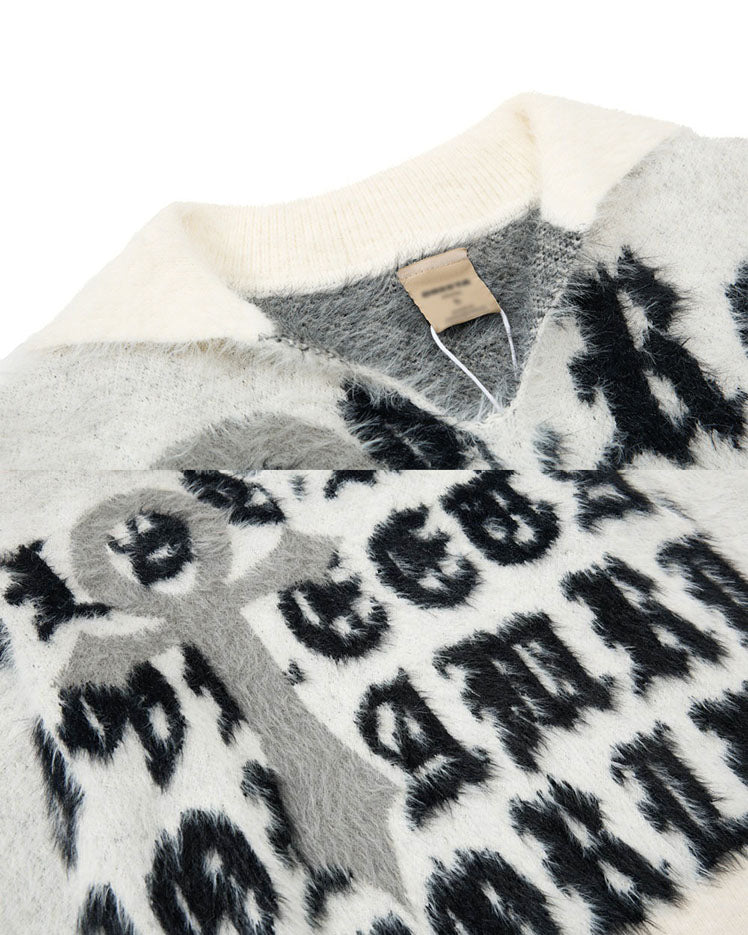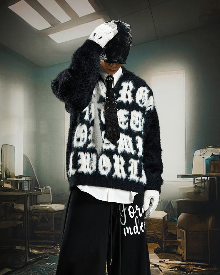 Sanskrit-style gothic letter jacquard pattern, lapel collar, long sleeves, relaxed fit, retro knit texture
