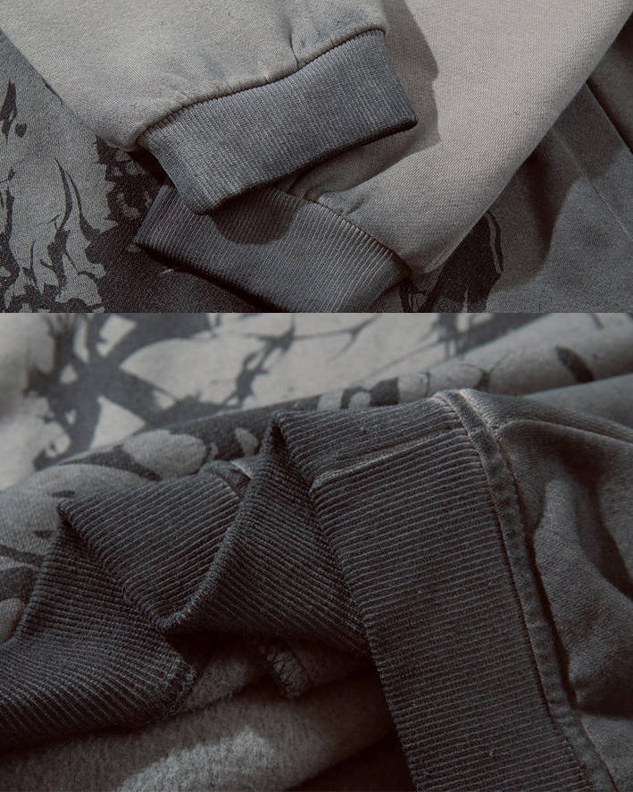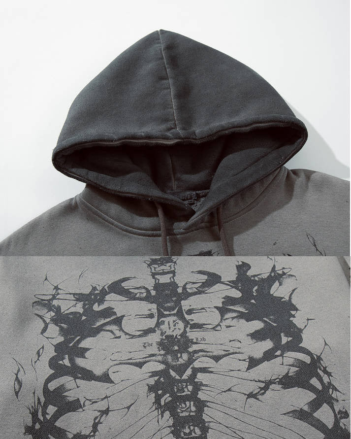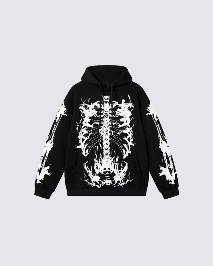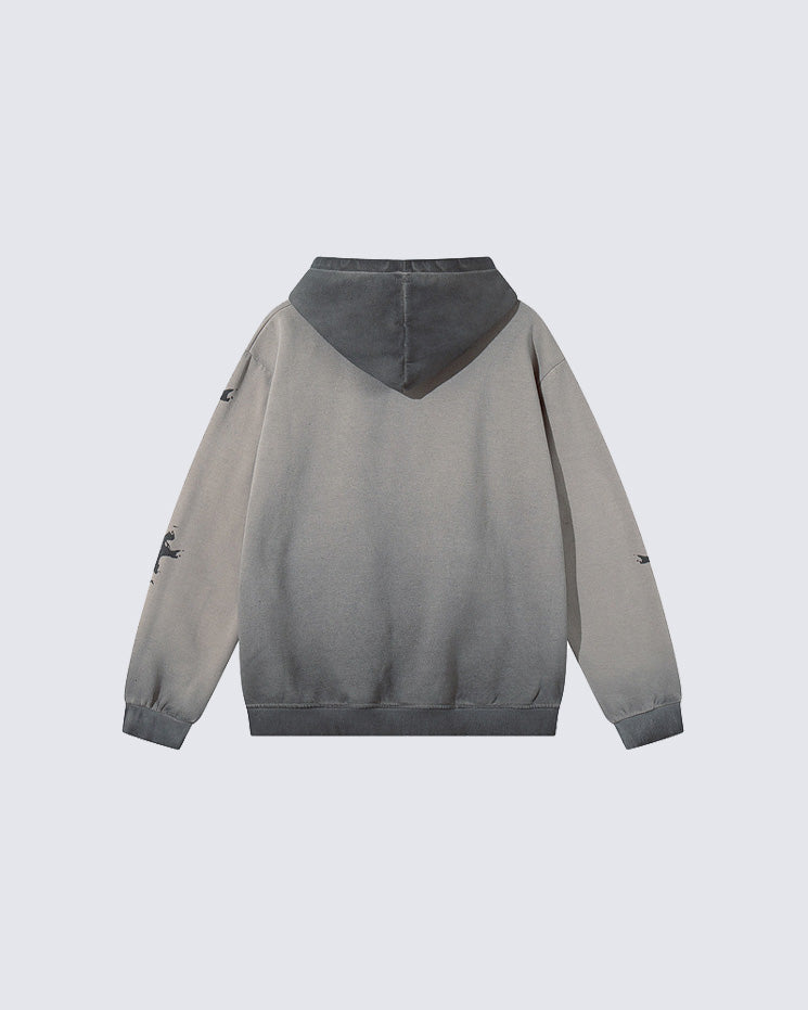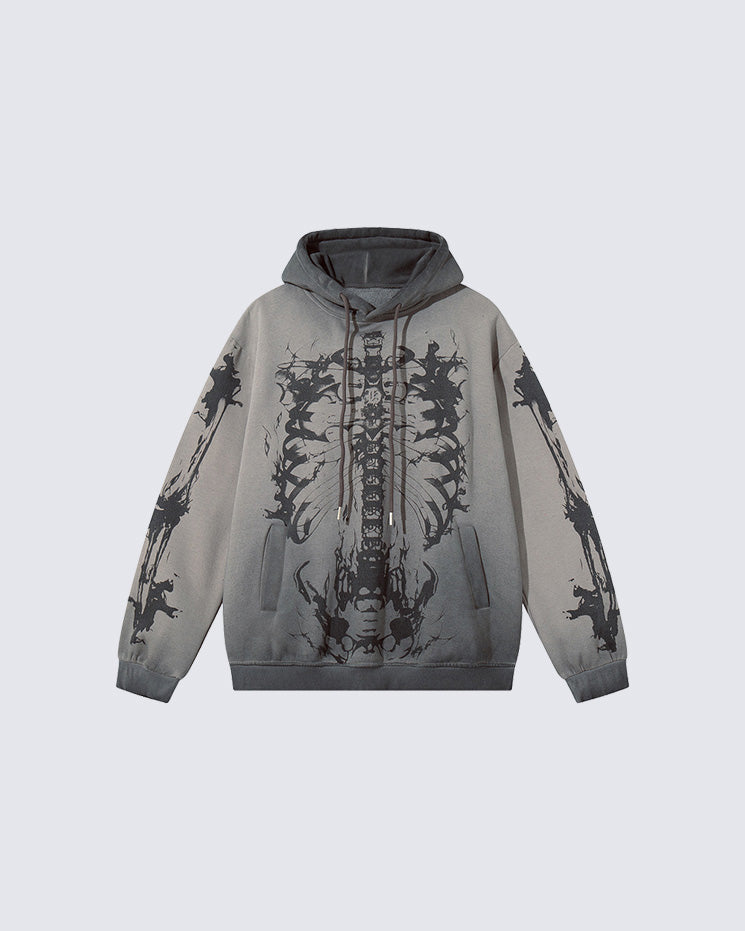 Gradient wash, skeleton graphic print, kangaroo pockets, drawstring hood, loose-fit silhouette