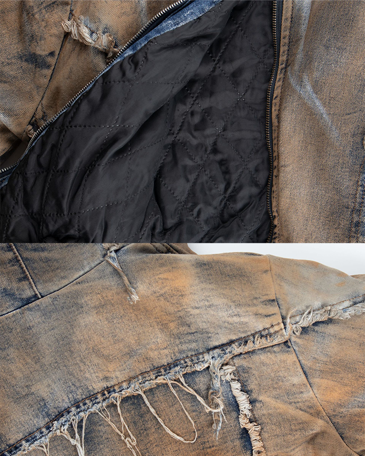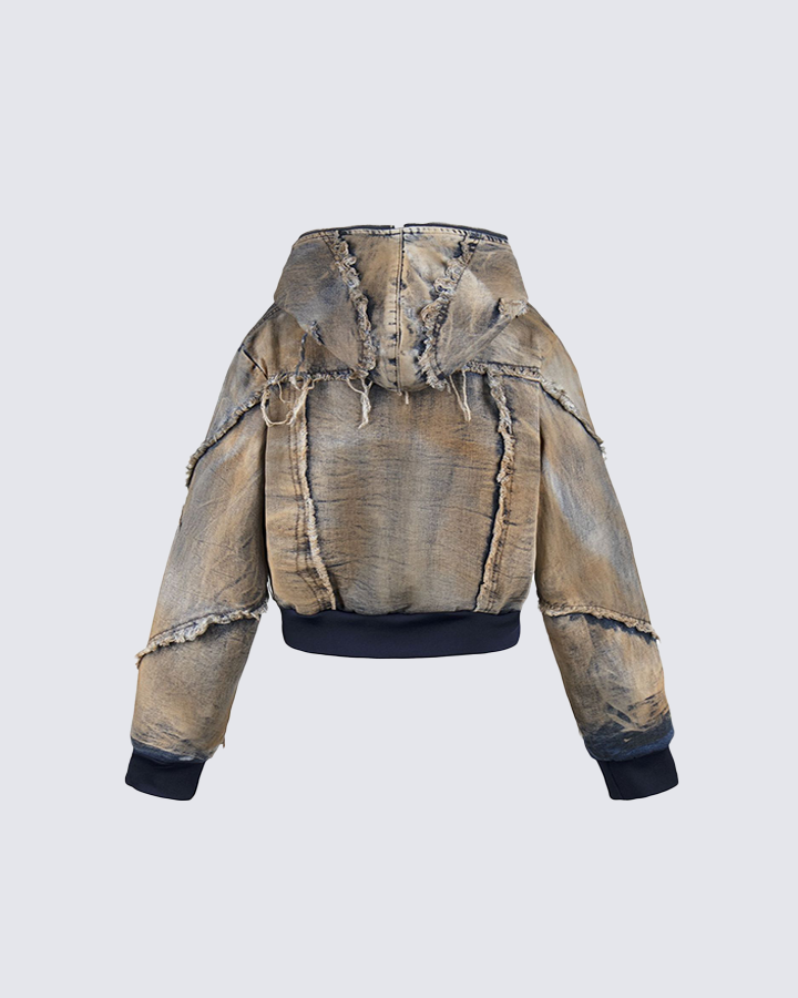 Design Elements: Distressed wash, curved seam paneling, front zip closure, ribbed cuffs & hem, hooded design