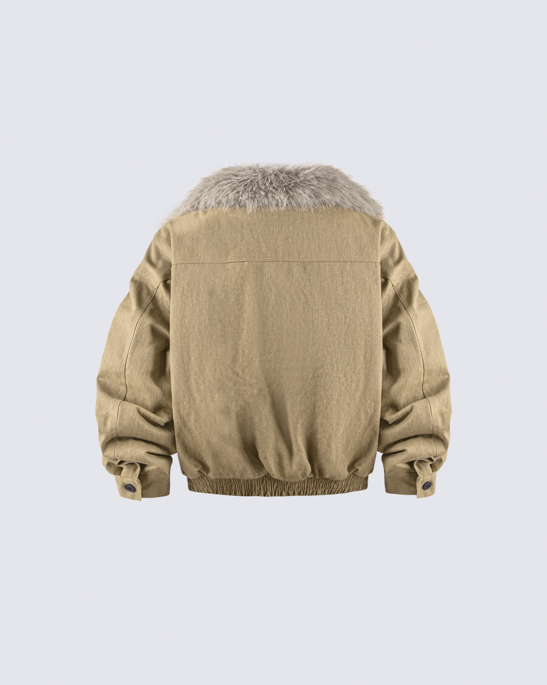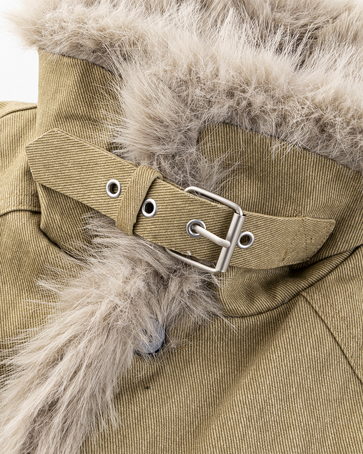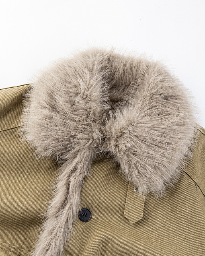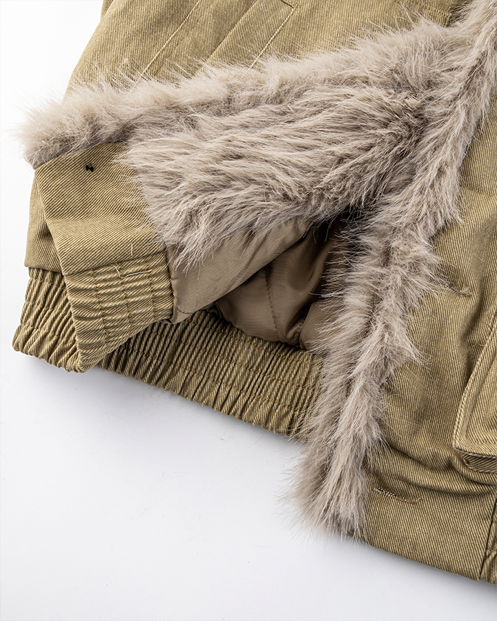 Design Elements: Faux fur collar, fleece lining, flap pockets, elasticated hem, adjustable cuffs