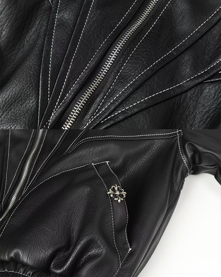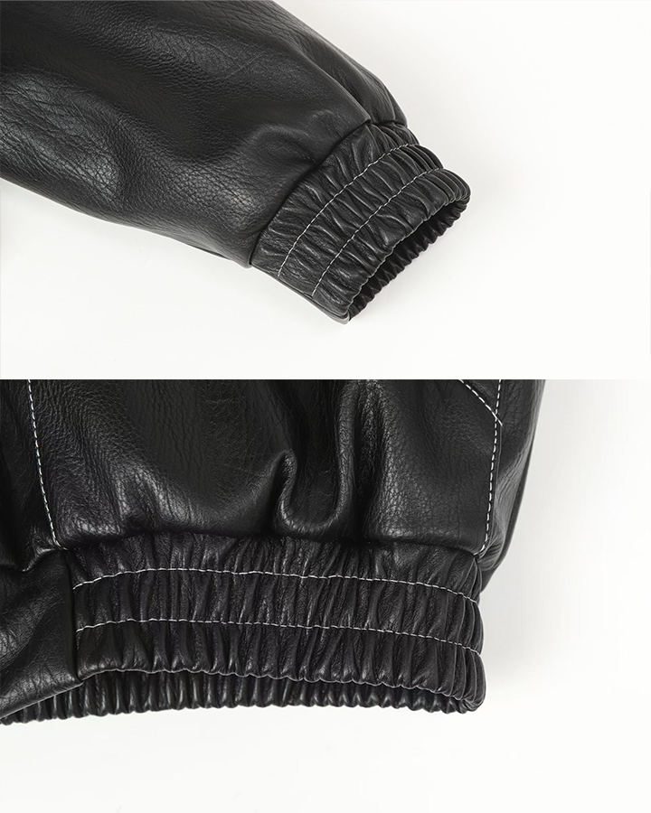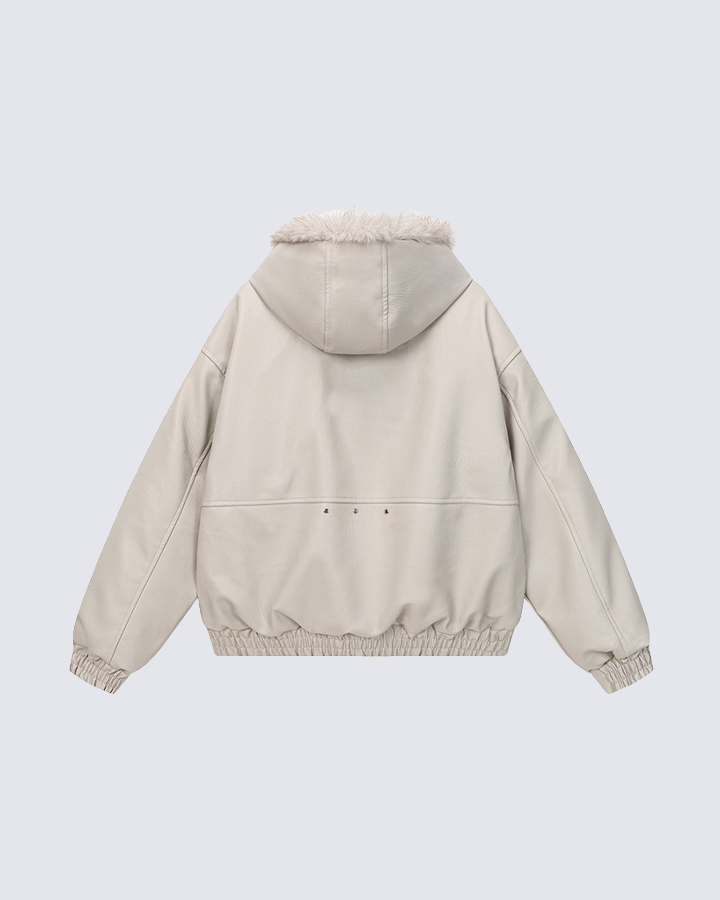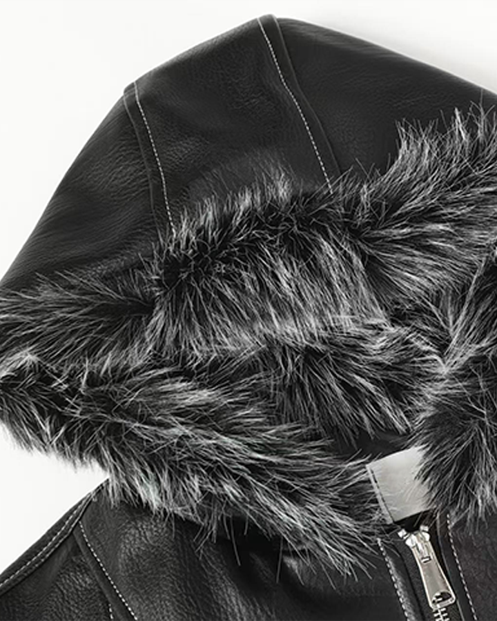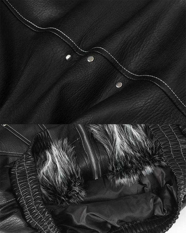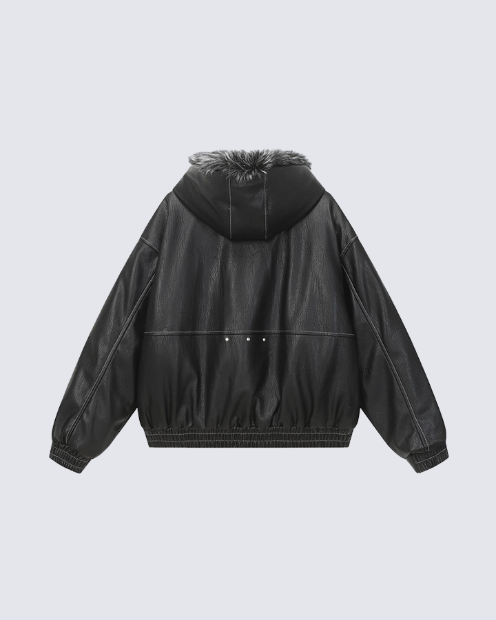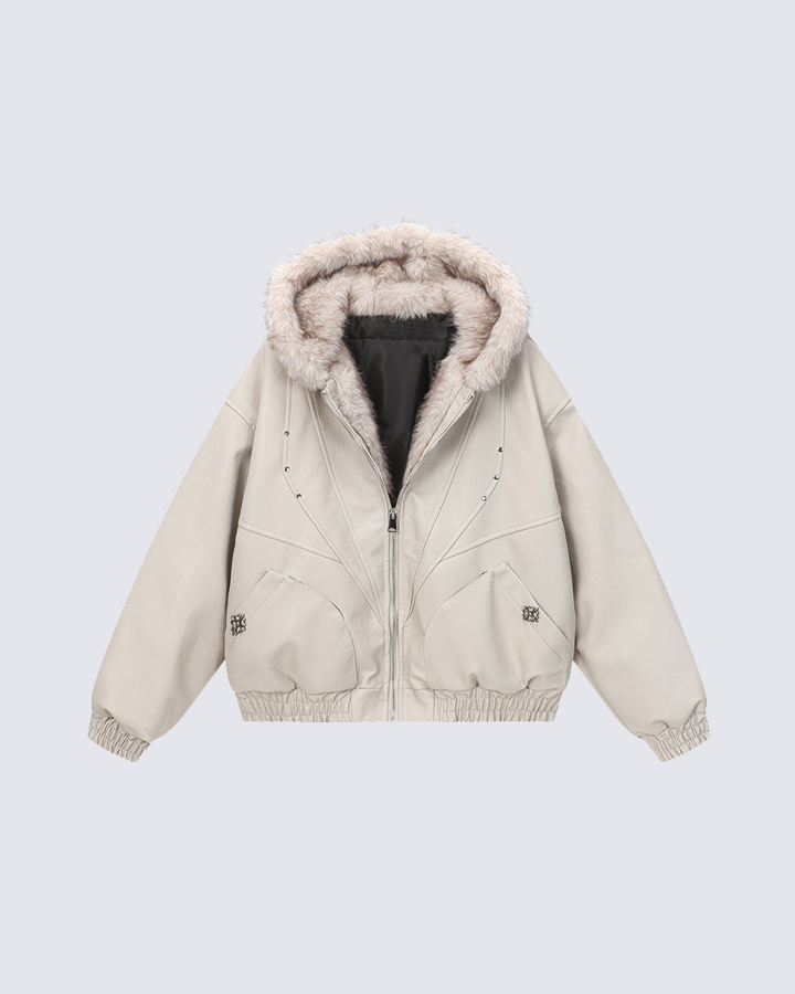 Design Elements: Oversized faux fur hood, structured faux leather exterior, curved seam detailing, front zip closure, elastic cuffs and hem, decorative metal studs, roomy front pockets