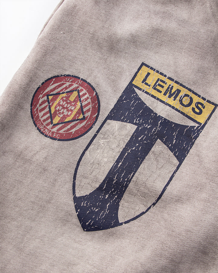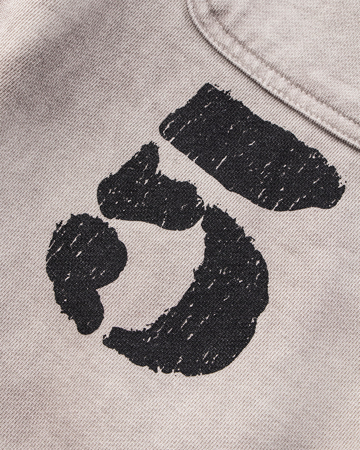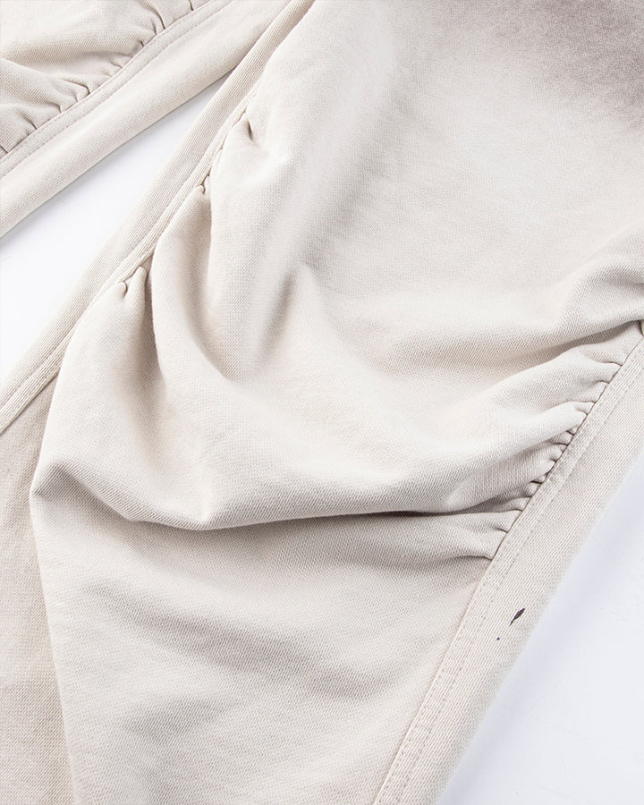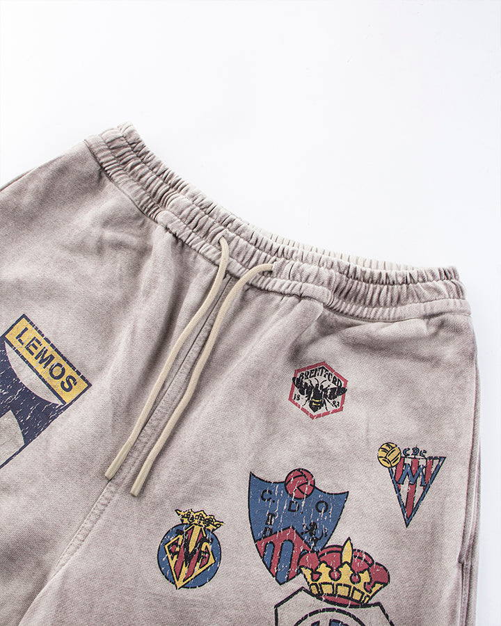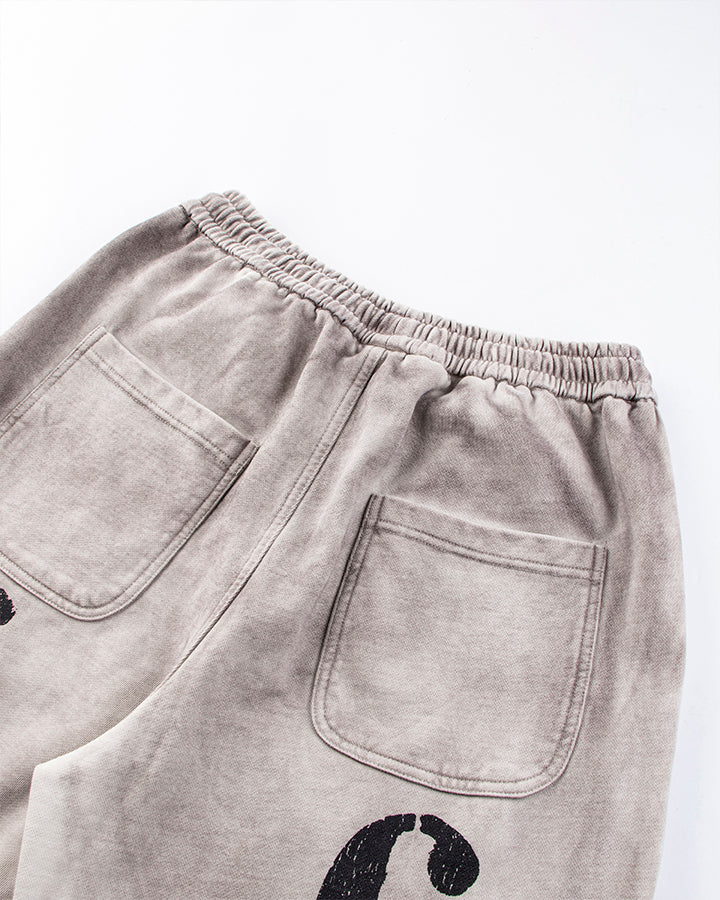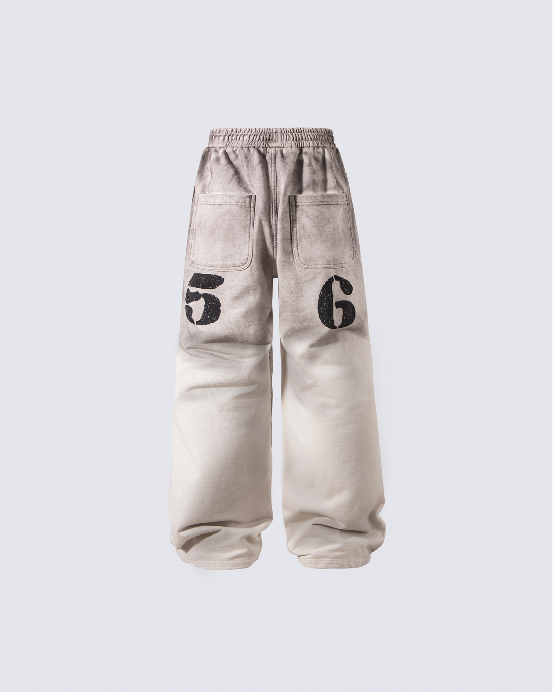 Gradient wash effect, embroidered/patch graphics, wide-leg silhouette, elastic drawstring waistband, large back numbers “5” and “6”