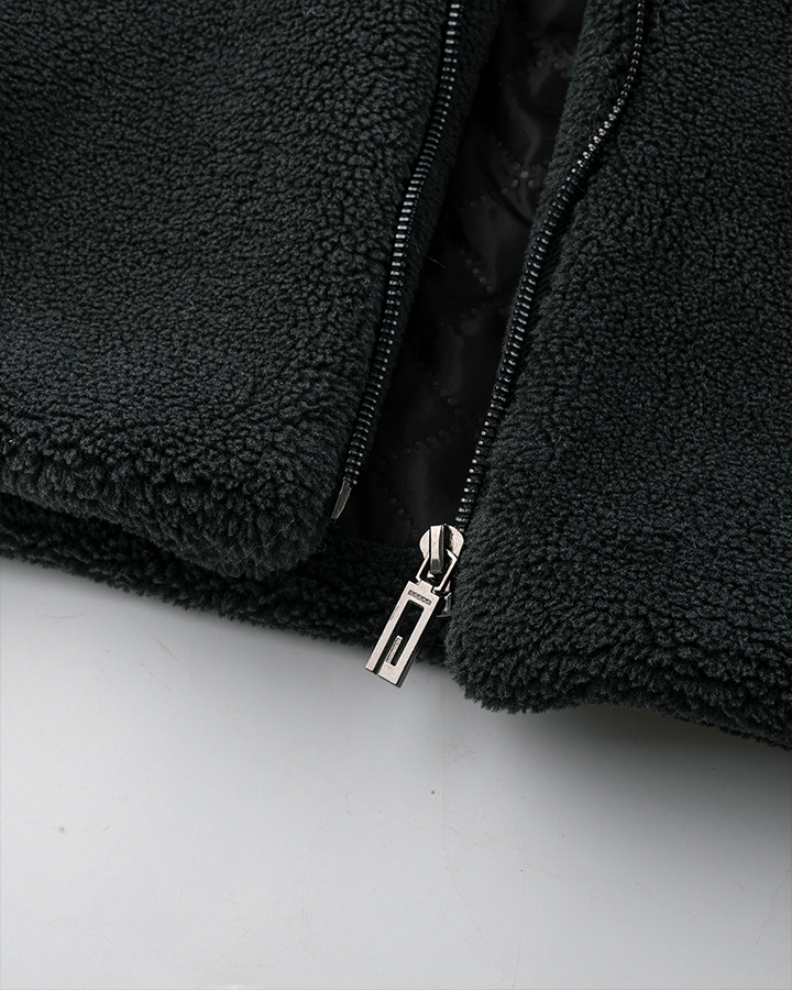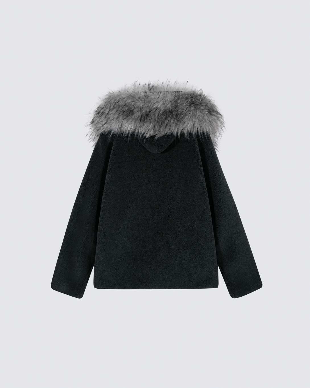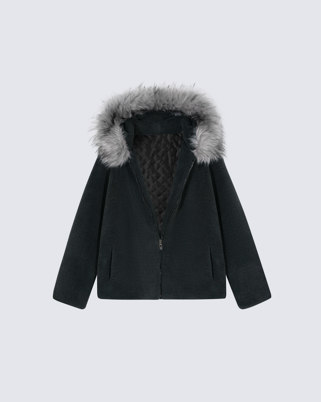 Design Elements: Soft fleece surface, detachable faux fur hood, quilted inner padding, hidden zip closure, minimalist silhouette