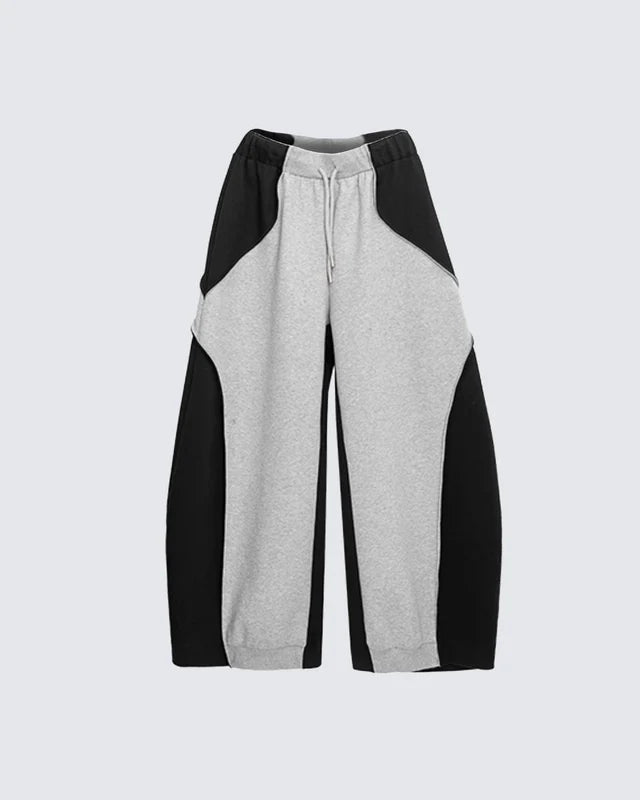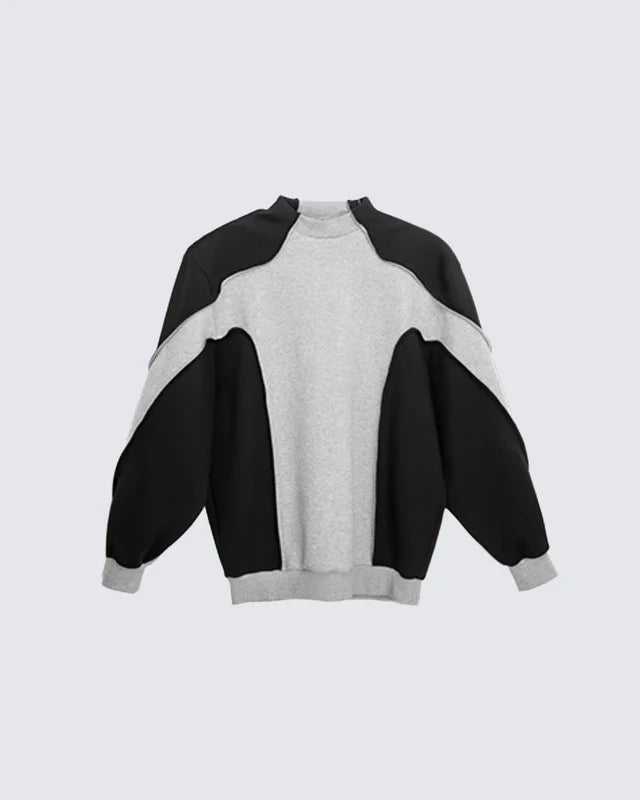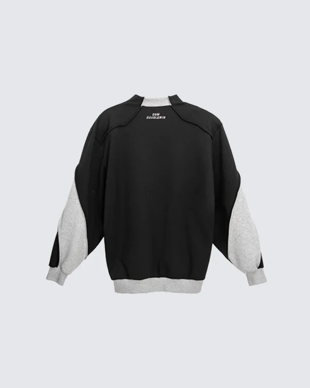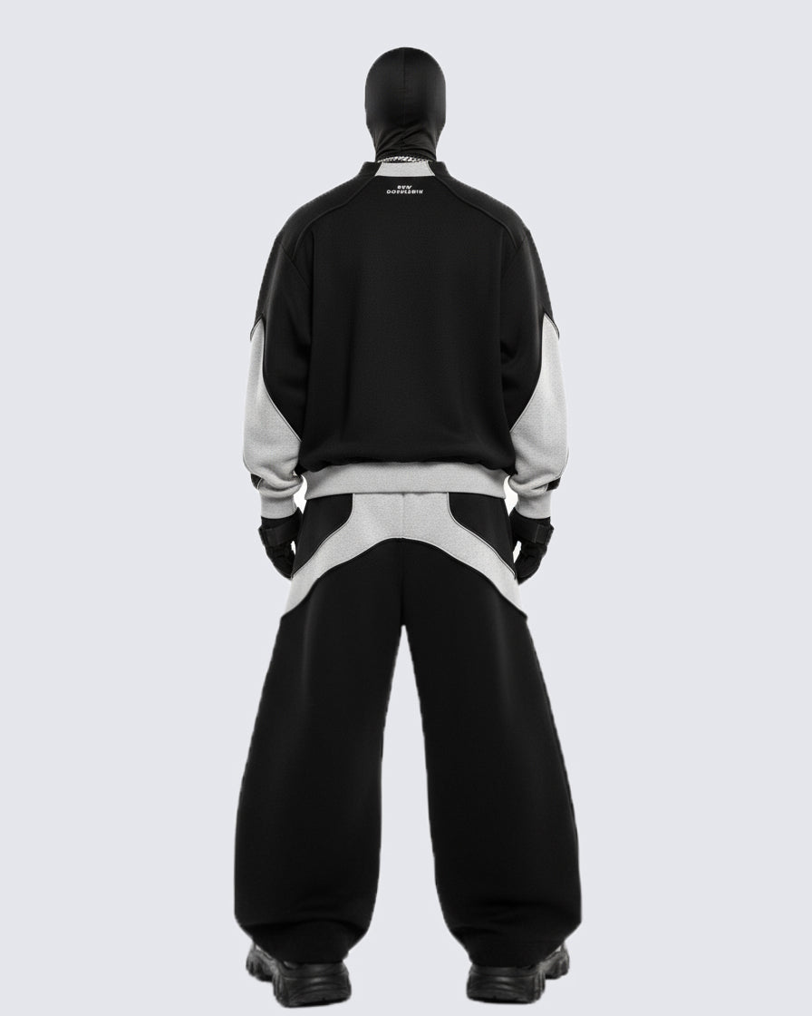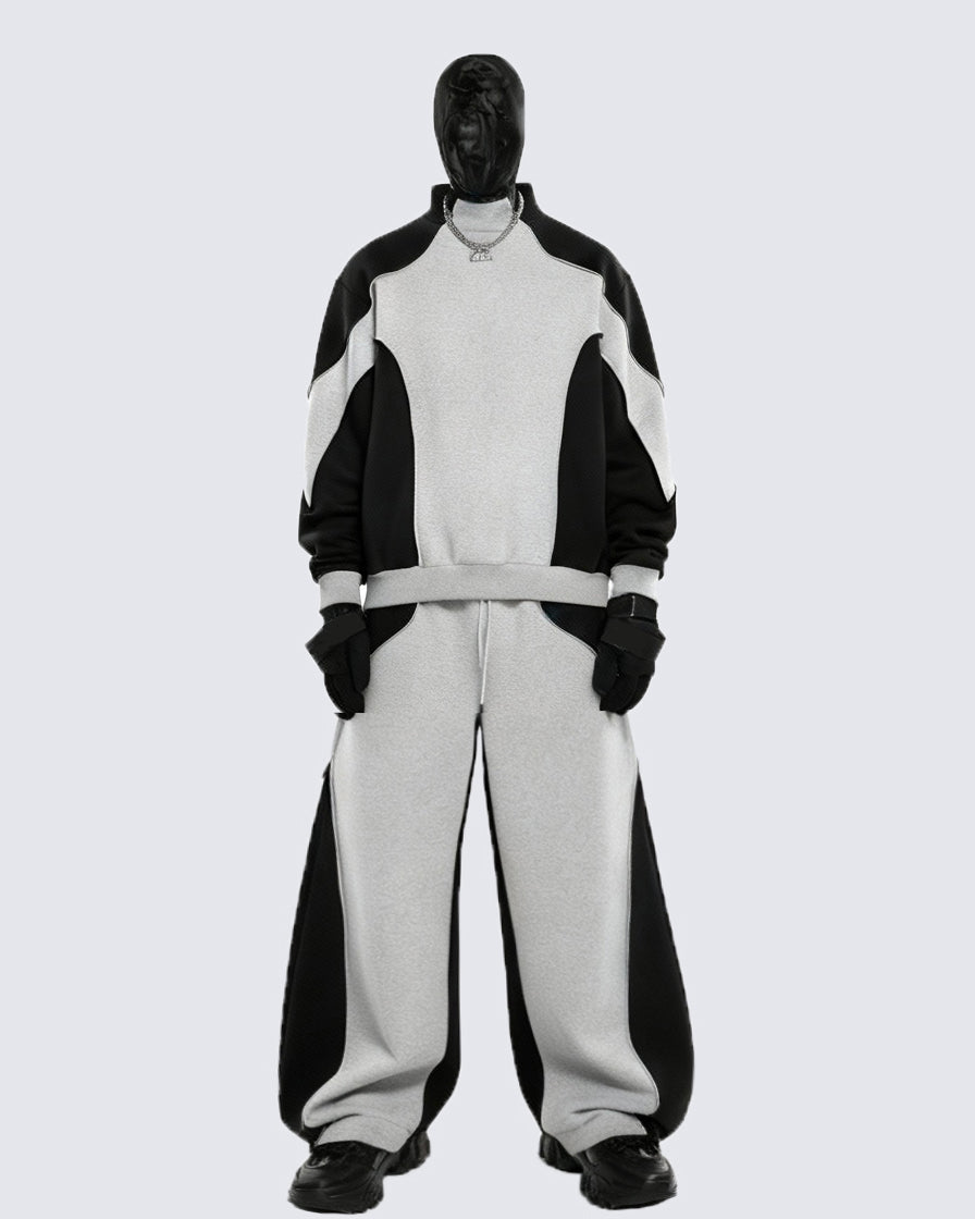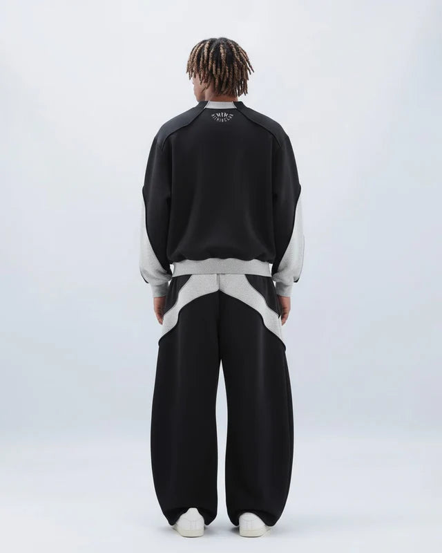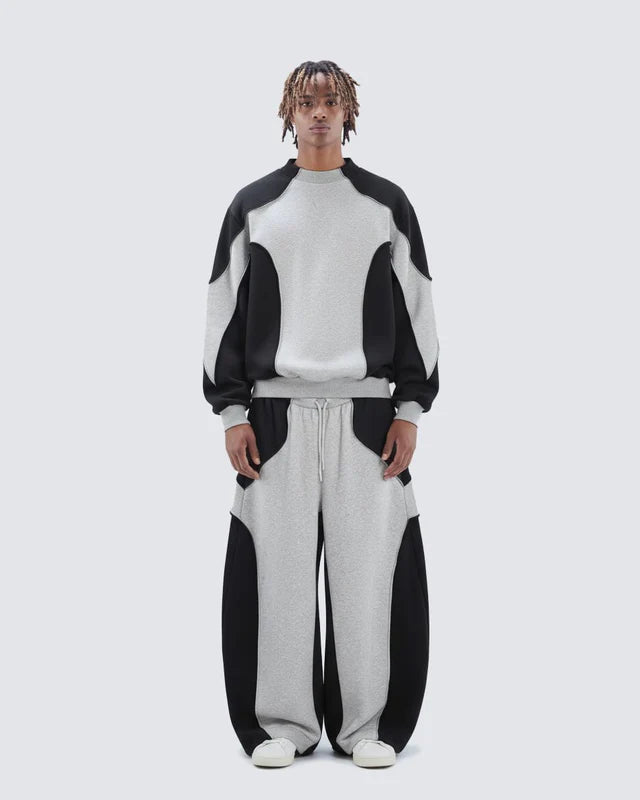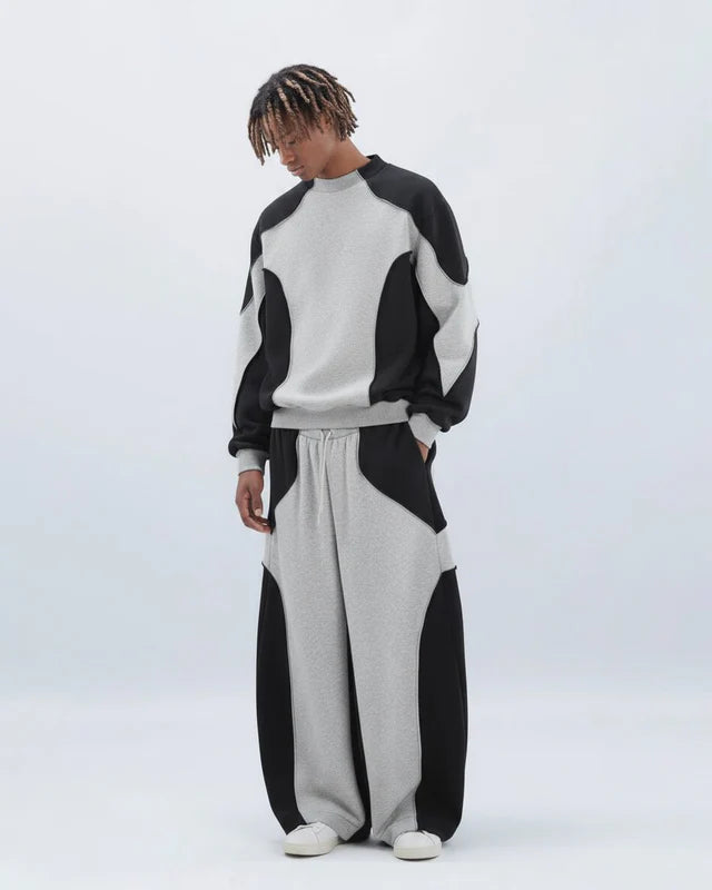Design Elements: Bold black-and-grey colorblock, oversized crewneck sweatshirt, wide-leg pants, relaxed silhouette, unisex street vibe, modern sportswear edge