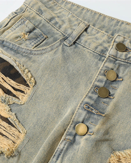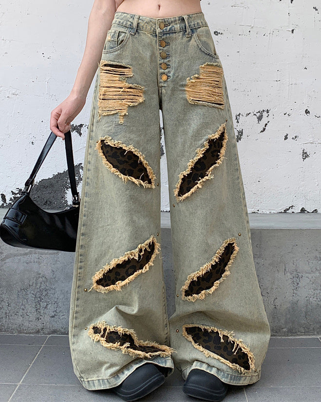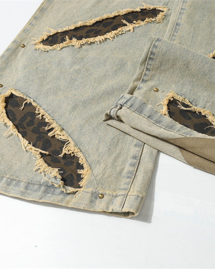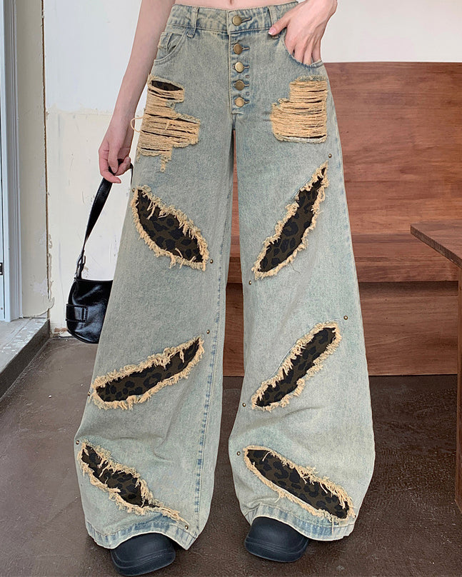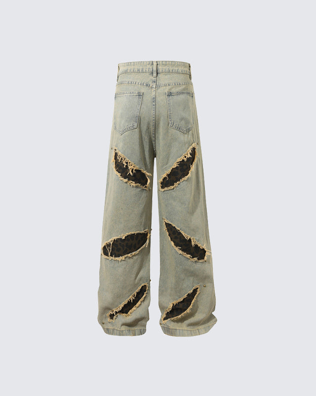 Full print distressed detailing, large ripped patches, gradient washed texture, floor-length loose fit, button fly closure
