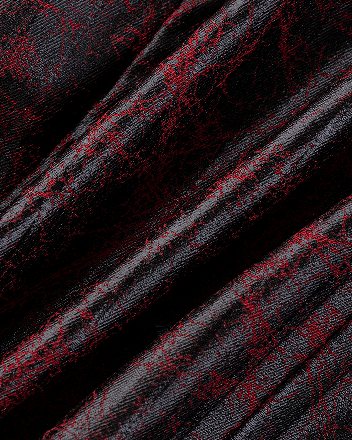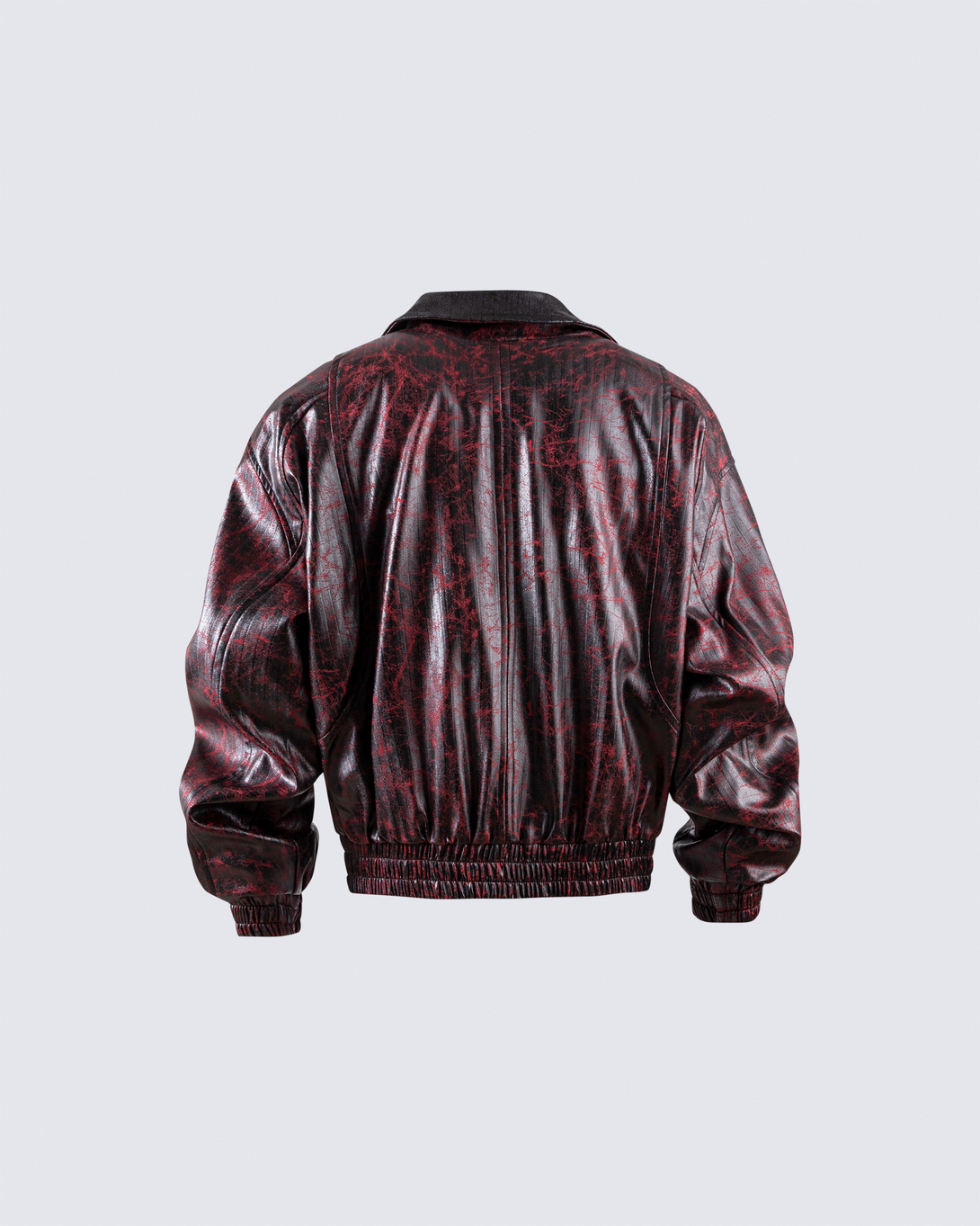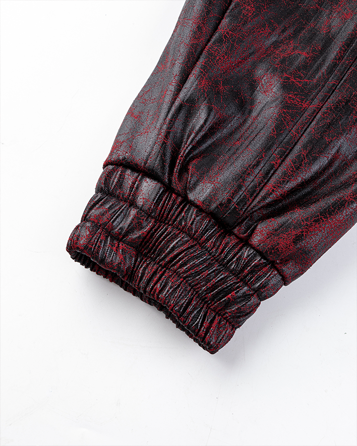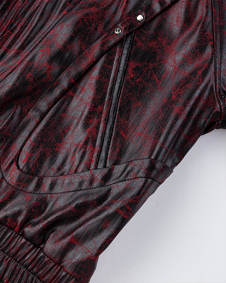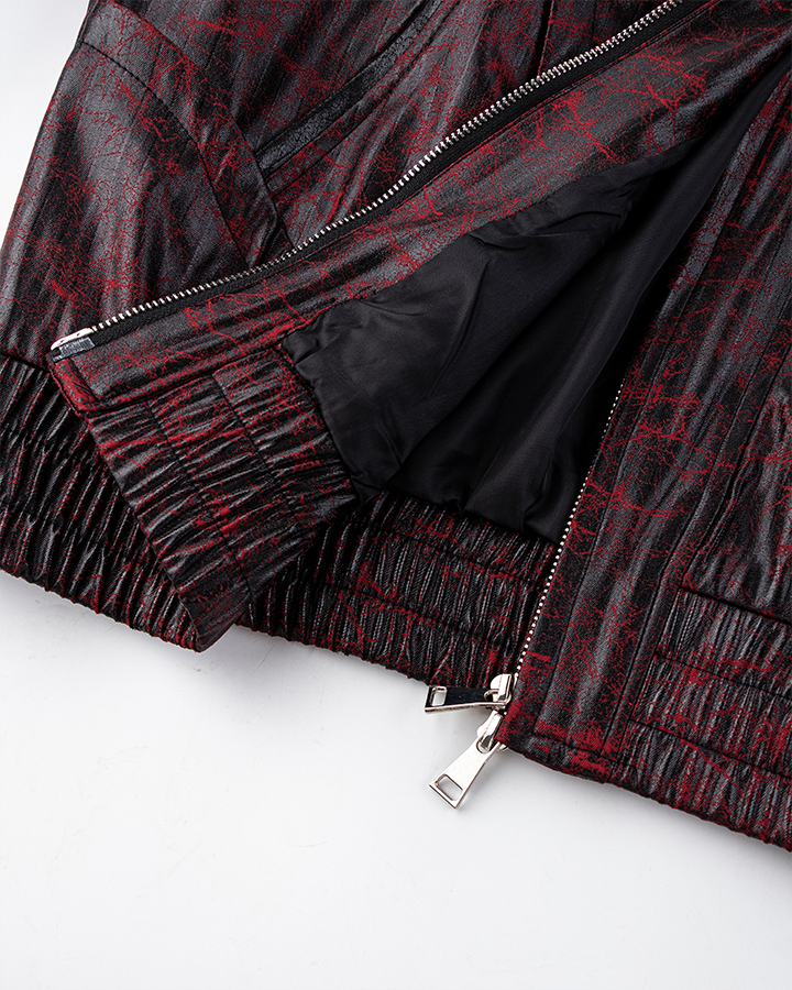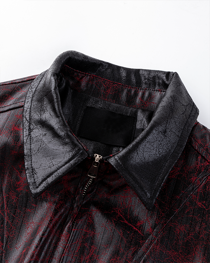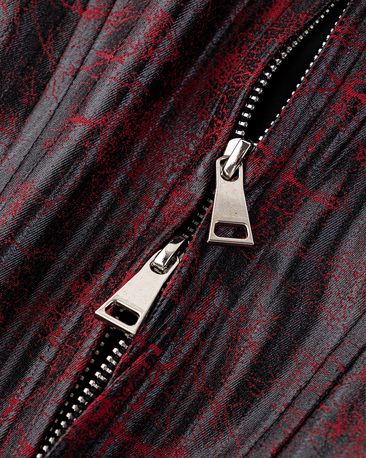 Design Elements: Red-black burnished texture, shirt collar, front zip closure, elastic hem & cuffs