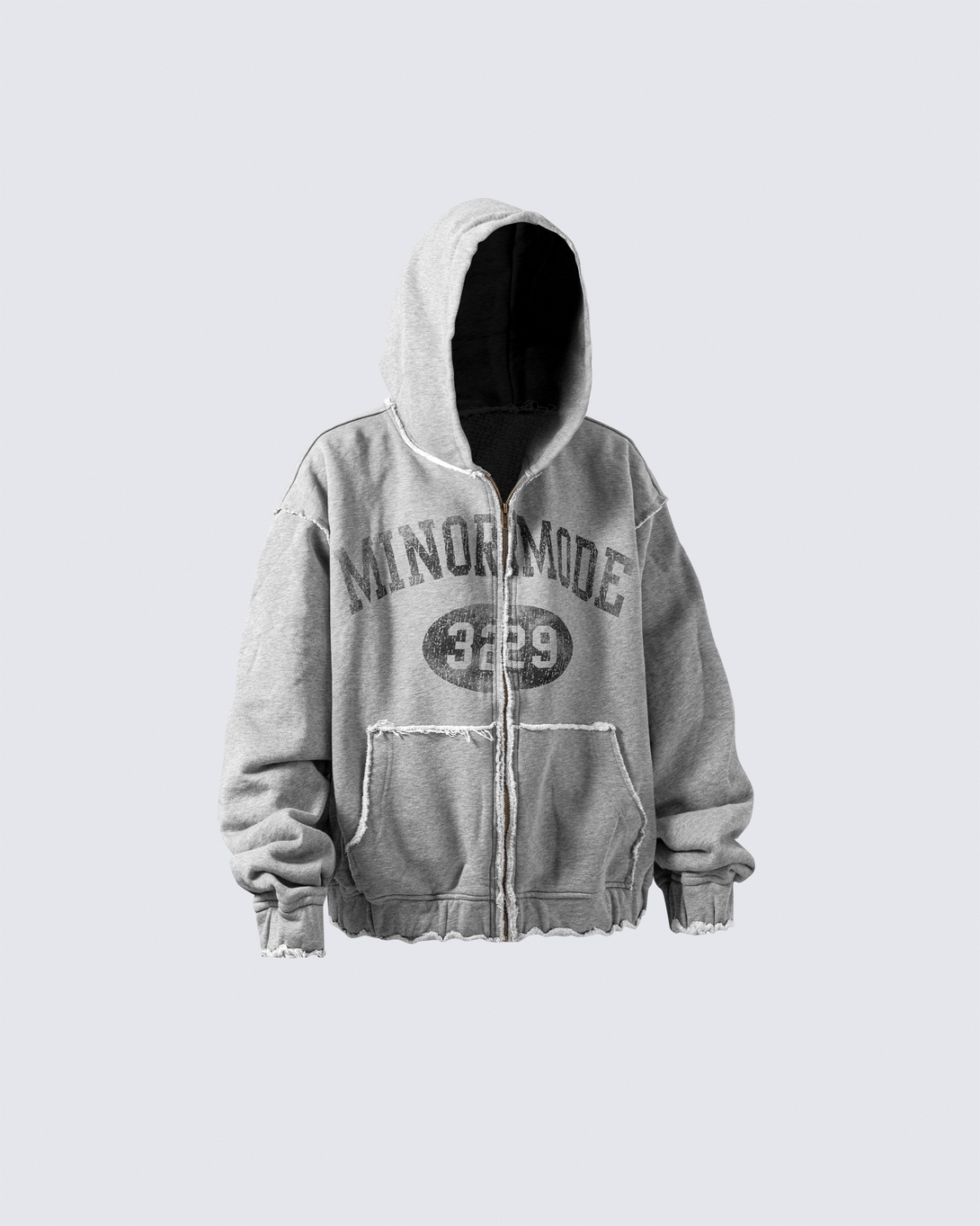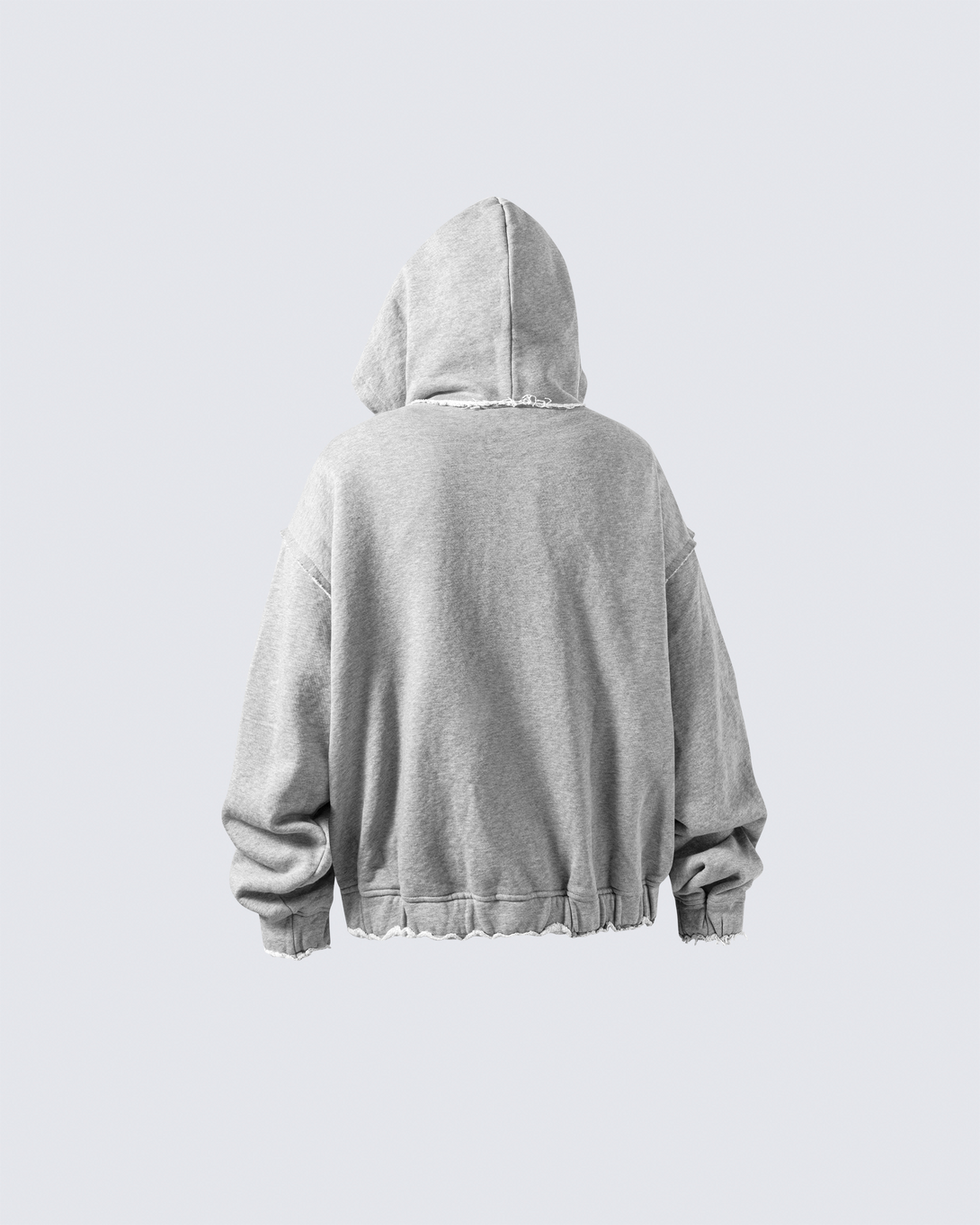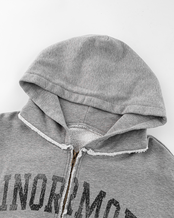 Design Elements: Distressed edges, graphic print, front zip closure, kangaroo pockets