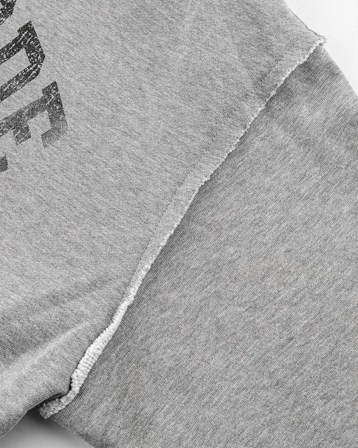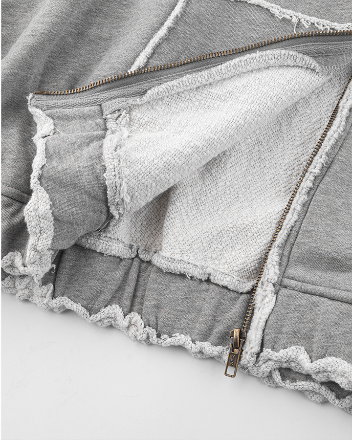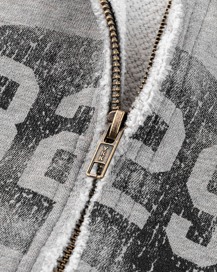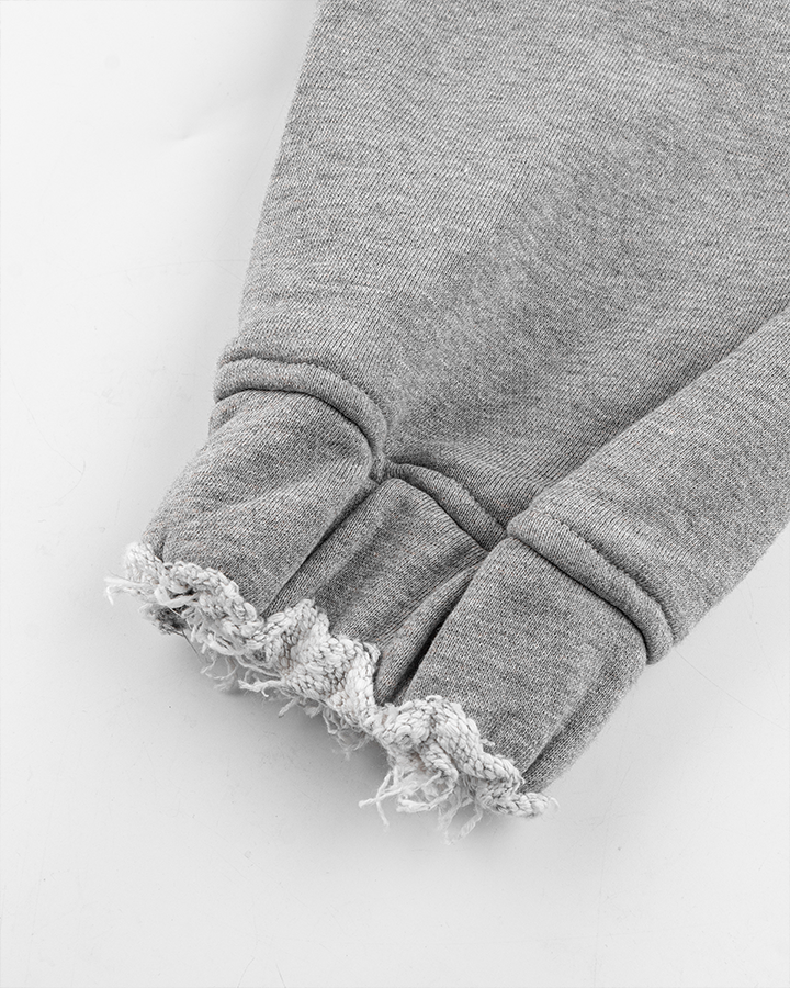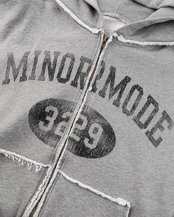 Design Elements: Distressed edges, graphic print, front zip closure, kangaroo pockets