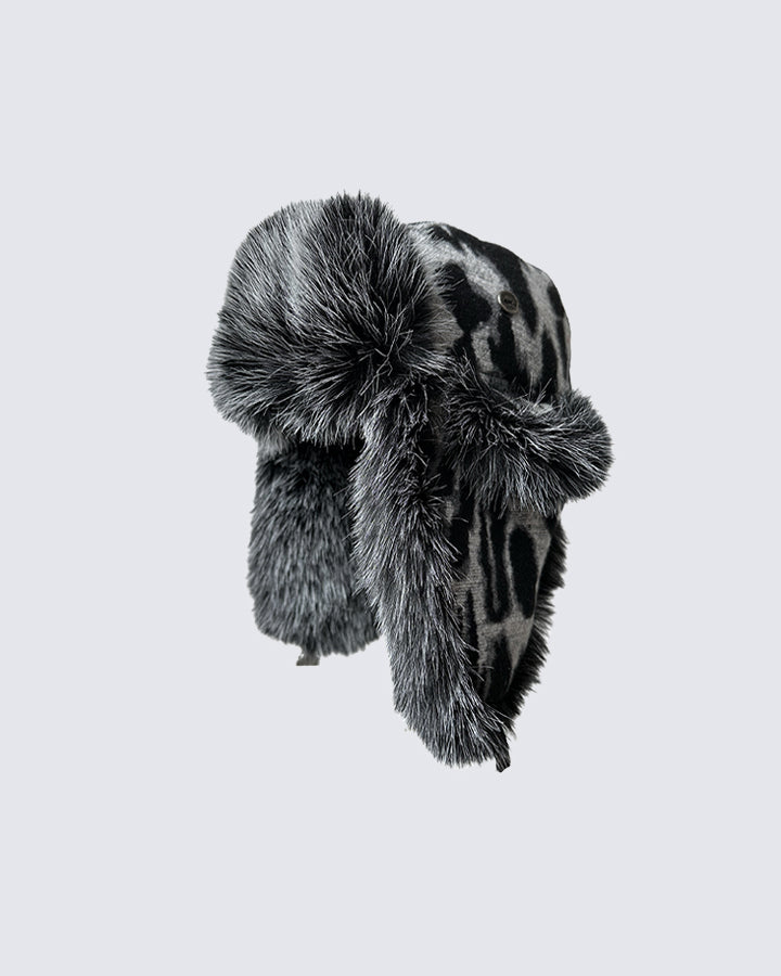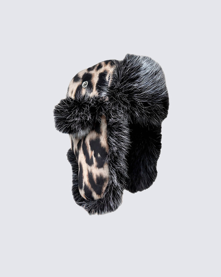 Leopard print, faux fur trim, ear flaps, warm and stylish winter design