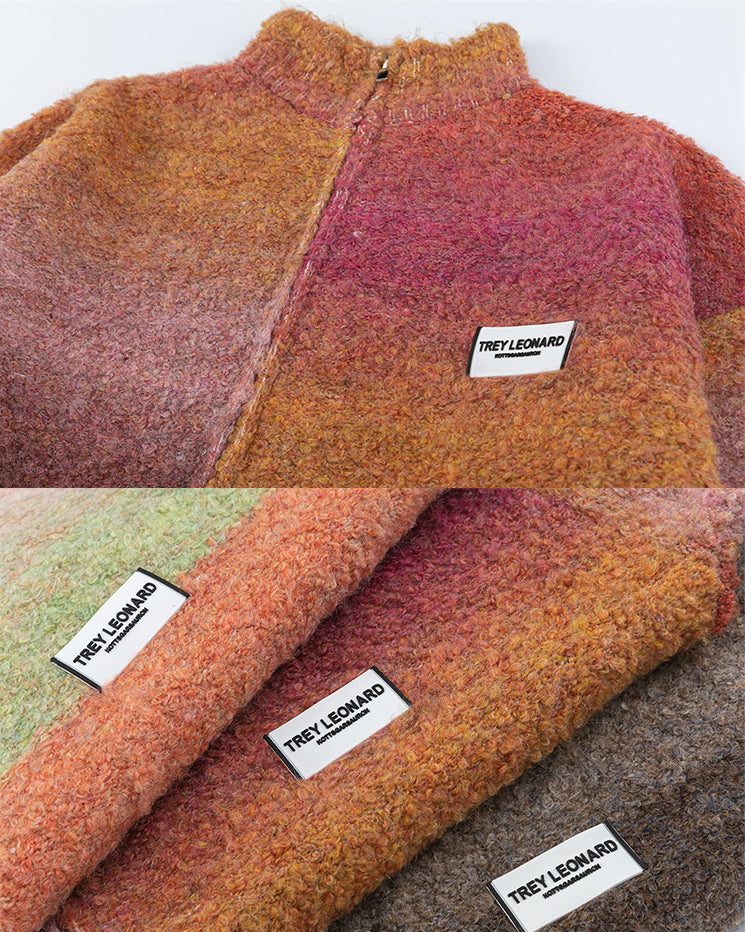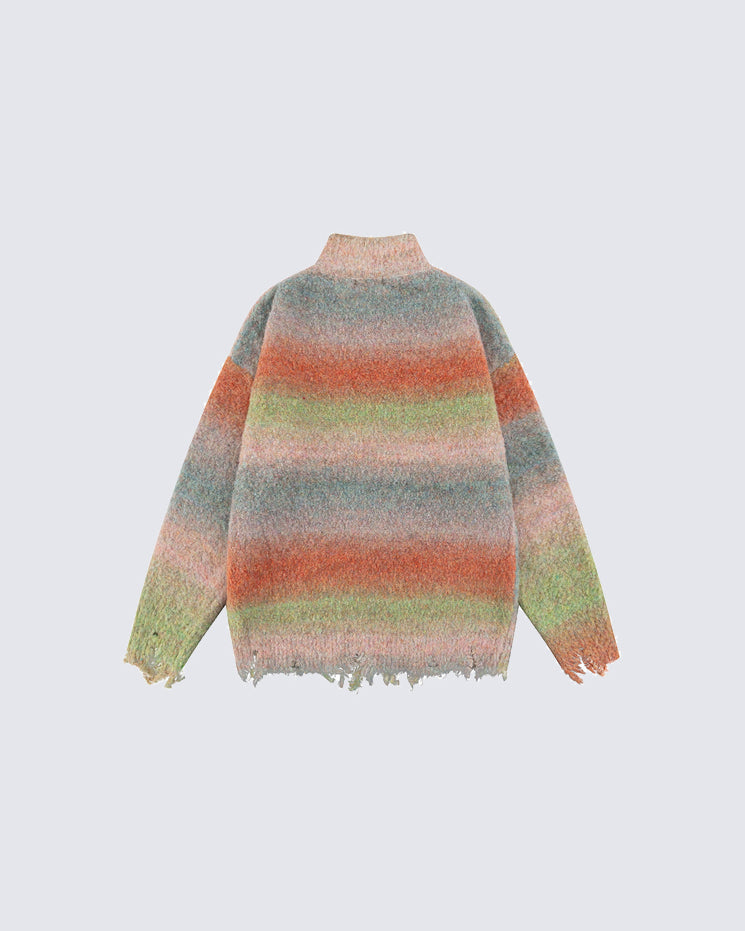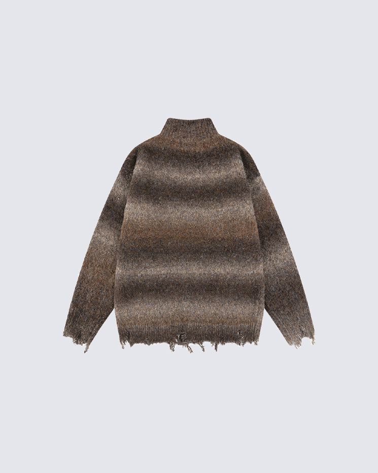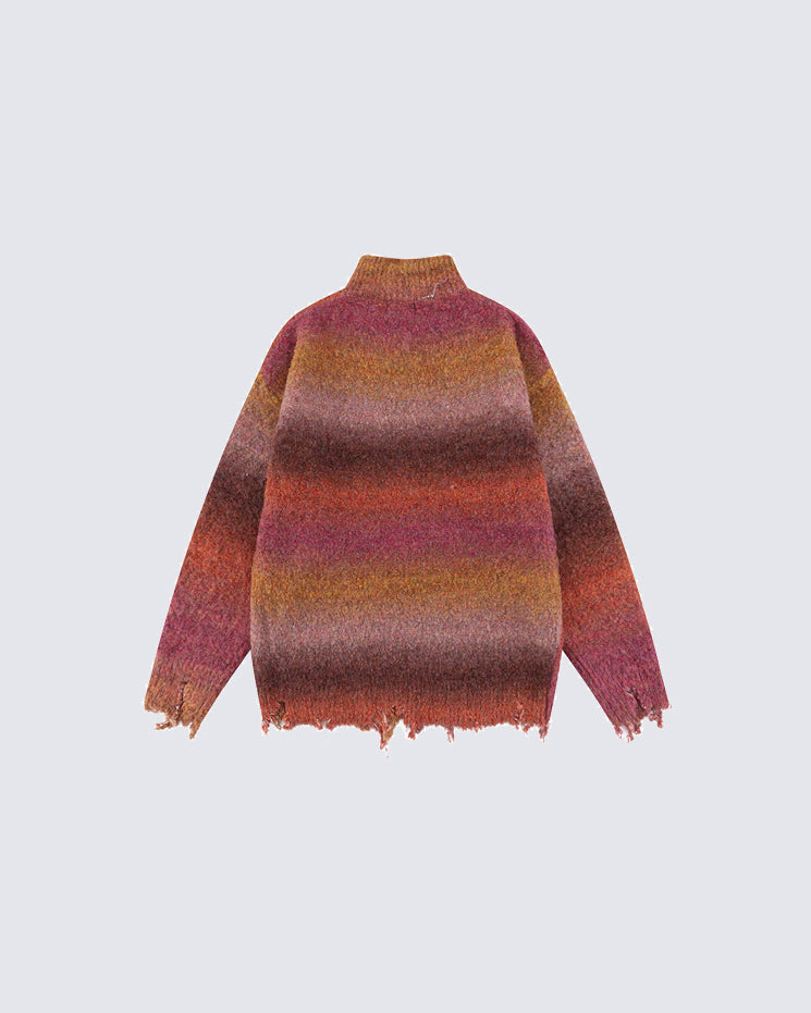 Gradient color effect, distressed raw hem, cardigan design with front zip, textured knit, relaxed fit