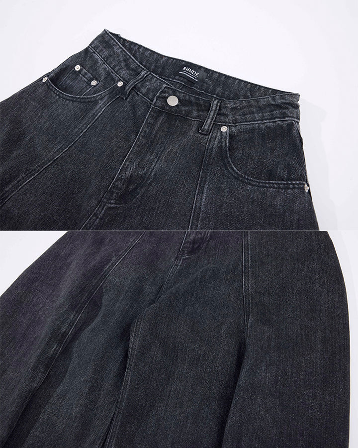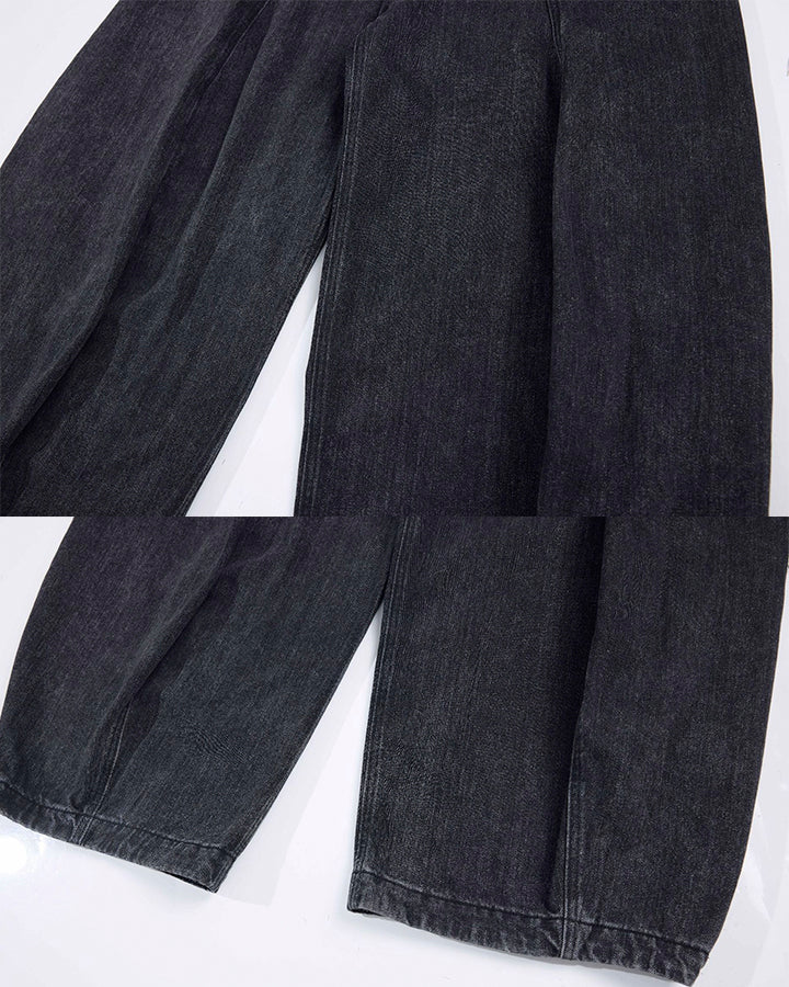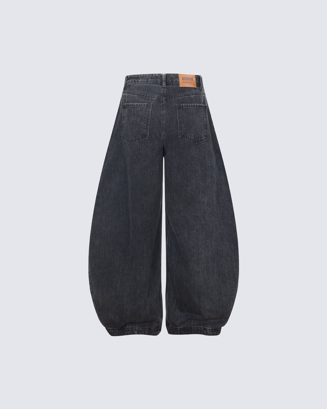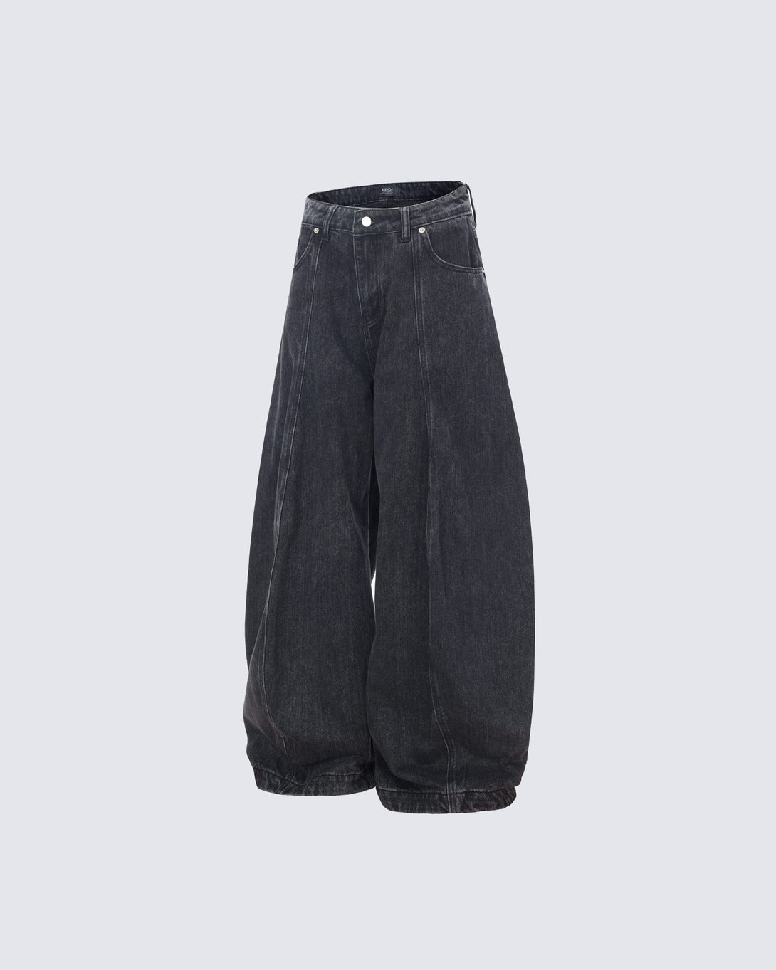 Balloon silhouette, washed denim texture, wide-leg design, elastic hem, classic five-pocket layout