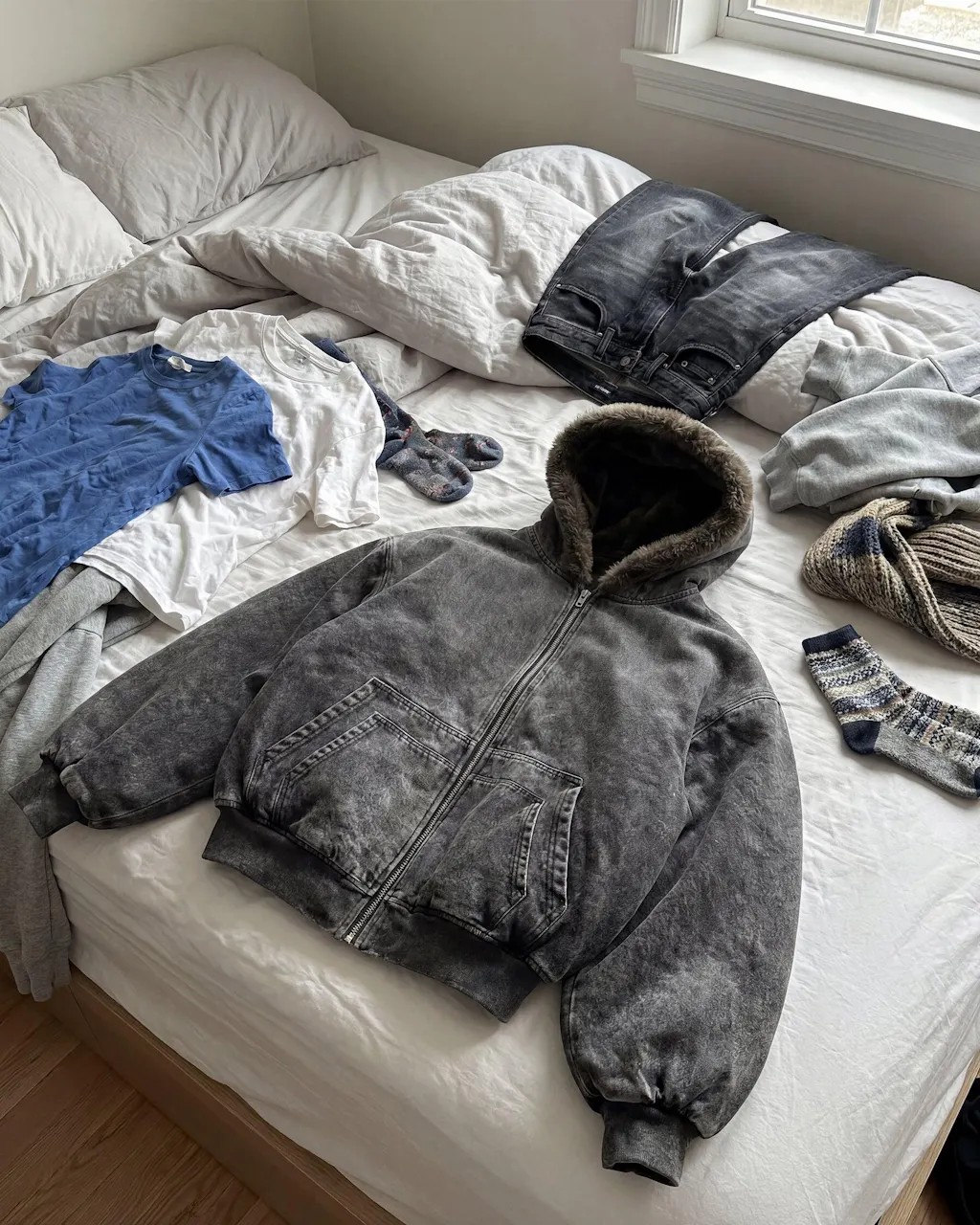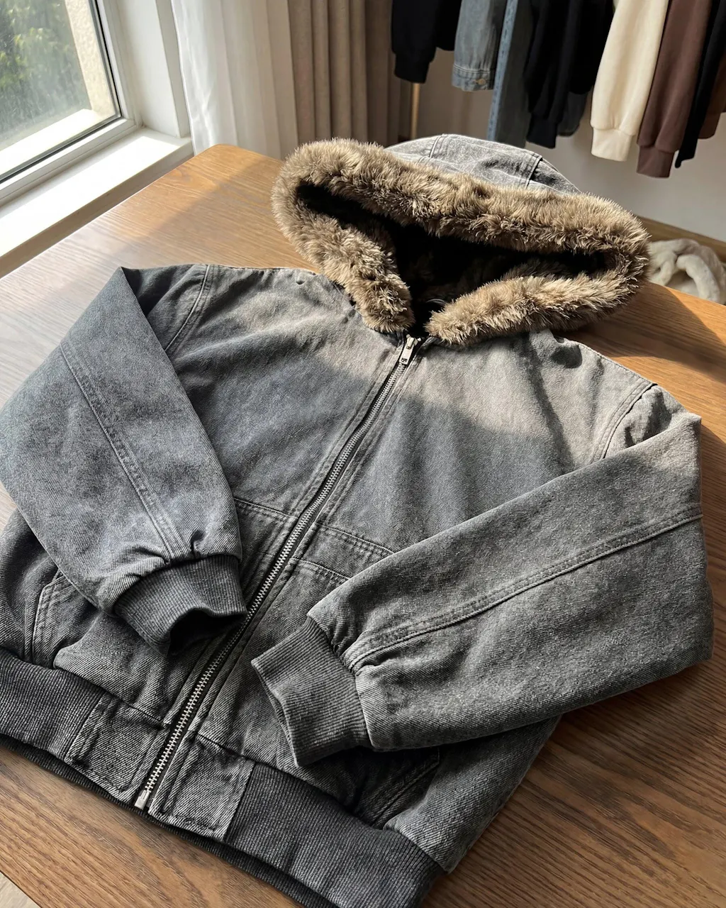 Doté d'une capuche bordée de fausse fourrure polaire moelleuse, créant un jeu de matériaux contrastés.