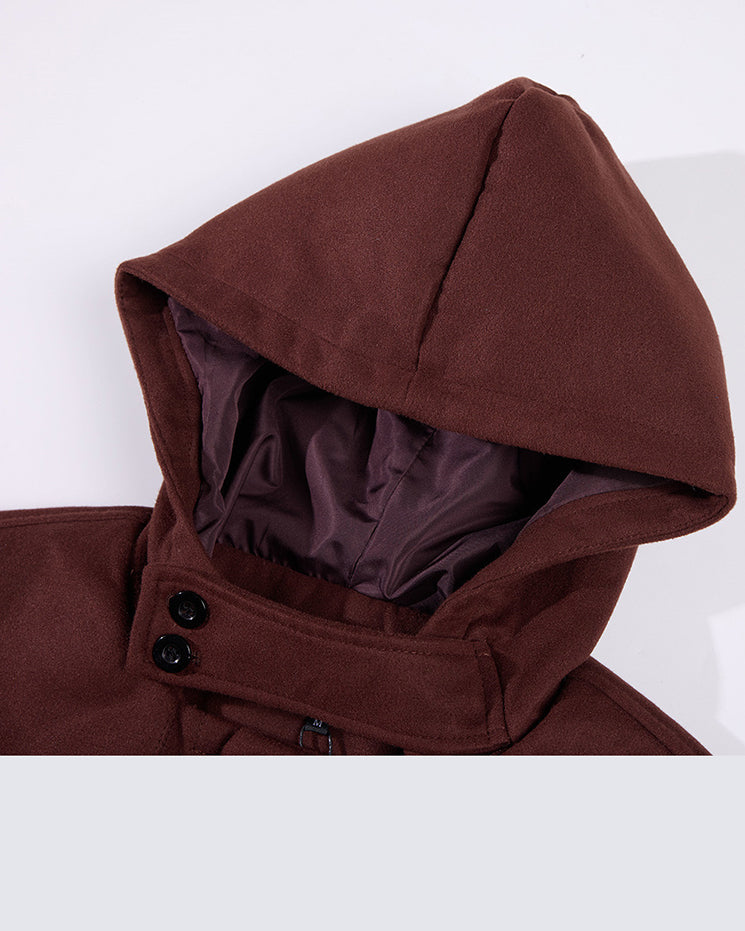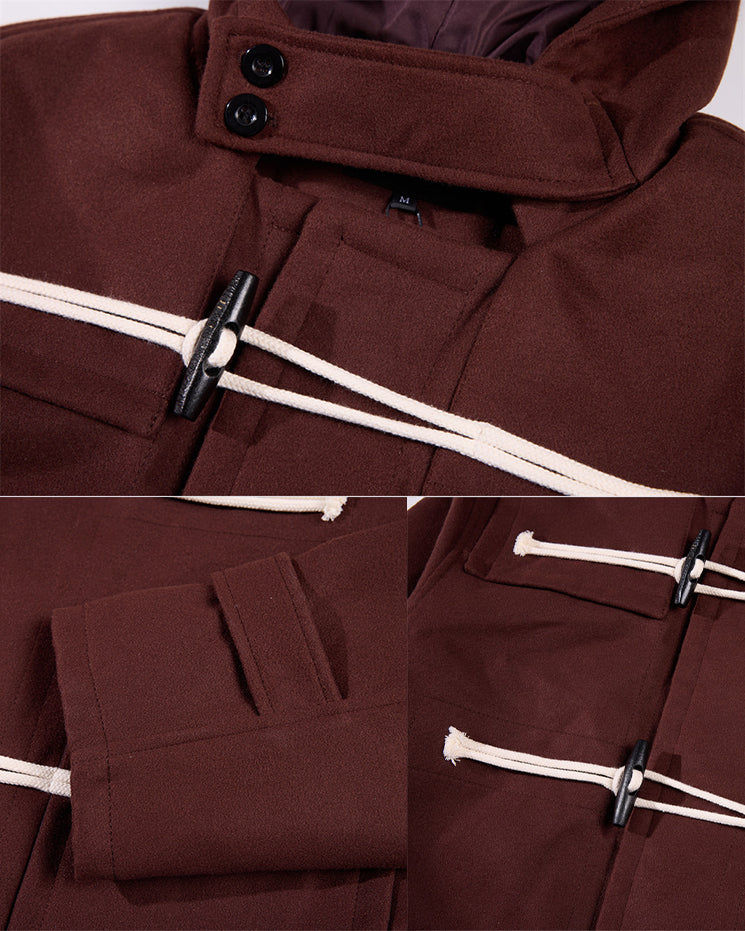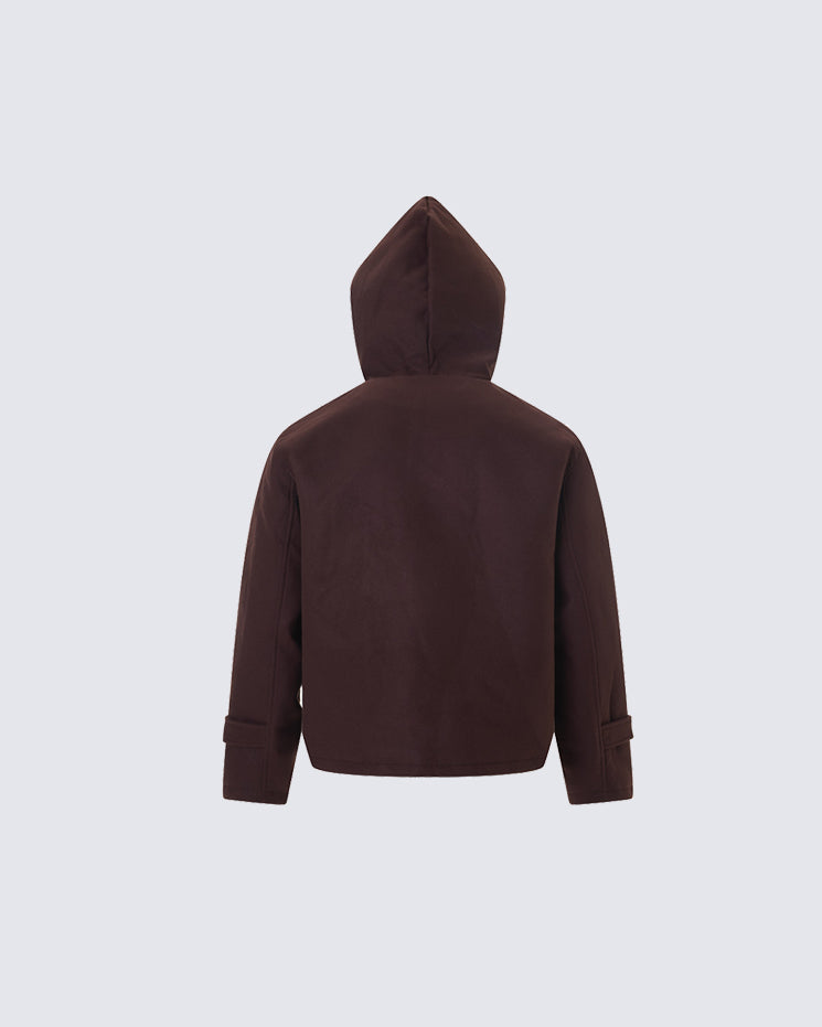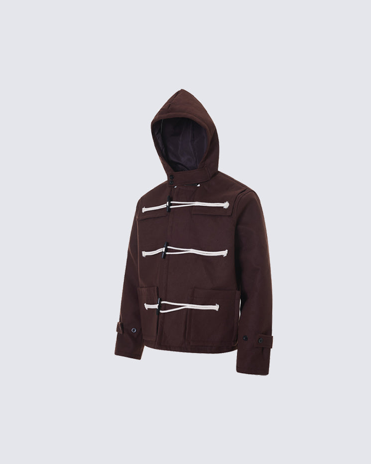 Duffle-style toggle closures, hooded design, large utility pockets, contrast drawstring details, structured silhouette