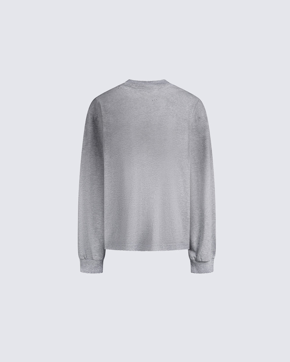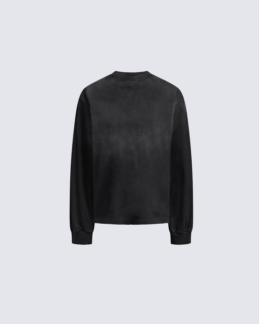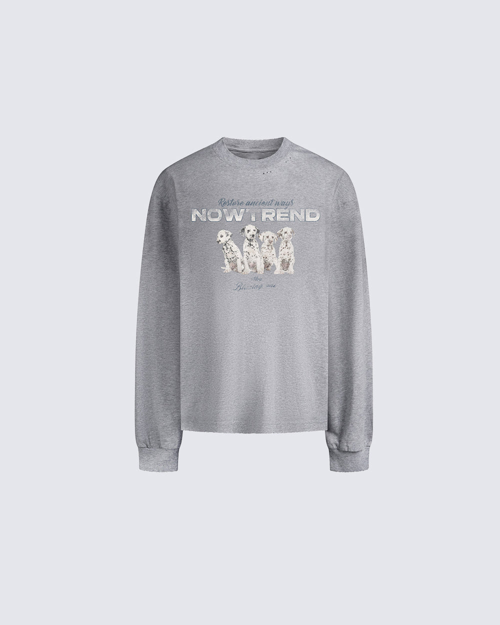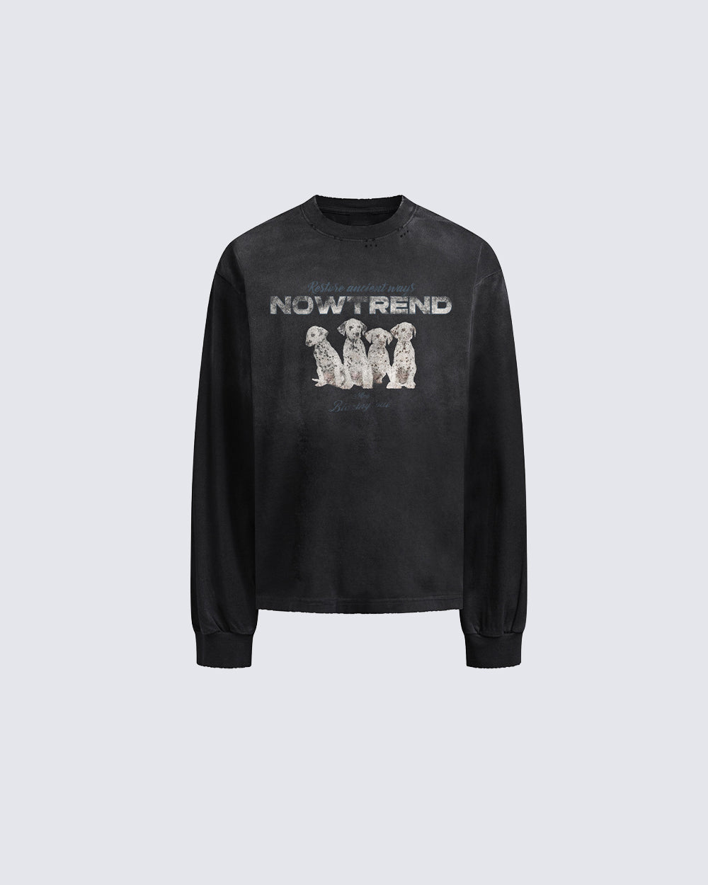 Spray-paint dog graphic, distressed/washed finish, crew neck, long sleeves, relaxed fit, ribbed cuffs, vintage fade