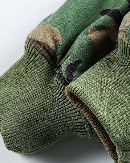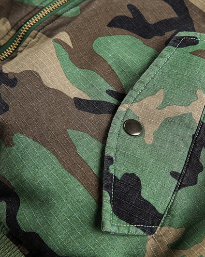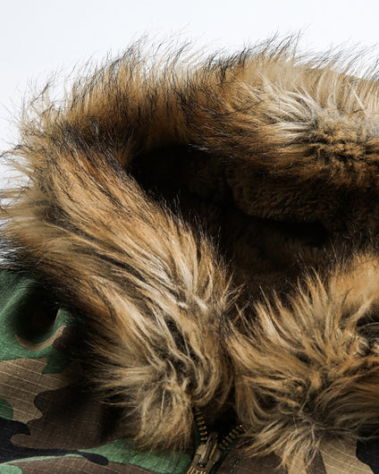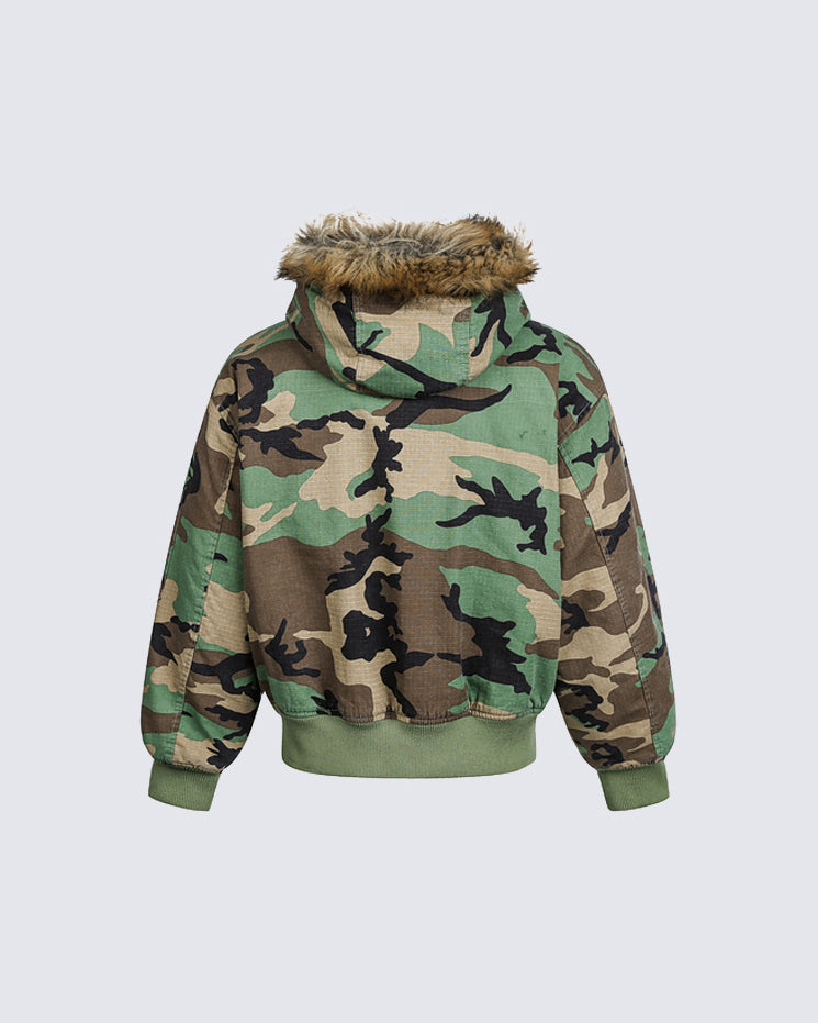 Camouflage print, faux fur hood lining, short bomber silhouette, elastic cuffs and hem, functional pockets, and zip-up front.