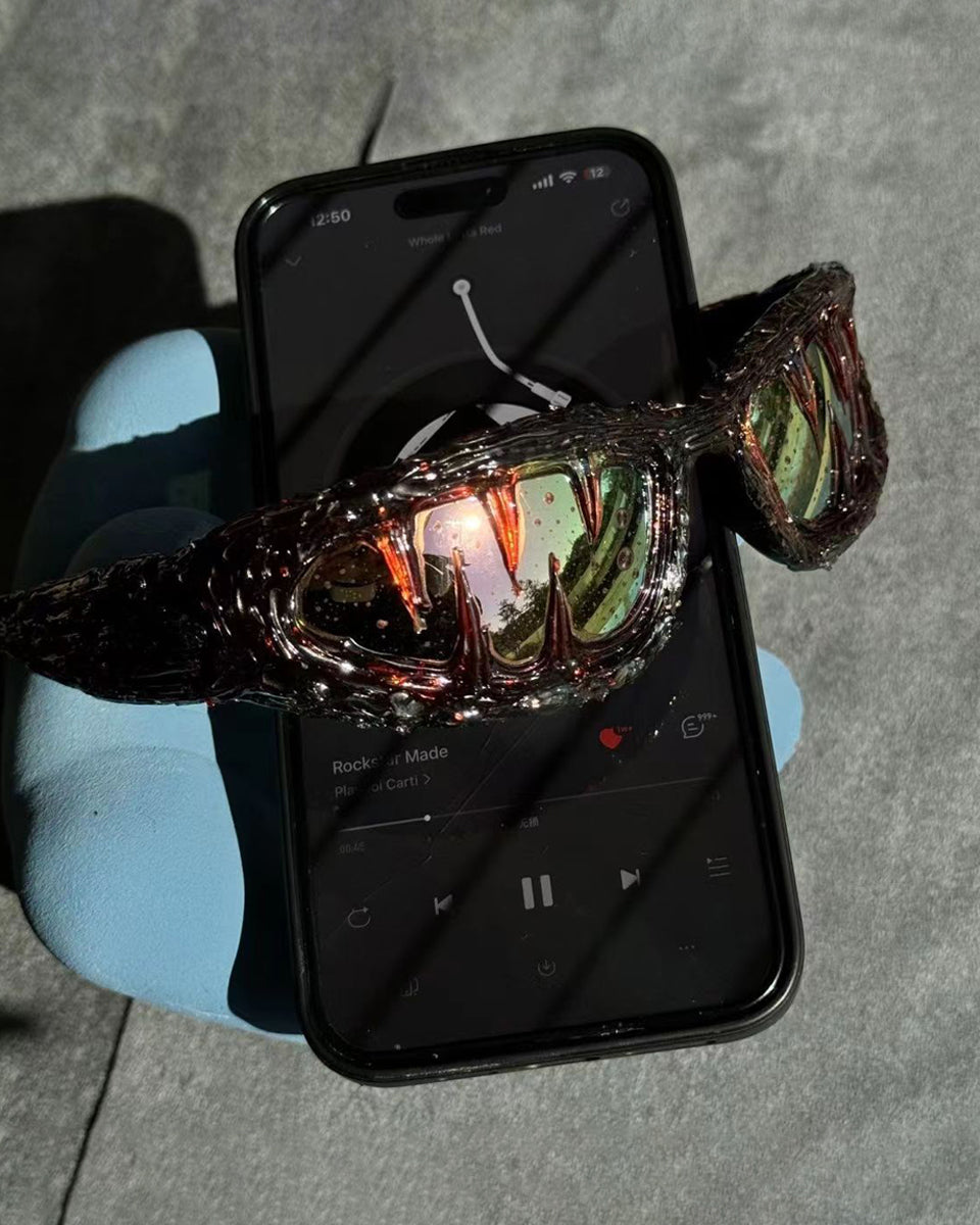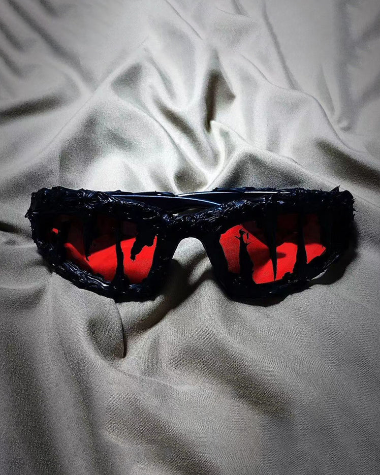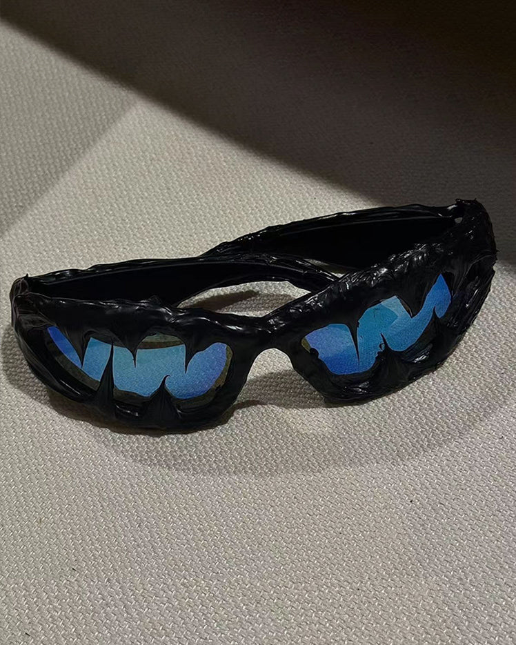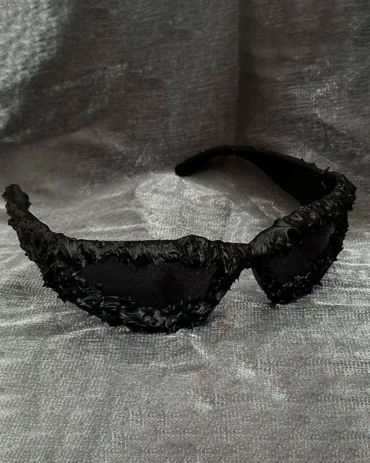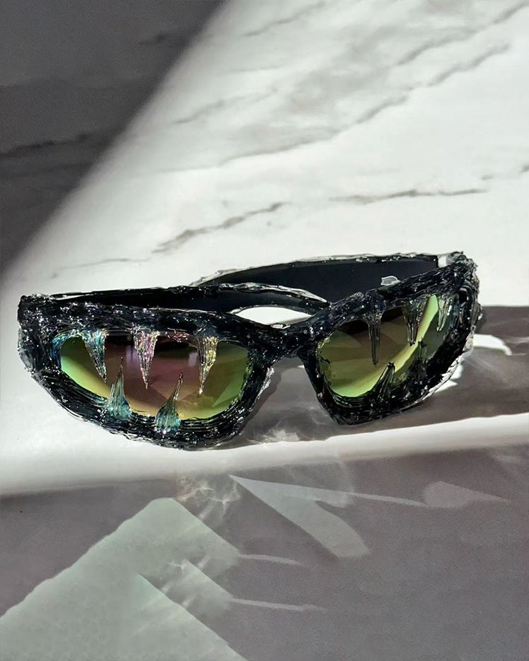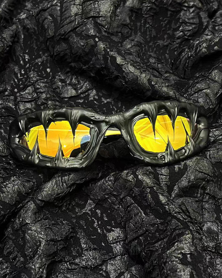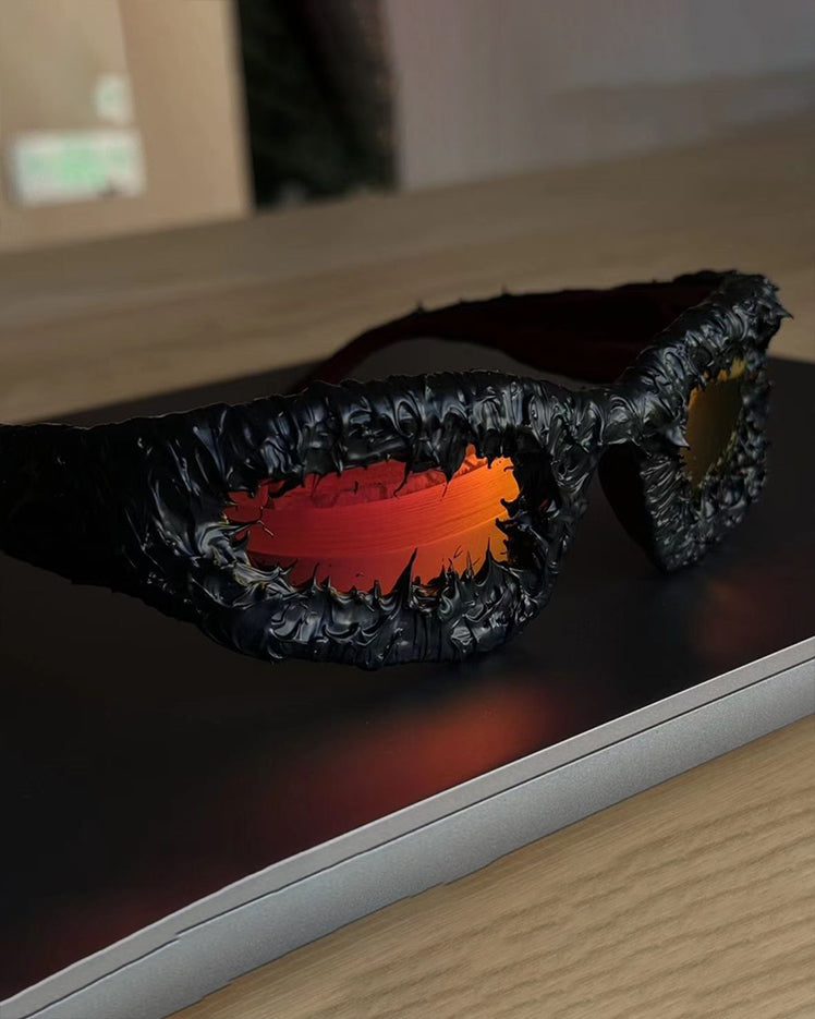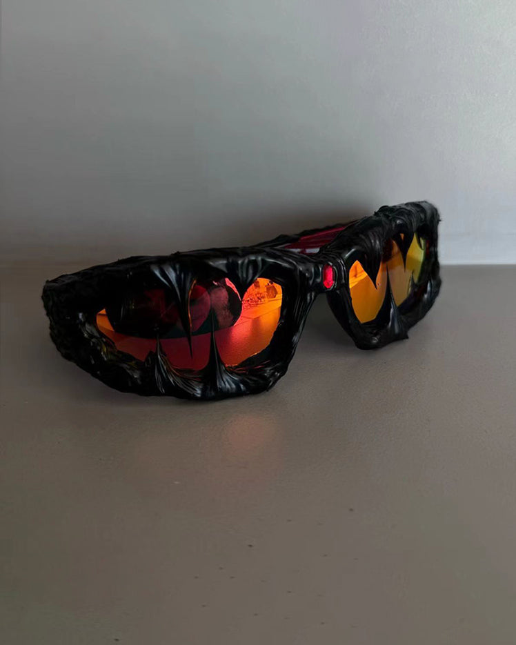 Dark glossy resin frame, bold irregular silhouette, tinted lenses, Abigo-inspired aesthetic, unisex design, edgy subcultural street vibe