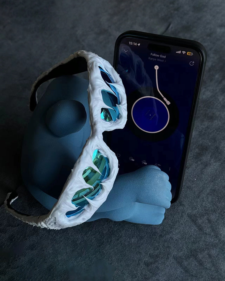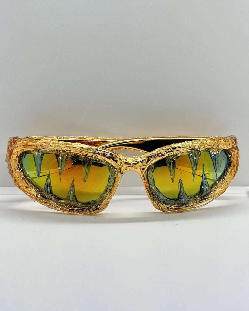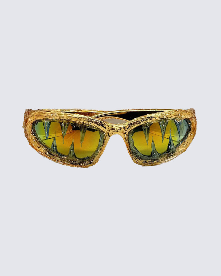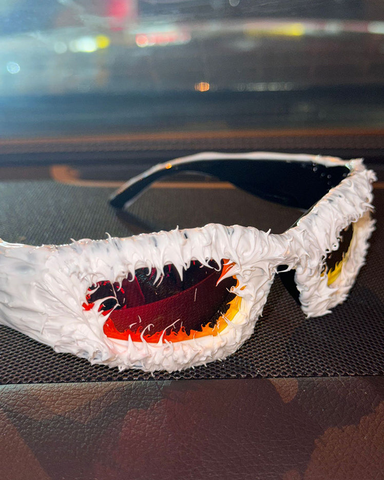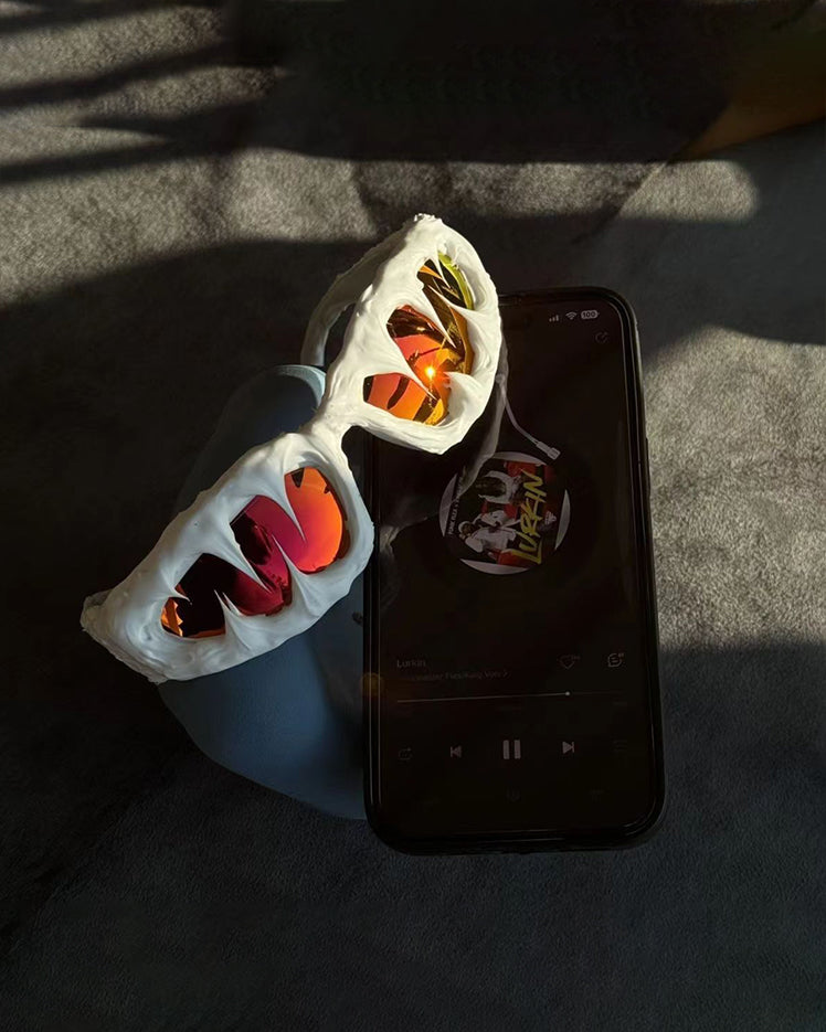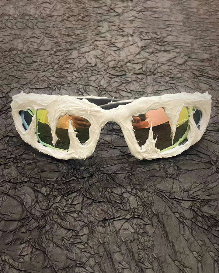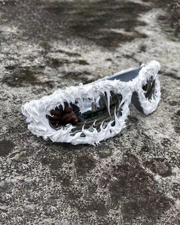 Dark glossy resin frame, bold irregular silhouette, tinted lenses, Abigo-inspired aesthetic, unisex design, edgy subcultural street vibe