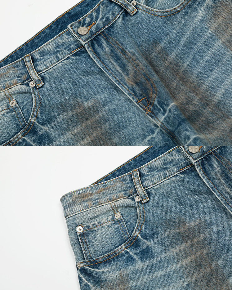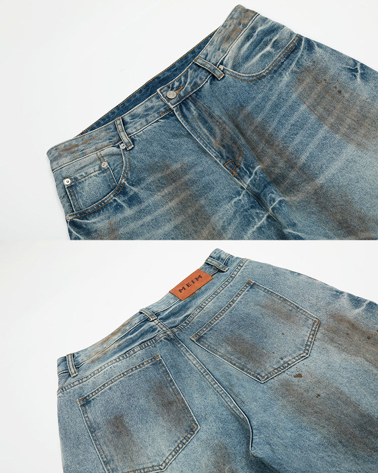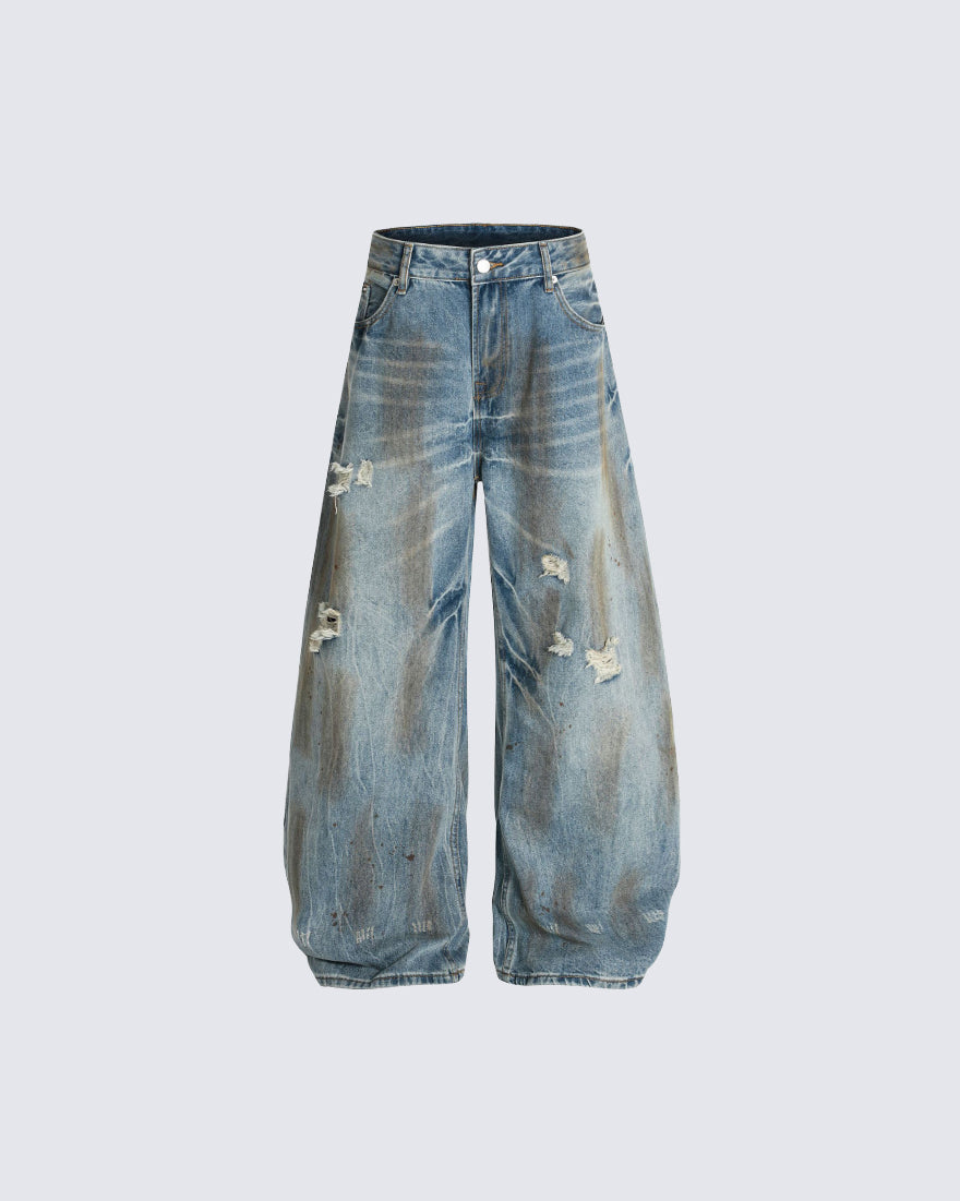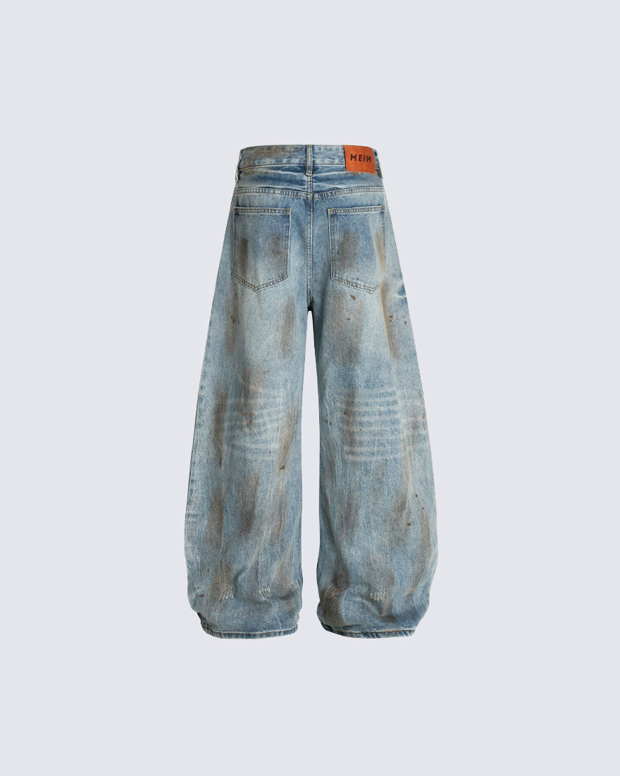 Washed and distressed finish, scimitar-cut leg design, worn texture, loose fit, edgy vintage street vibe