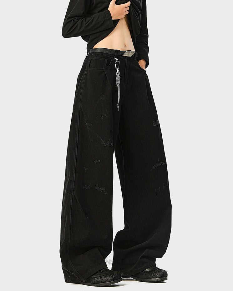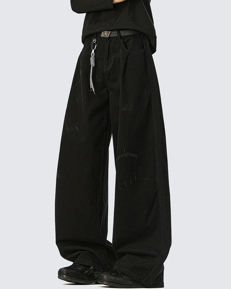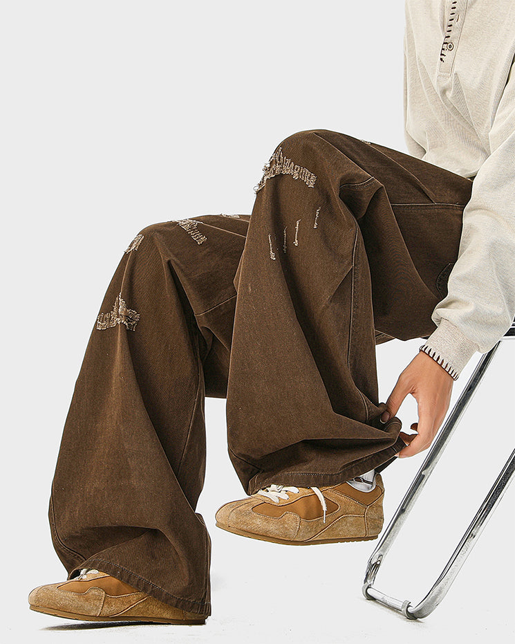 Wrinkled vintage finish, straight-leg silhouette, relaxed fit, distressed details, classic workwear style