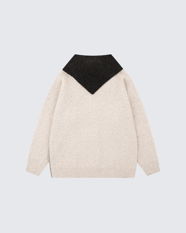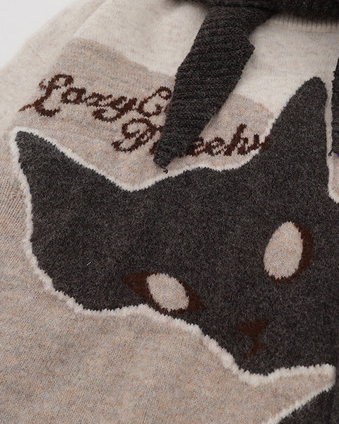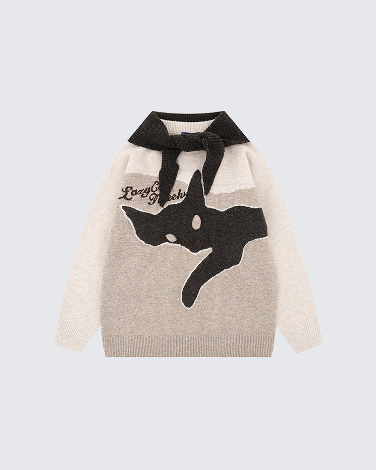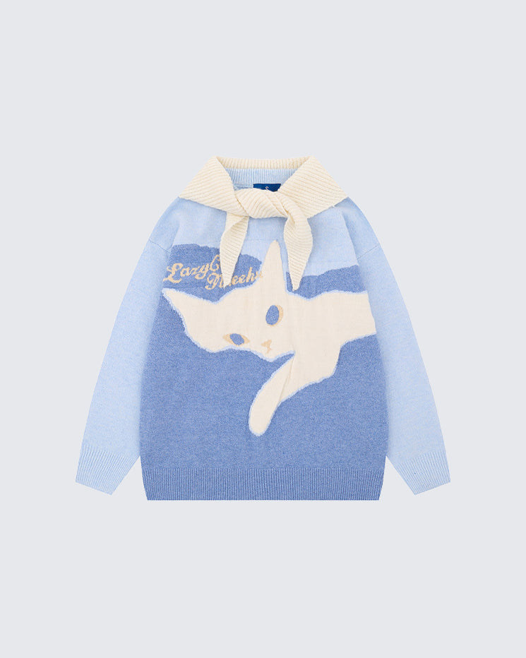 Sailor-style collar with tie detail, playful cat graphic pattern, vintage knitted texture, long sleeves, relaxed fit