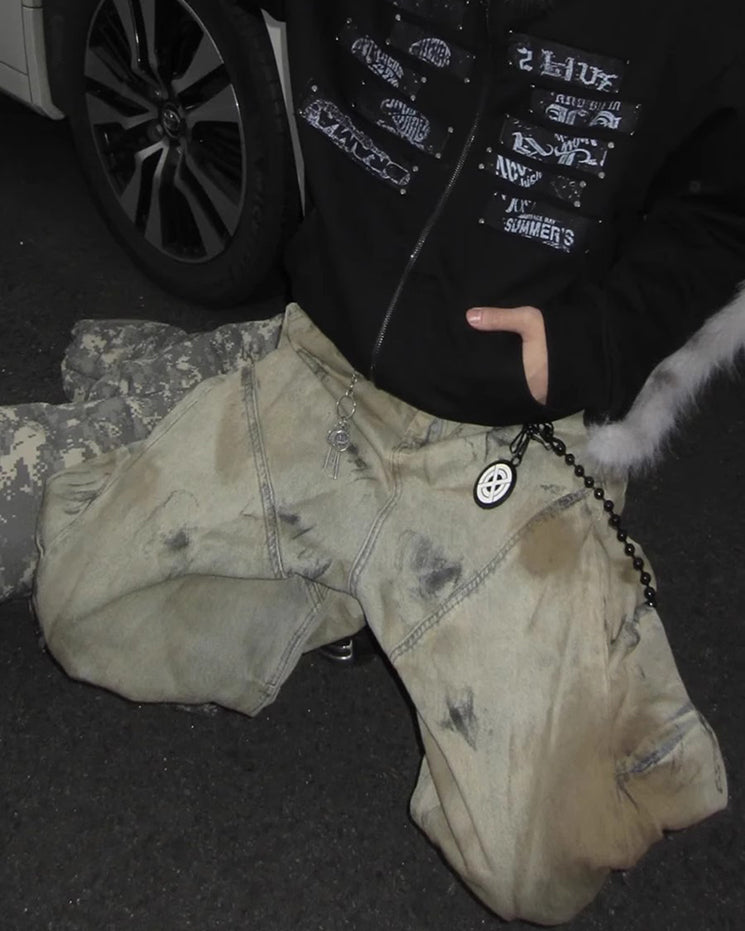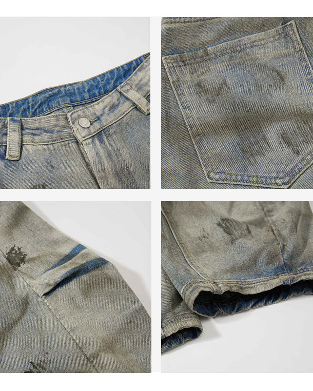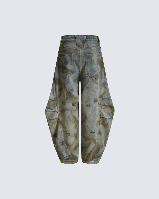 Washed effect, balloon wide-leg silhouette, 3D structural cut, distressed texture, mid-rise waist, back pockets