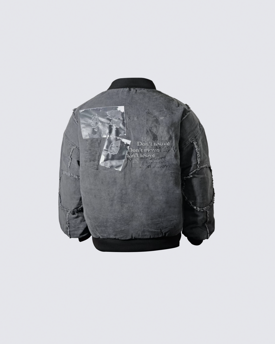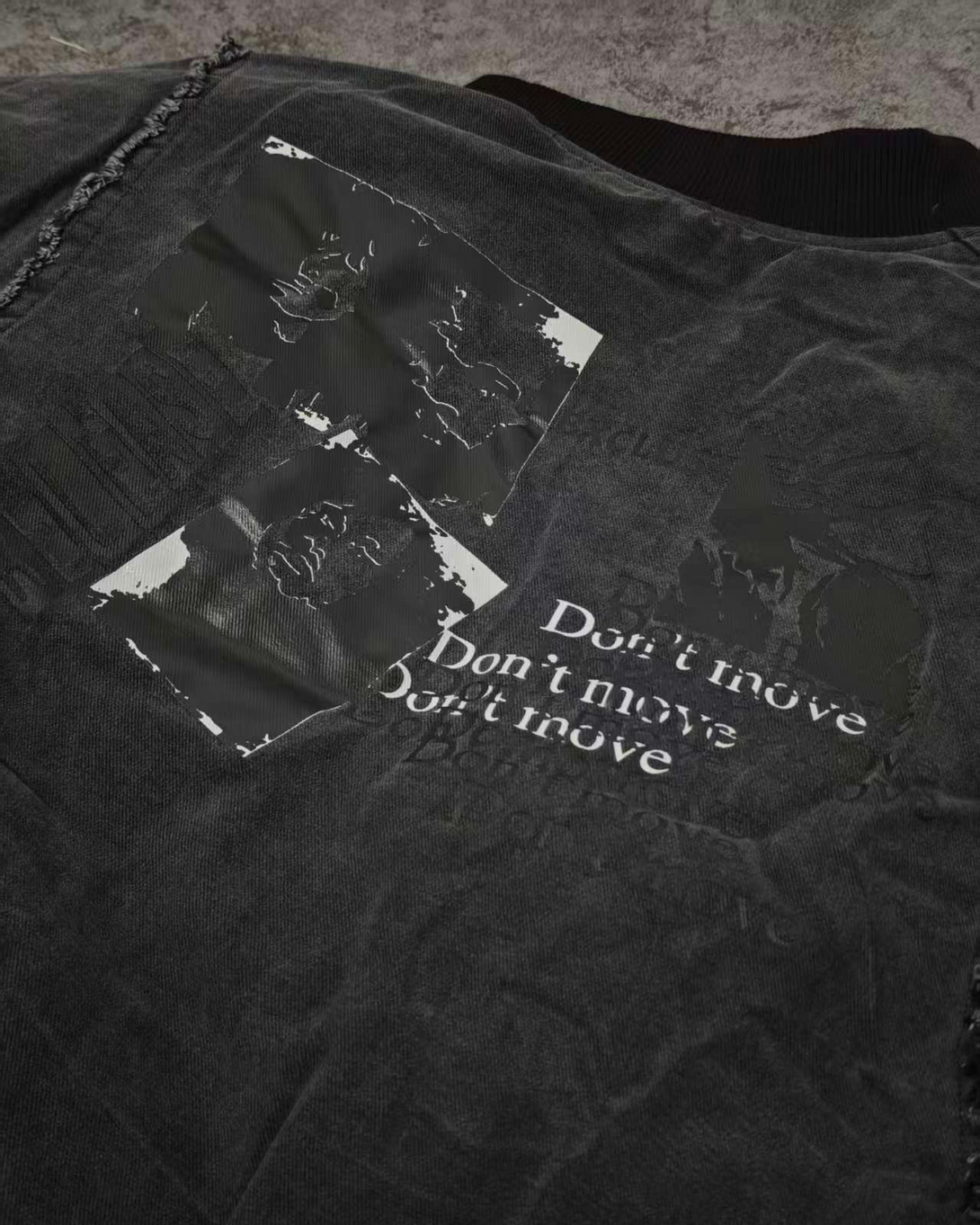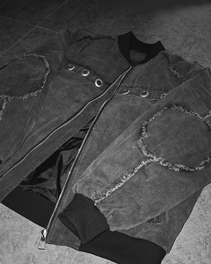 Design Elements: Vintage washed texture, metal eyelet band detail, asymmetric patchwork seams, frayed distressed edges, artistic printed back graphic, rib-knit collar & hem, oversized silhouette