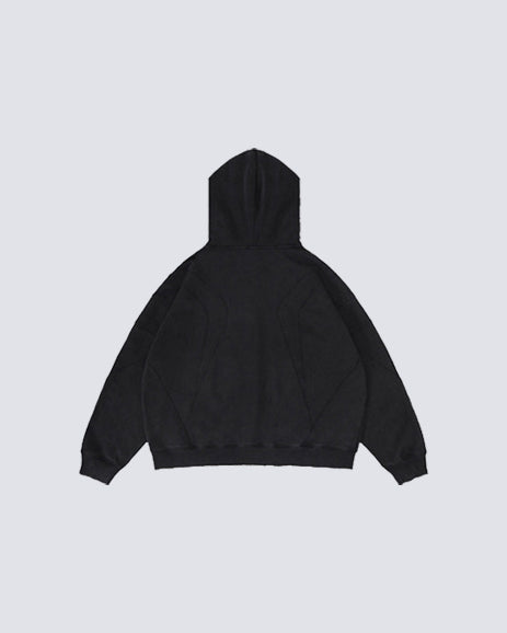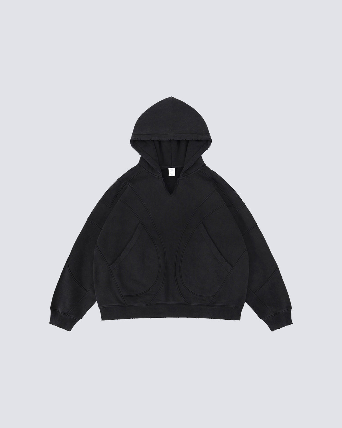 Design Elements: Oversized silhouette, panel seam details, fleece-lined interior, kangaroo pocket, ribbed cuffs and hem, minimalist hooded style