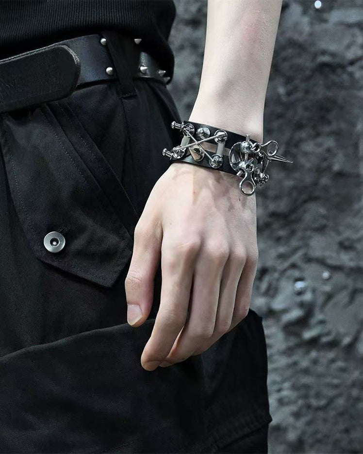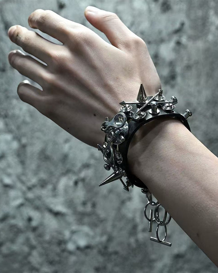 Metal stud embellishments, PU leather strap, adjustable buckle closure, dark subcultural aesthetic, edgy punk style, unisex fashion accessory