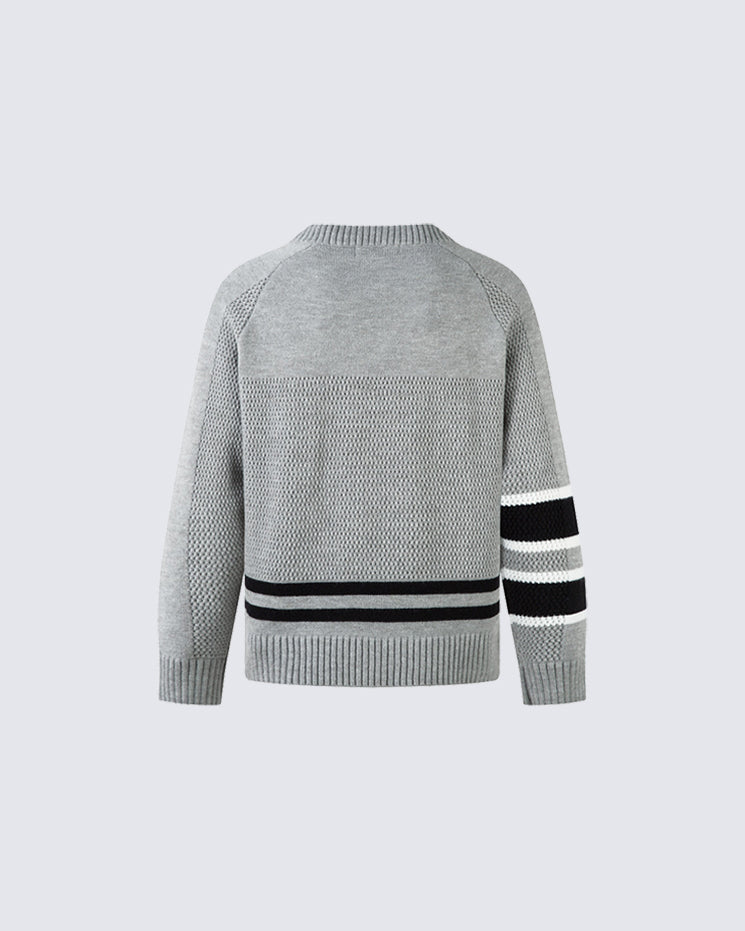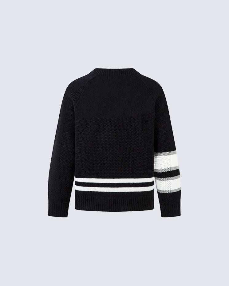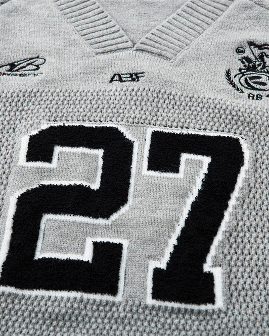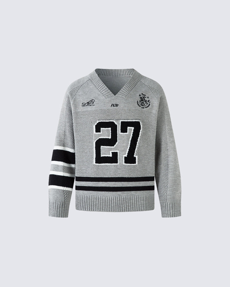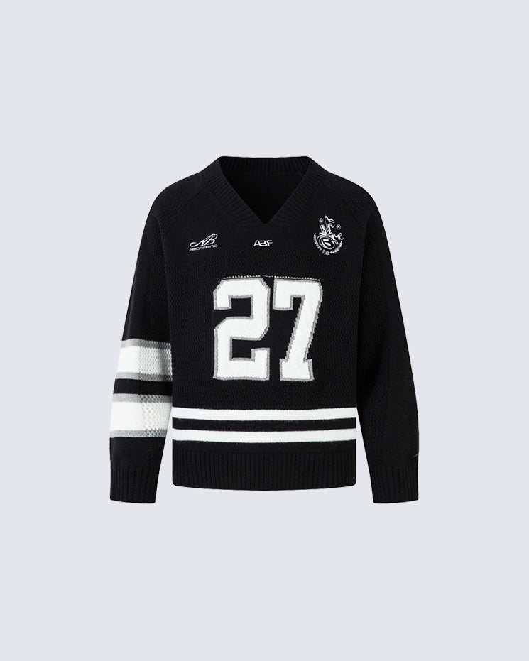 V-neck design, large front number graphic, contrast stripe detailing on sleeves and hem, ribbed cuffs and waistband, relaxed fit, sporty vintage aesthetic