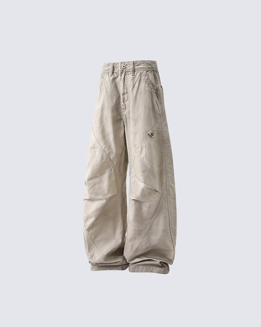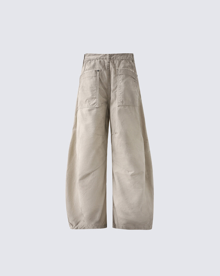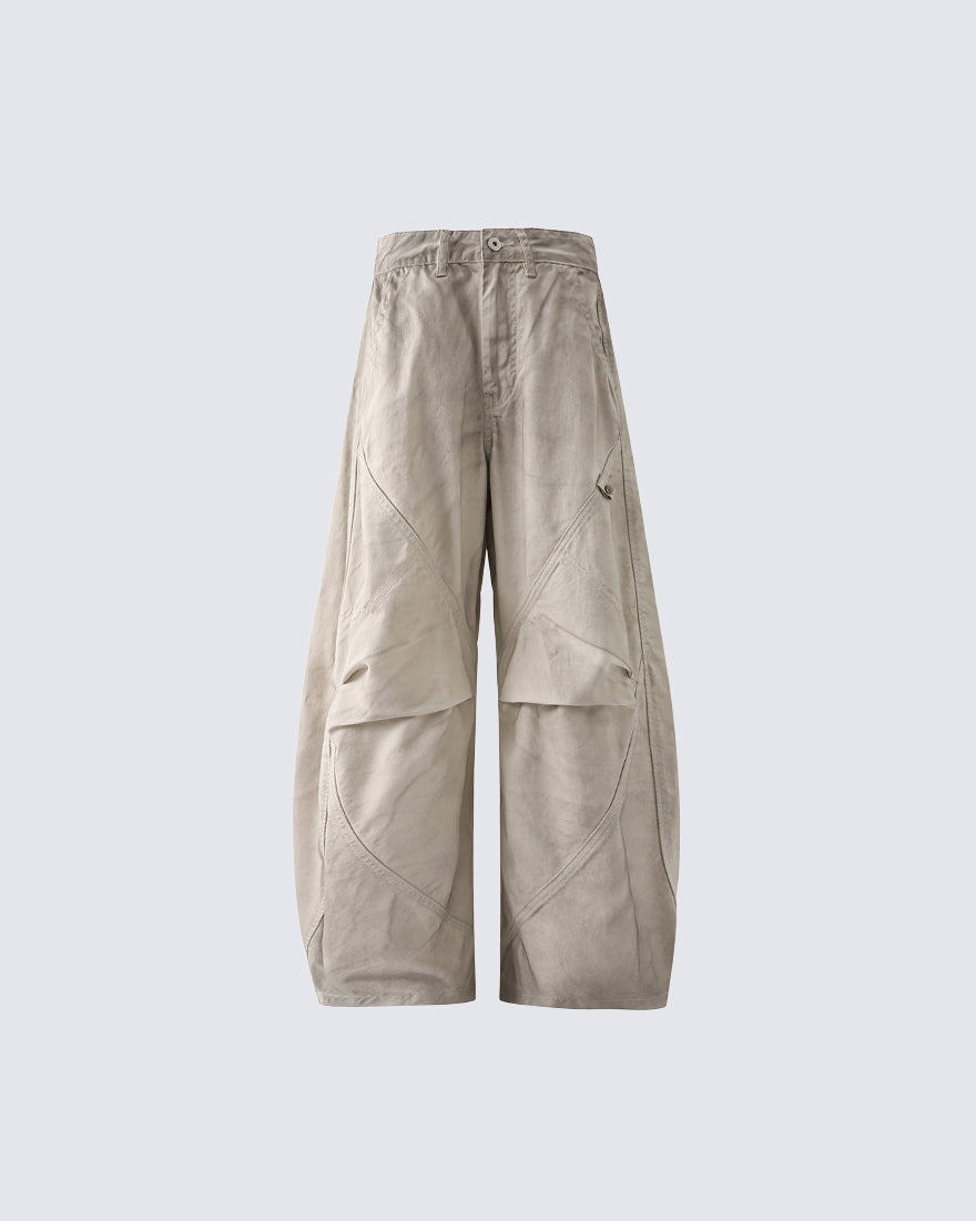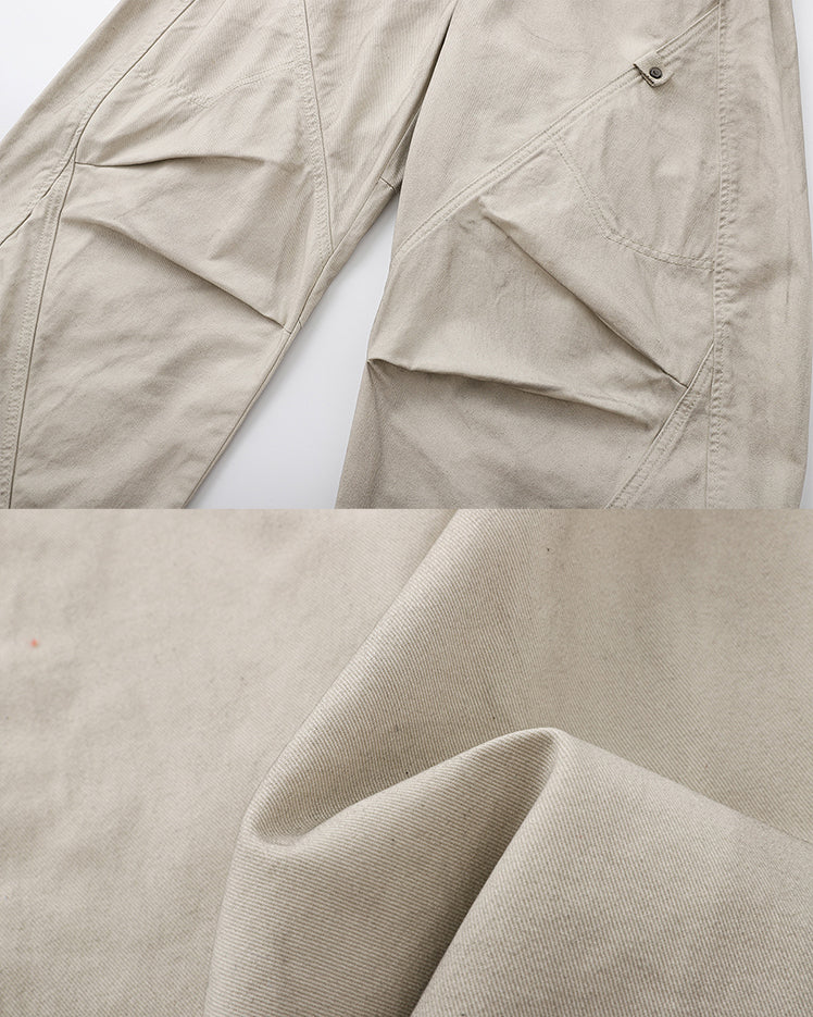 Distressed wash finish, intentional wrinkle texture, deconstructed panel design, scimitar-style curved leg cut, loose wide-leg silhouette, raw-edge detailing, vintage-inspired street aesthetic