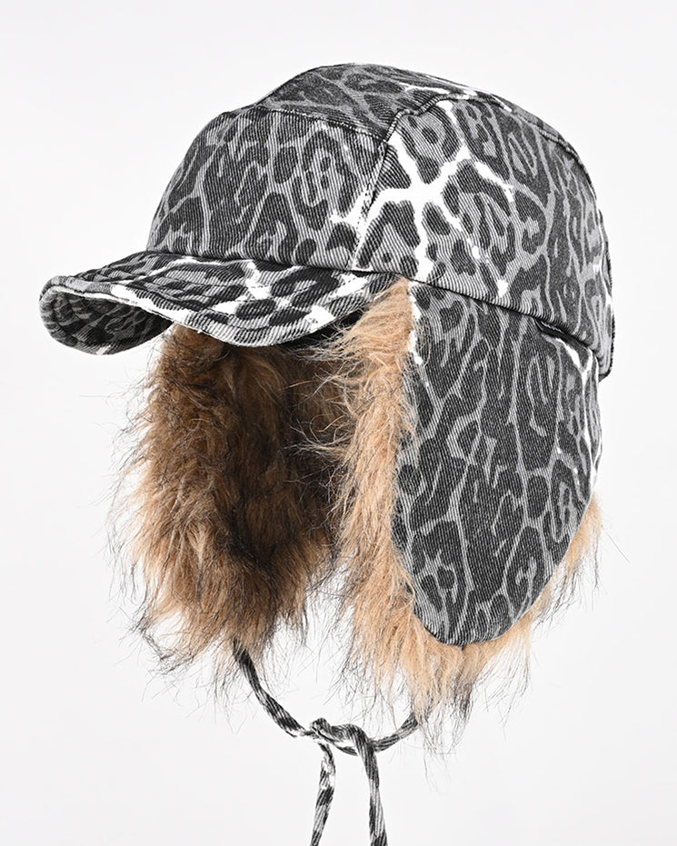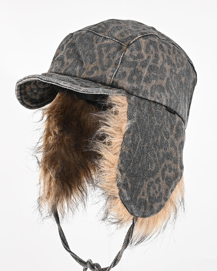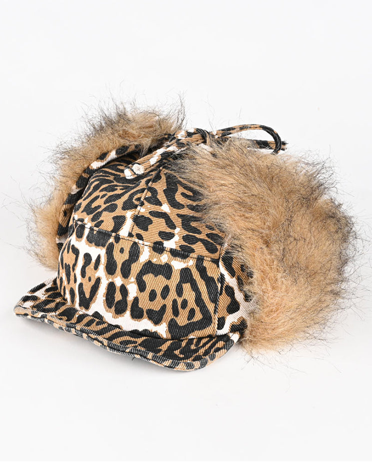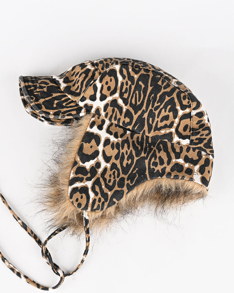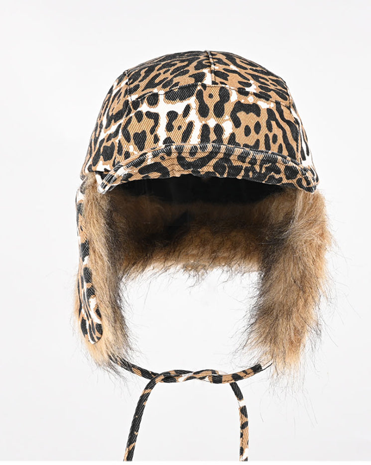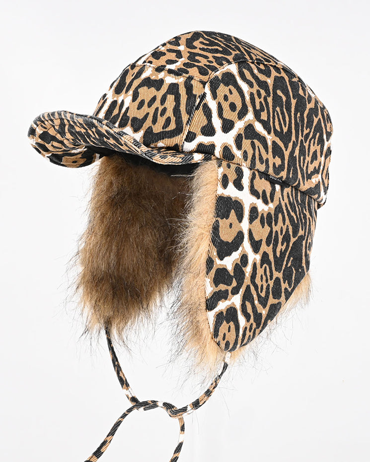 Leopard print pattern, faux fur earflaps, curved brim design, tie-up straps, warm plush lining, stylish American retro vibe