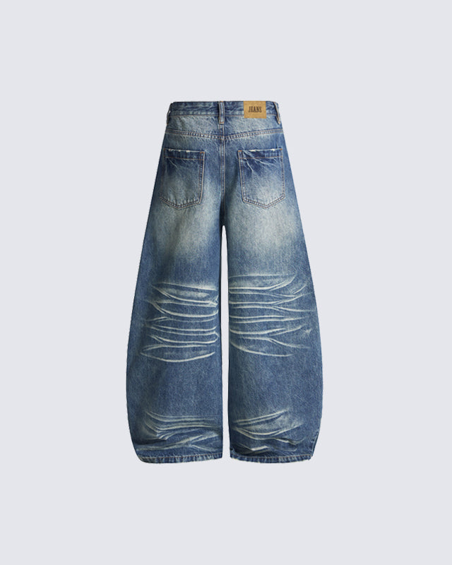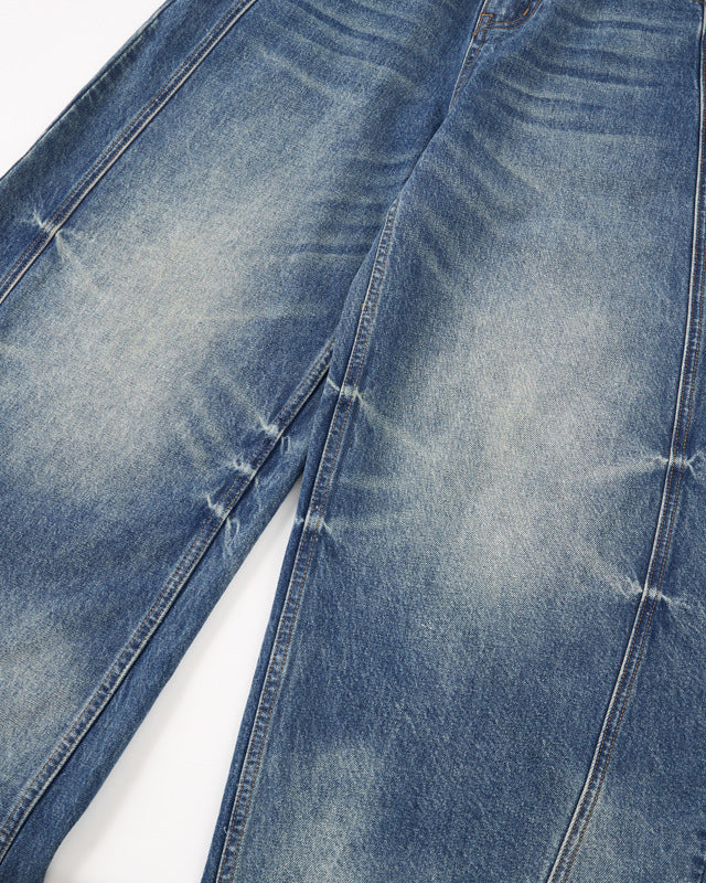 Design Elements: Curved “blade-cut” seams, exaggerated wide-leg silhouette, vintage wash, creased whisker fading, structured denim texture, back pocket detailing, mid-rise waist
