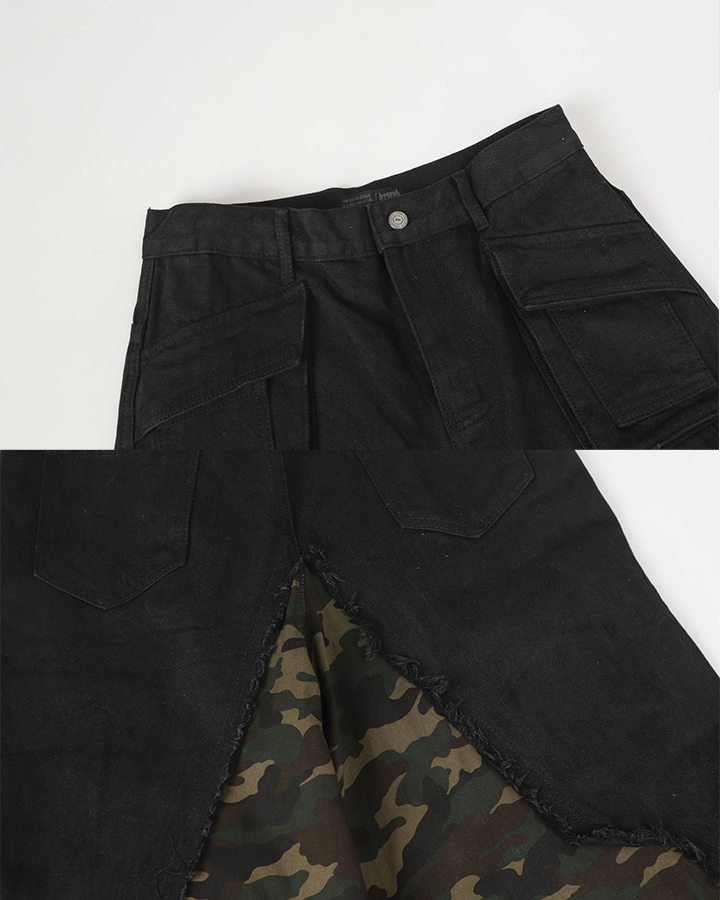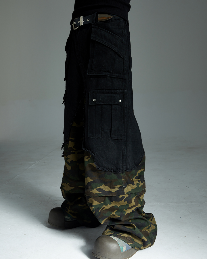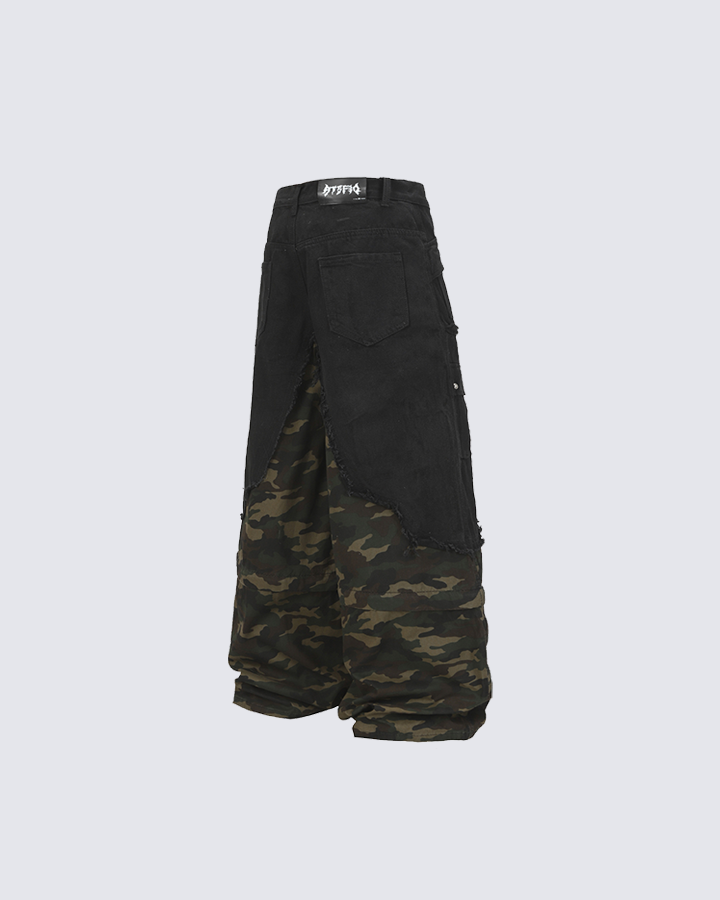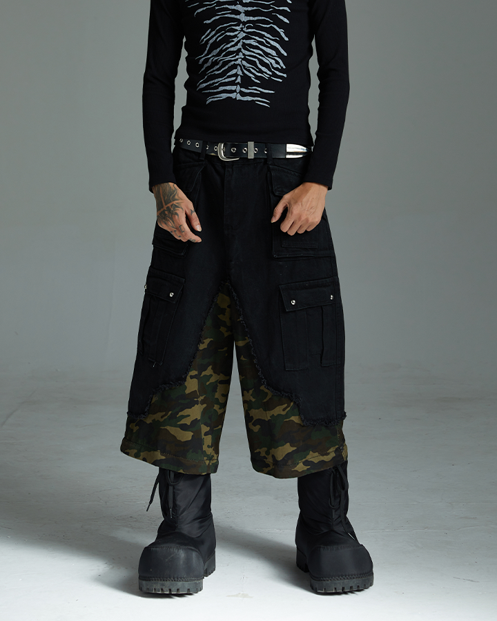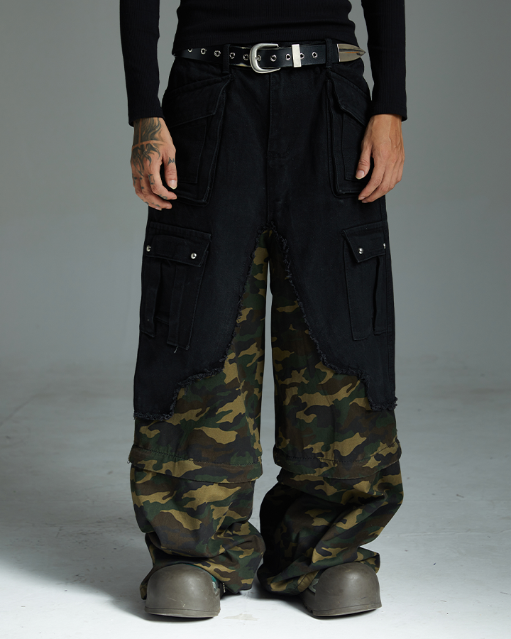Design Elements: These pants combine a sleek black denim top with a camo print lower half, offering a unique, distressed cargo design. With large pockets and frayed edges, the pants are both functional and edgy, making them perfect for streetwear or casual outfits with a bold statement.