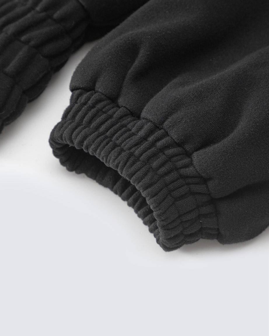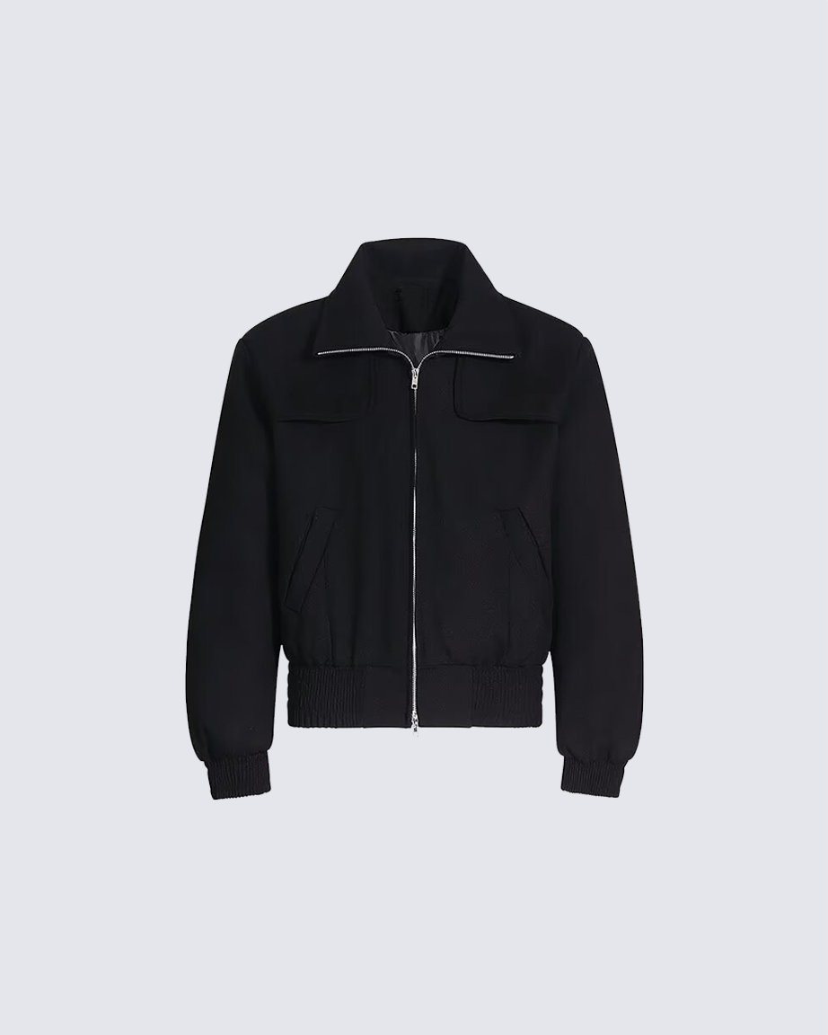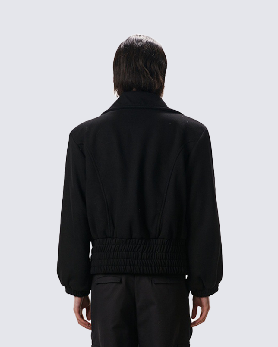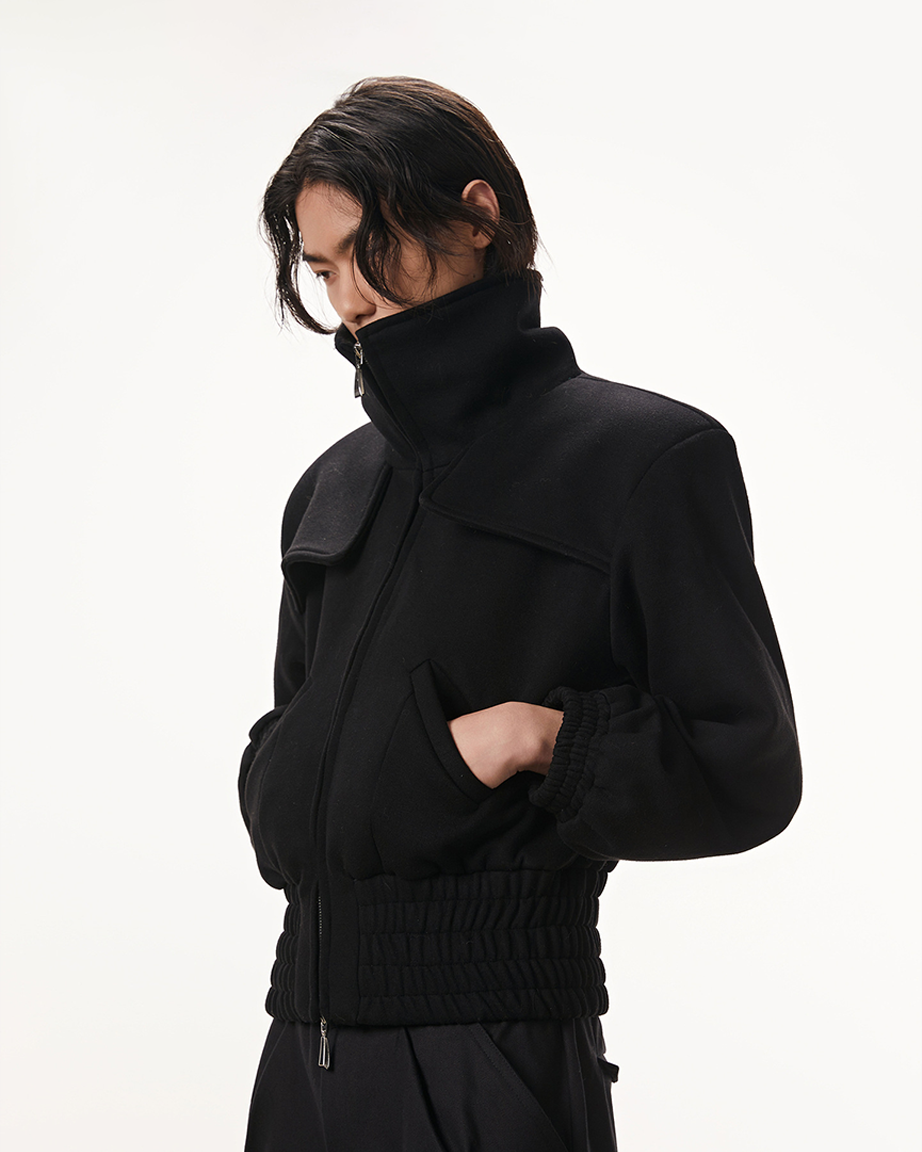 Design Elements: Structured collar design, front zip closure, angled flap pockets, elastic smocked waistband, elastic cuffs