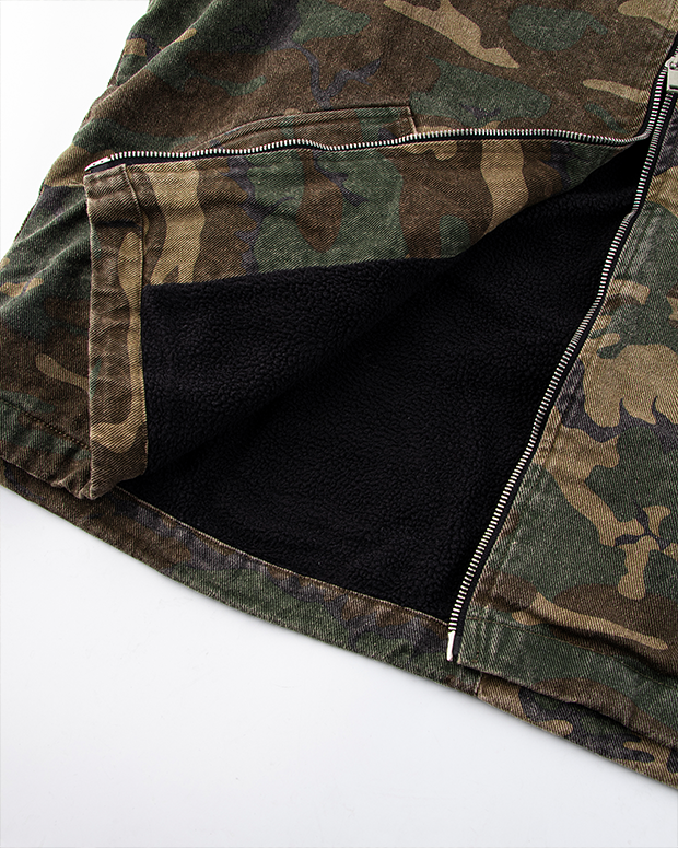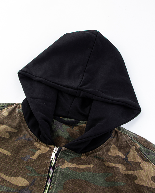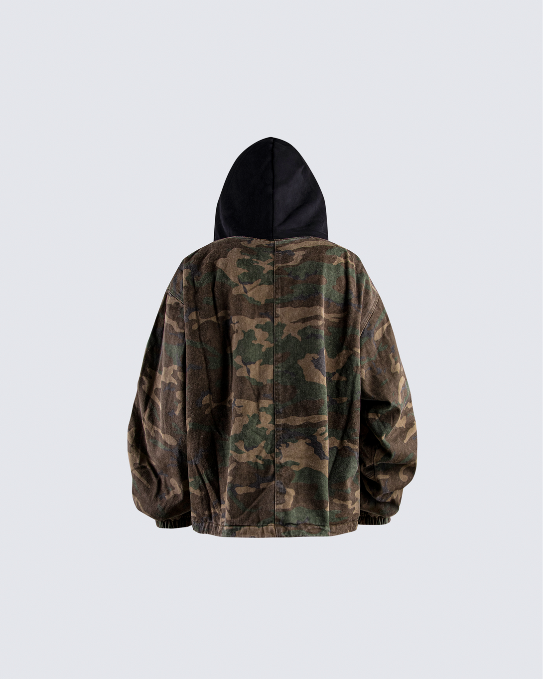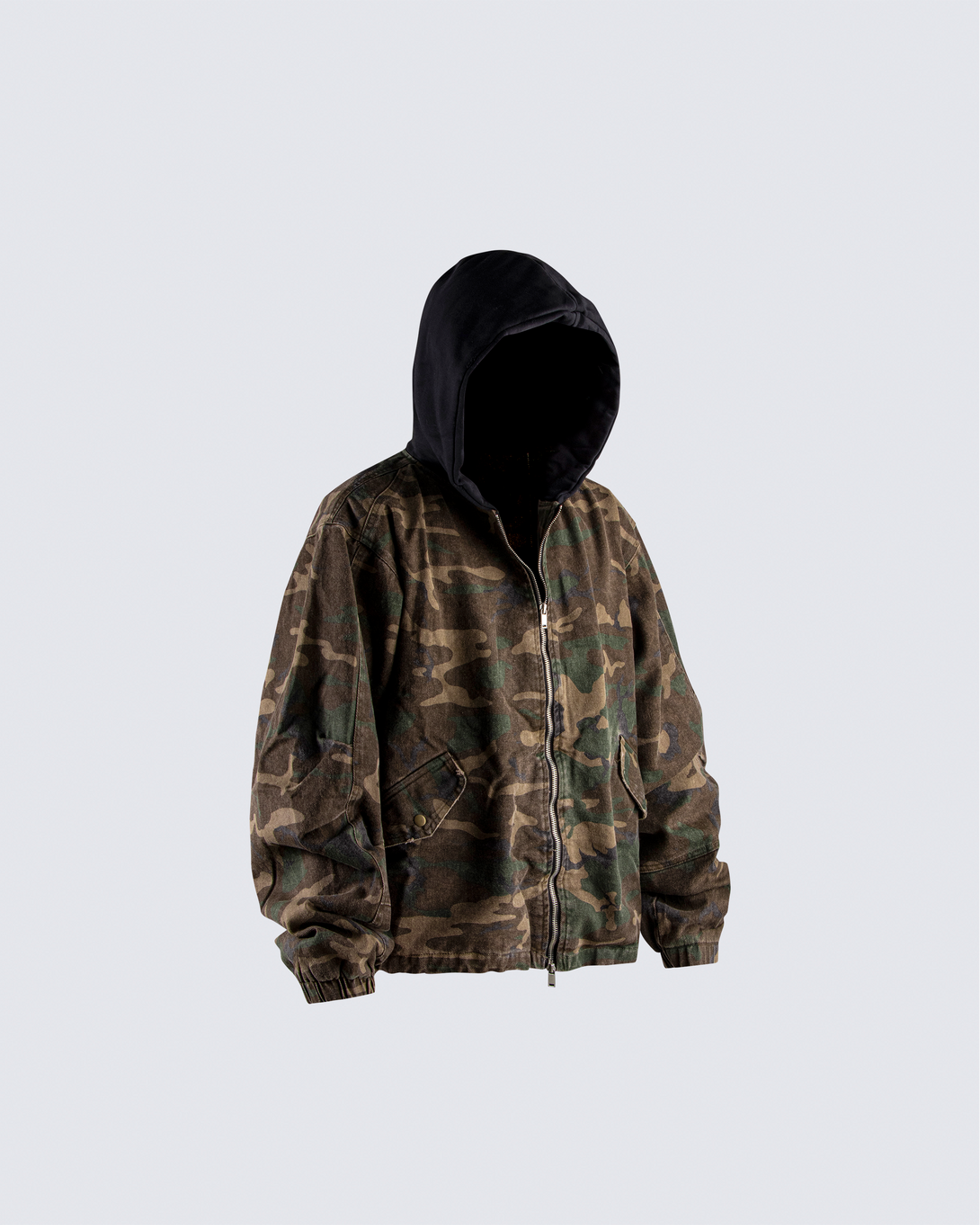 Design Elements: Classic camouflage pattern, contrast black hood, front zip closure, oversized silhouette, flap pockets, elastic cuffs, fleece-lined interior