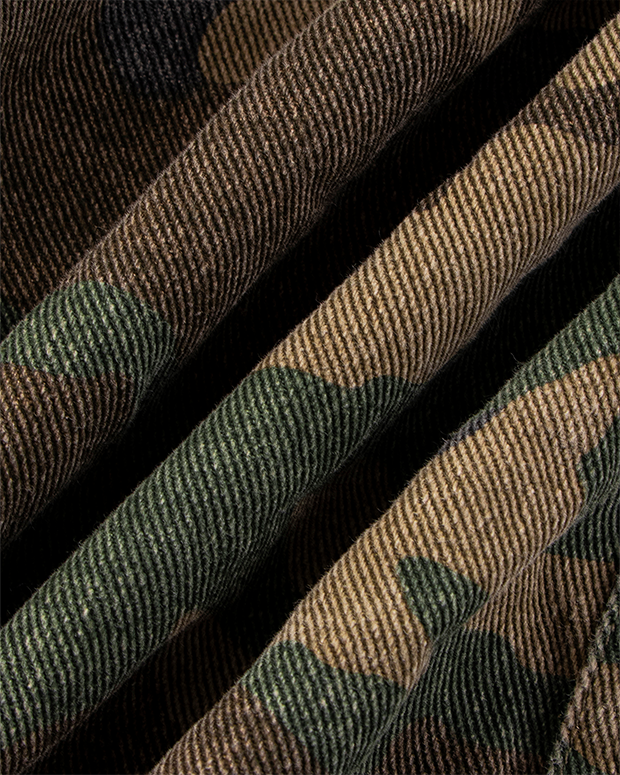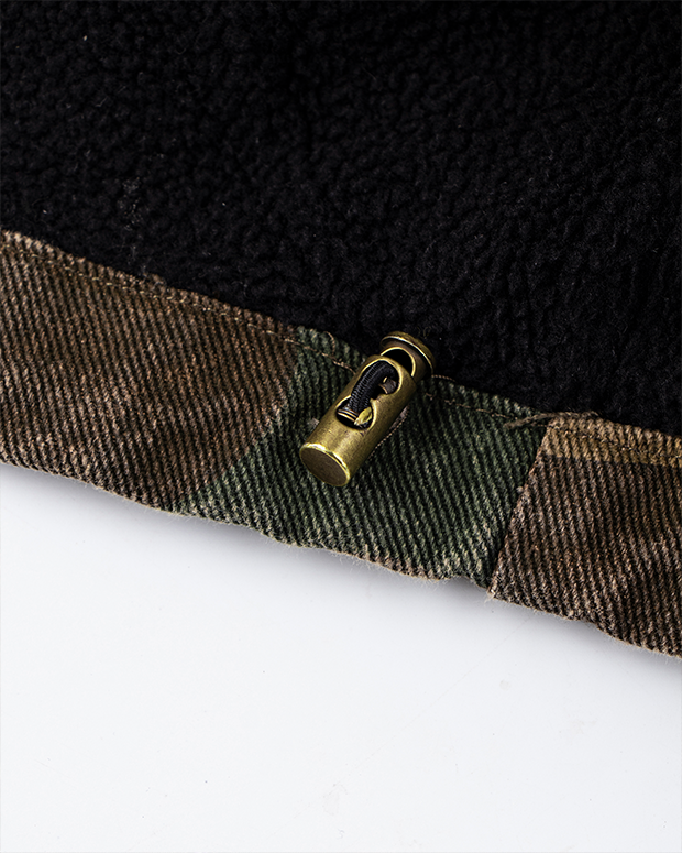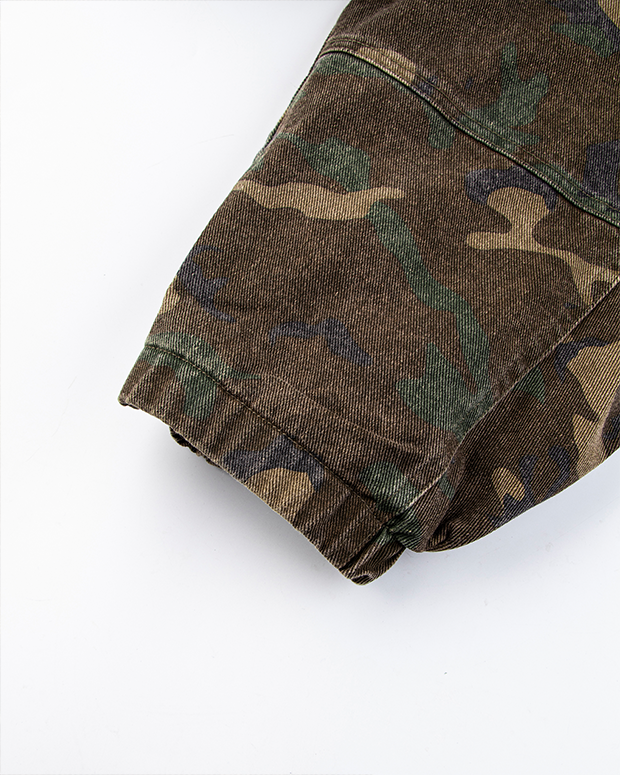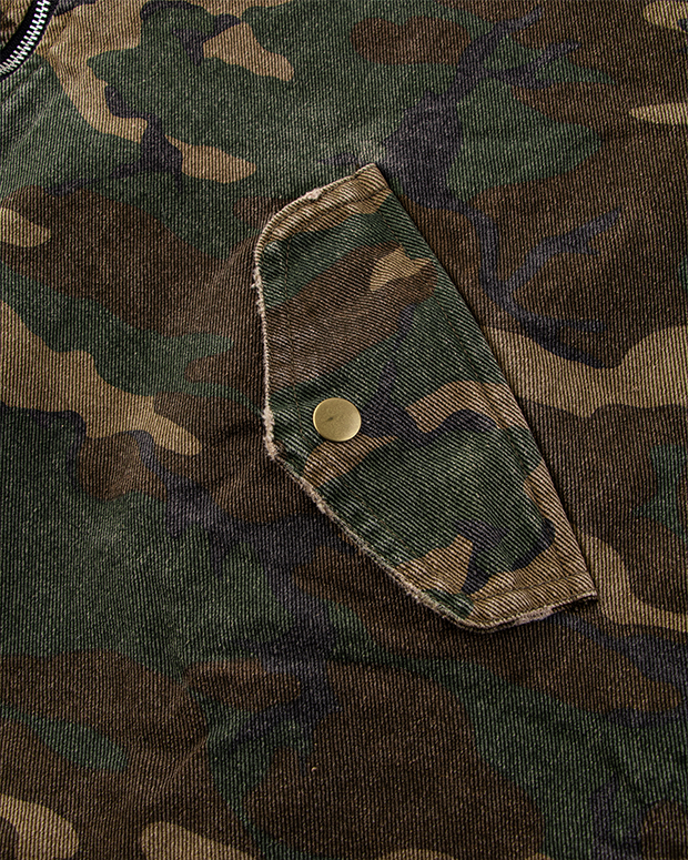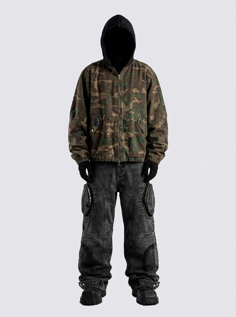 Design Elements: Classic camouflage pattern, contrast black hood, front zip closure, oversized silhouette, flap pockets, elastic cuffs, fleece-lined interior