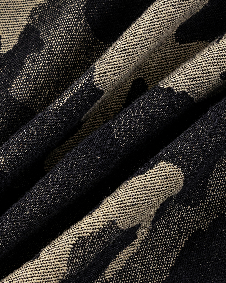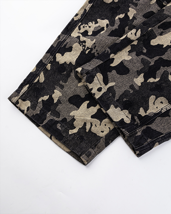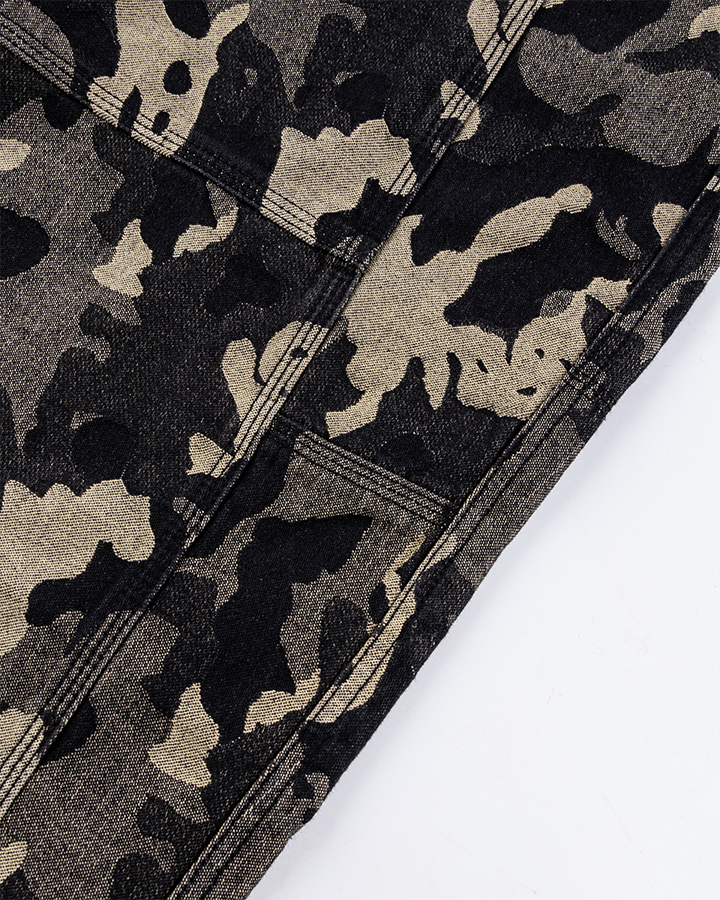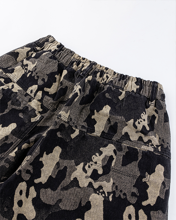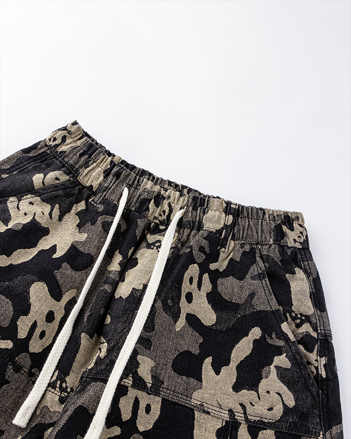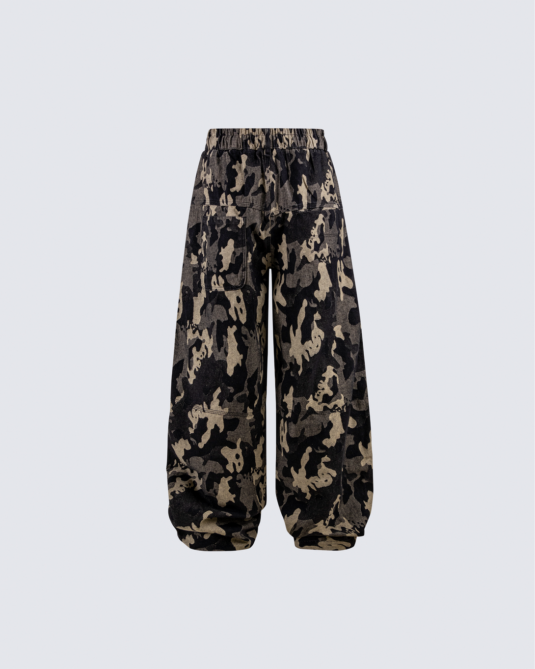 Design Elements: Camouflage print, wide-leg silhouette, drawstring waist, elastic waistband, stacked-leg effect