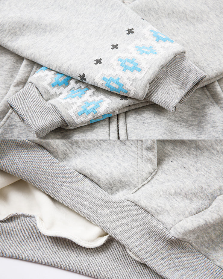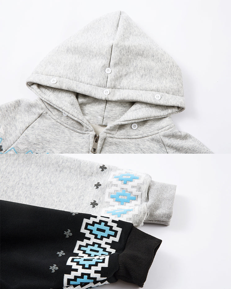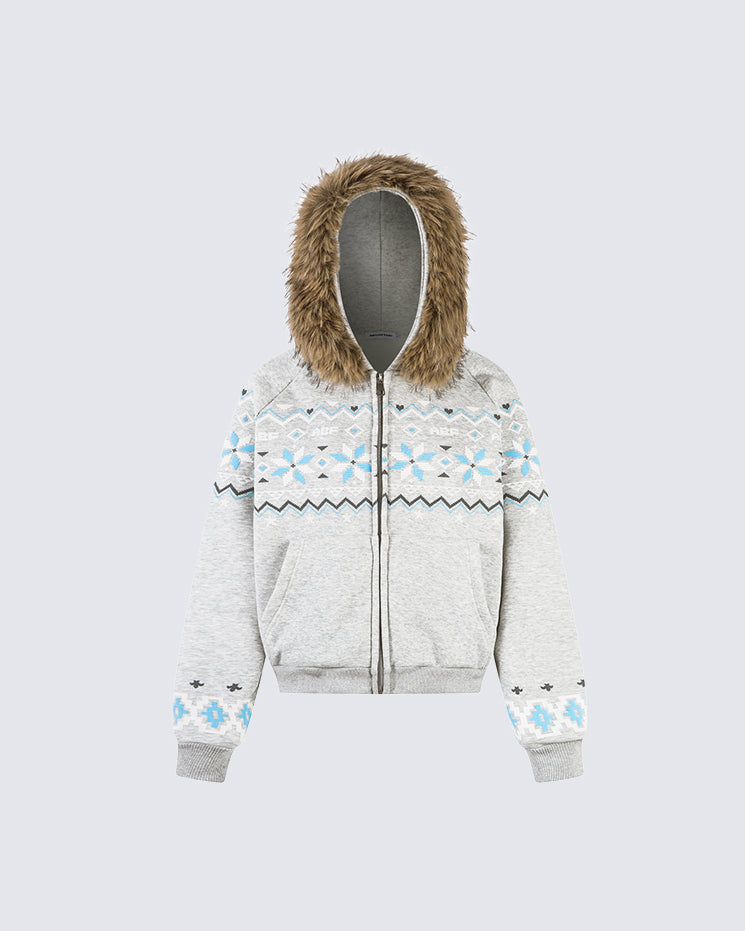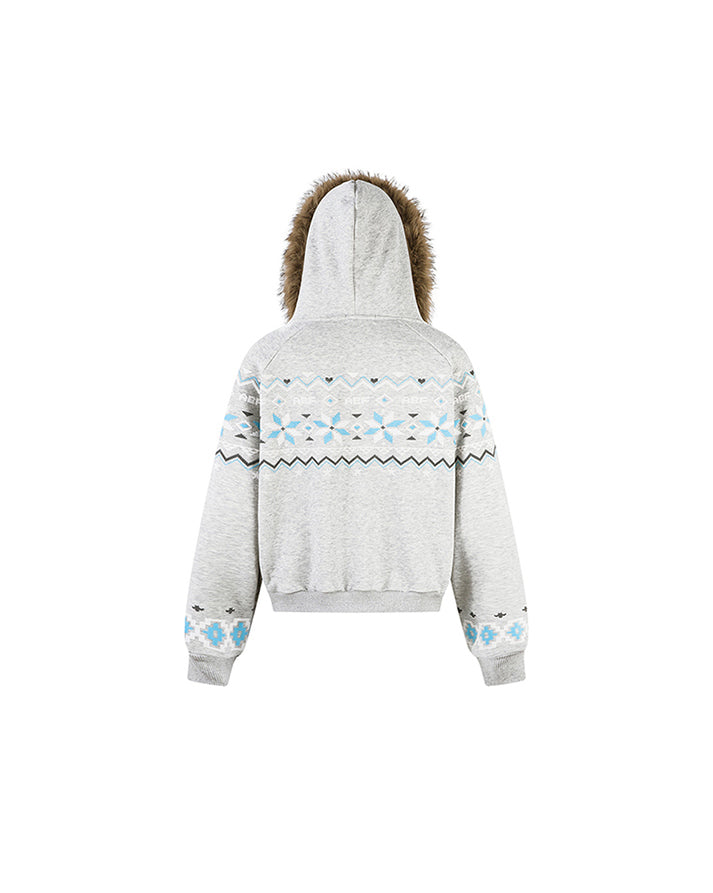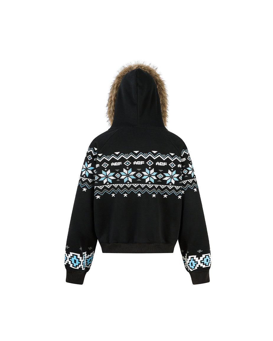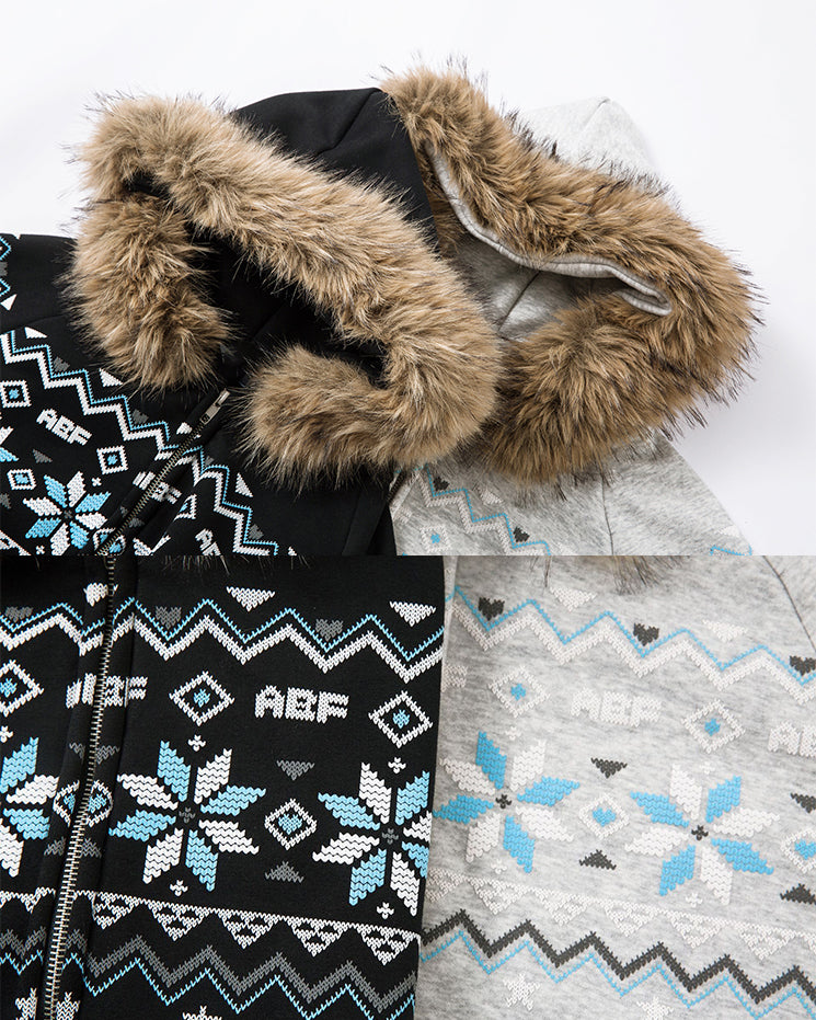Christmas snowflake pattern, furry hood, ribbed cuffs, zip-up design, kangaroo pockets