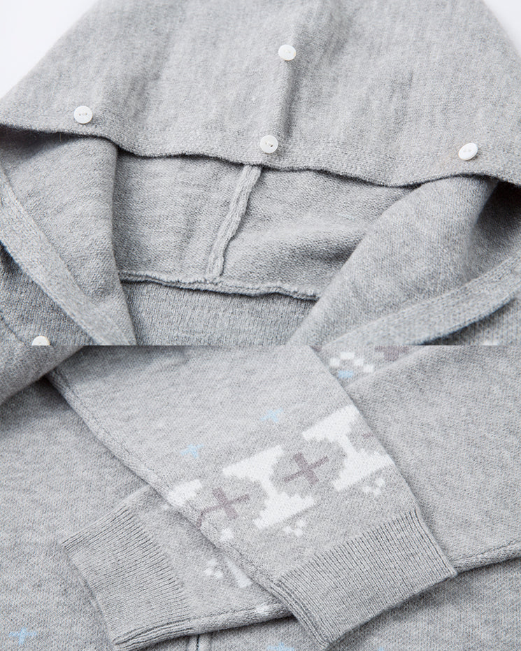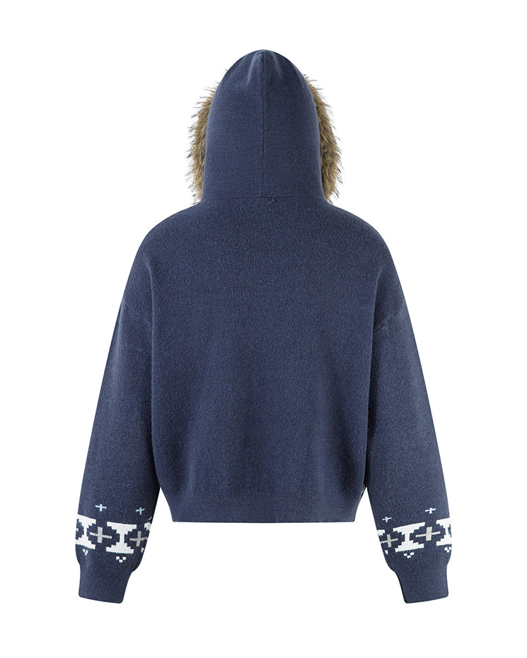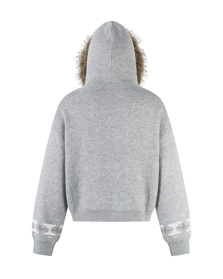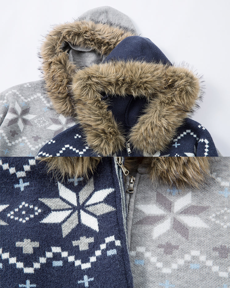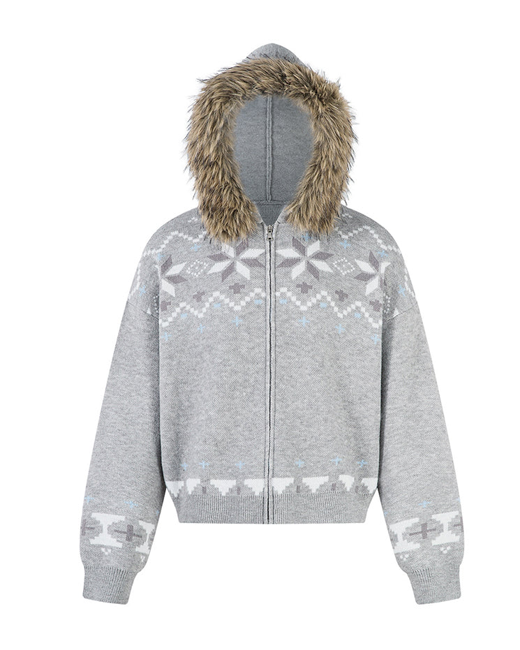 Christmas pattern knit design, faux-fur hood trim, zip-up front, ribbed cuffs and hem, warm winter aesthetic